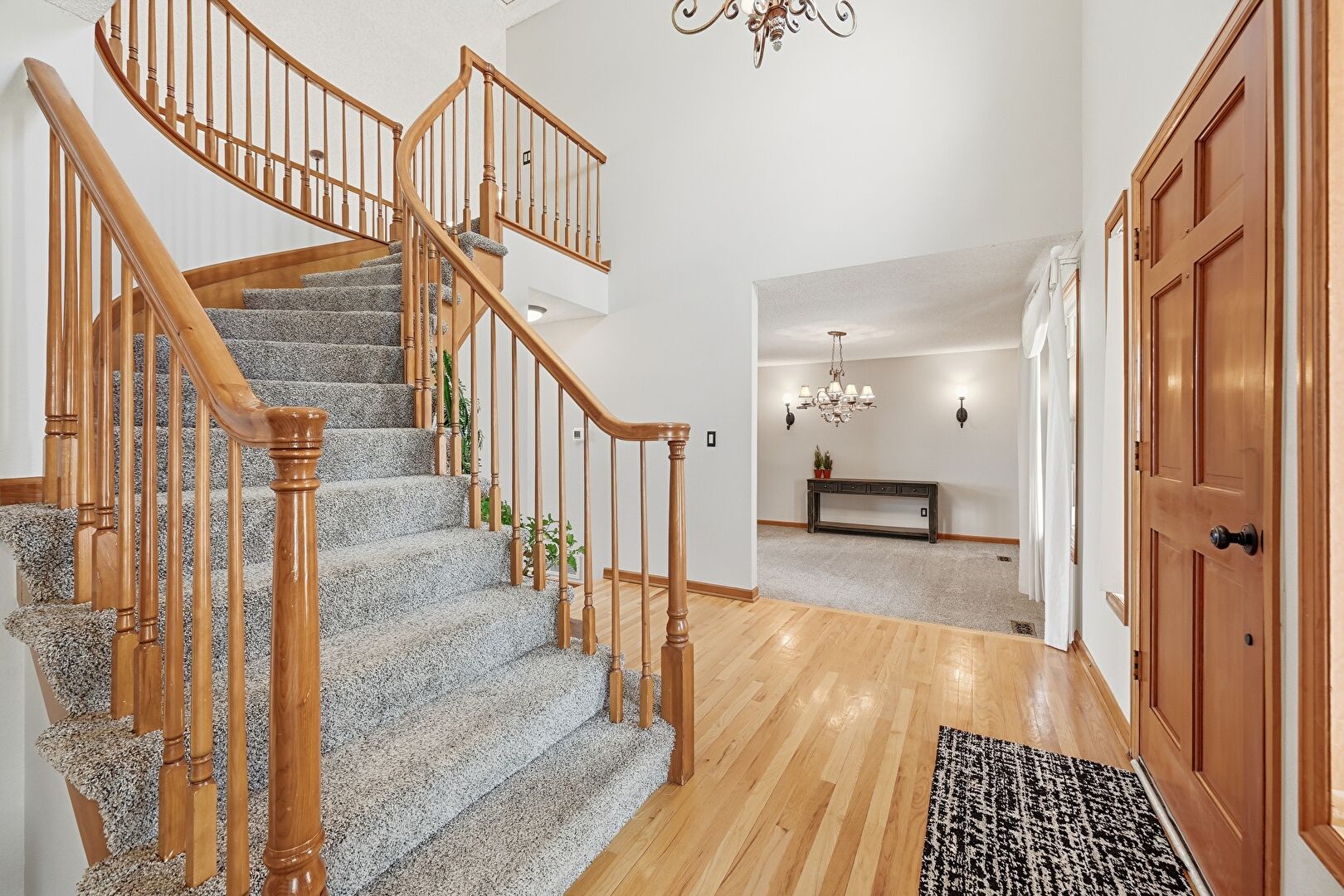 Baseboards Wall, Crown Molding, Drywall, High Ceiling, Notable Chandelier, Stairs, Wood Finish Floor, Baseboards Wall, Recessed Lighting