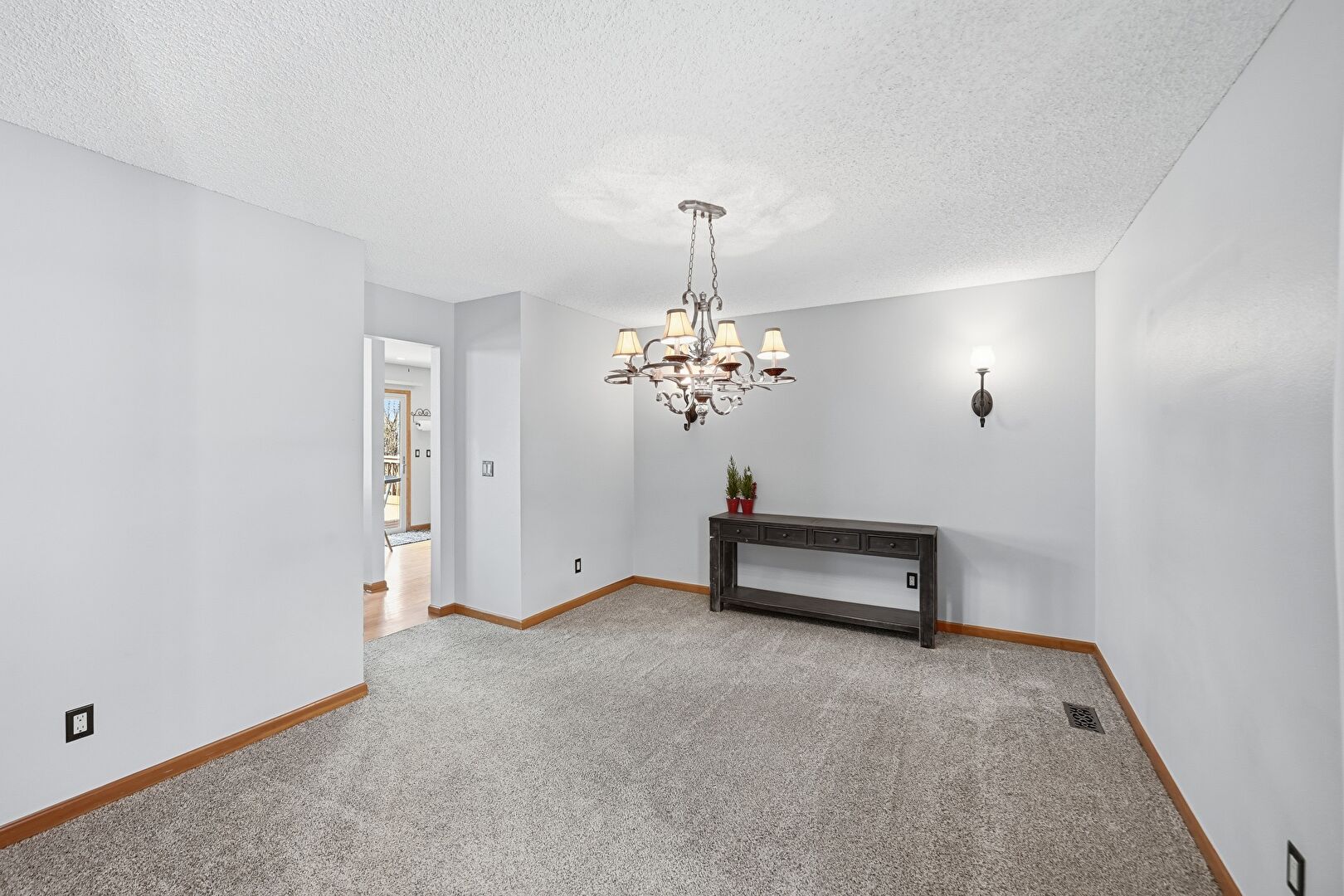 Baseboards Wall, Drywall, Notable Chandelier, Textured Ceiling, Vent, Carpet