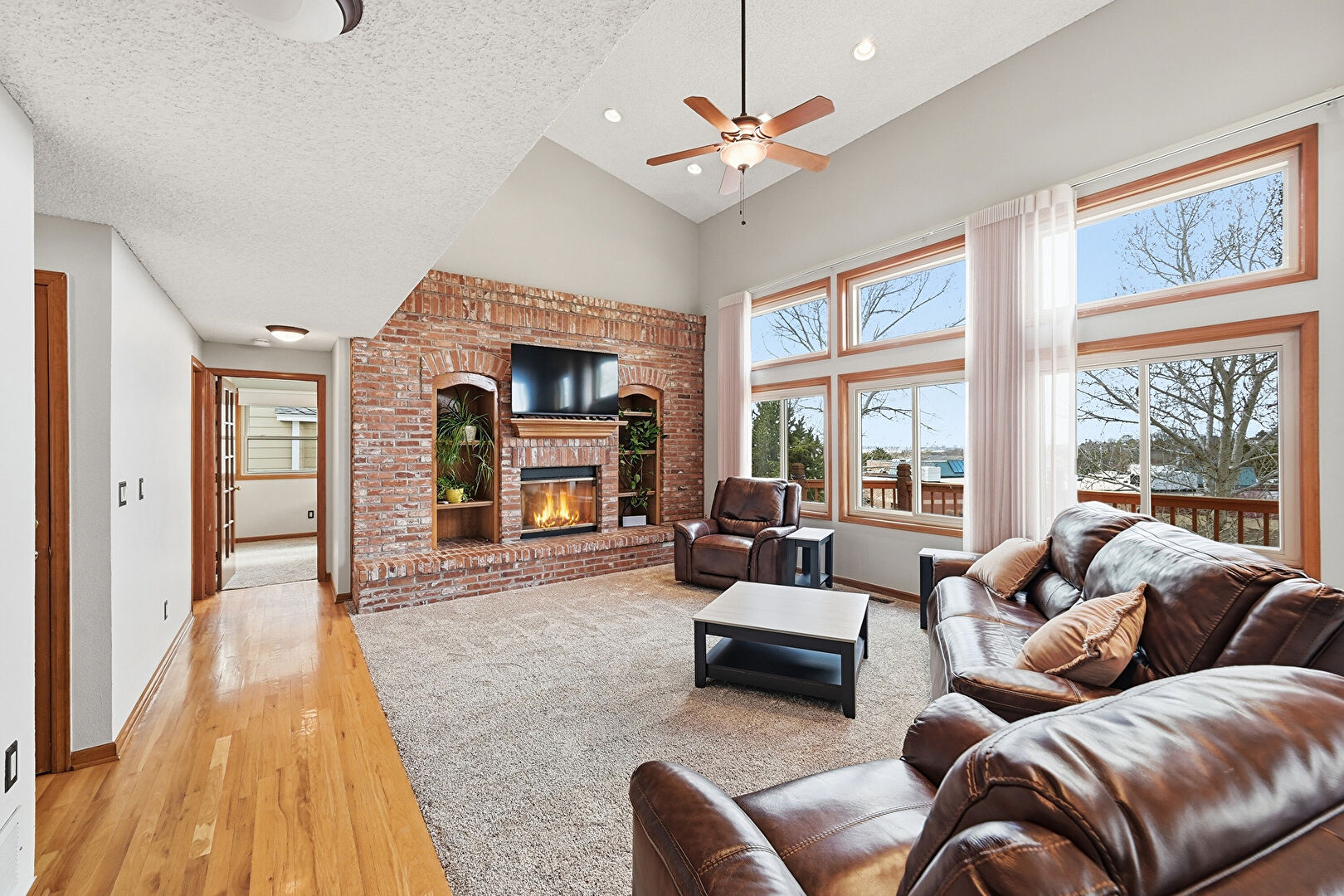 Baseboards Wall, Carpet, Ceiling Fan, Drywall, Fireplace, High Ceiling, Natural Light, Recessed Lighting, Textured Ceiling, Vent, Wood Finish Floor, Carpet, Residential View, Vaulted Ceiling, Wood Finish Floor