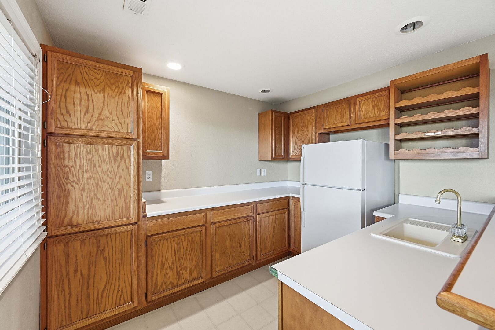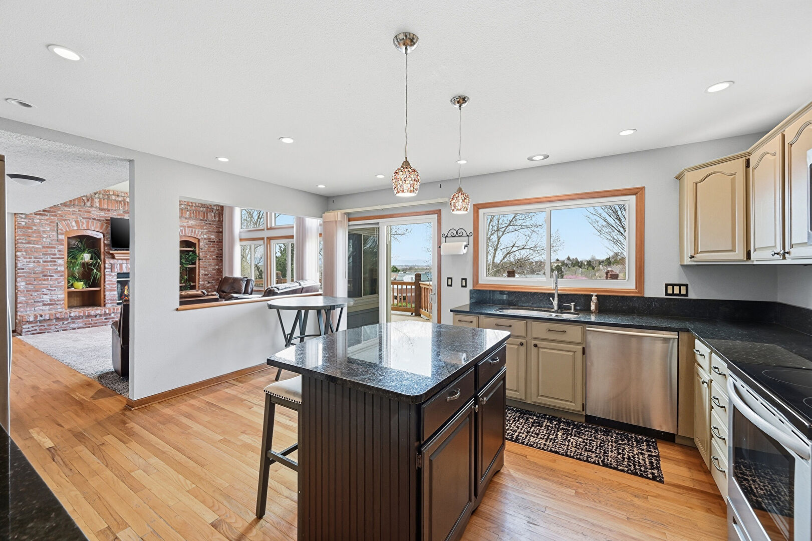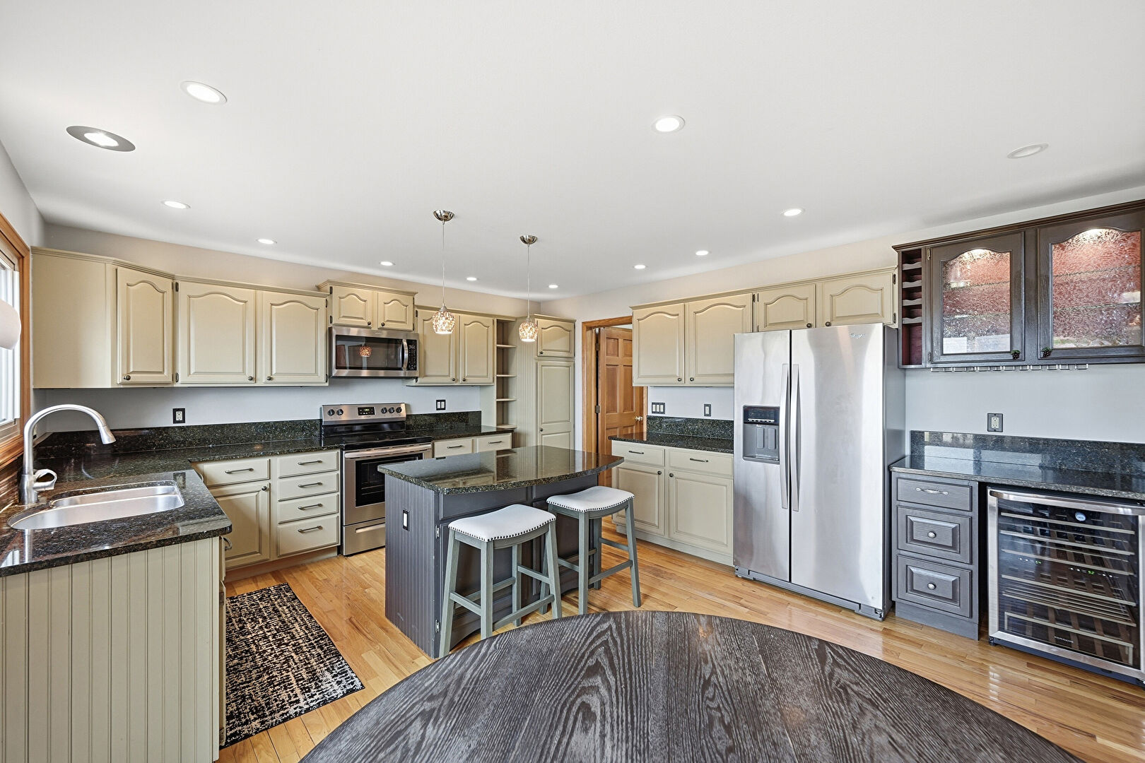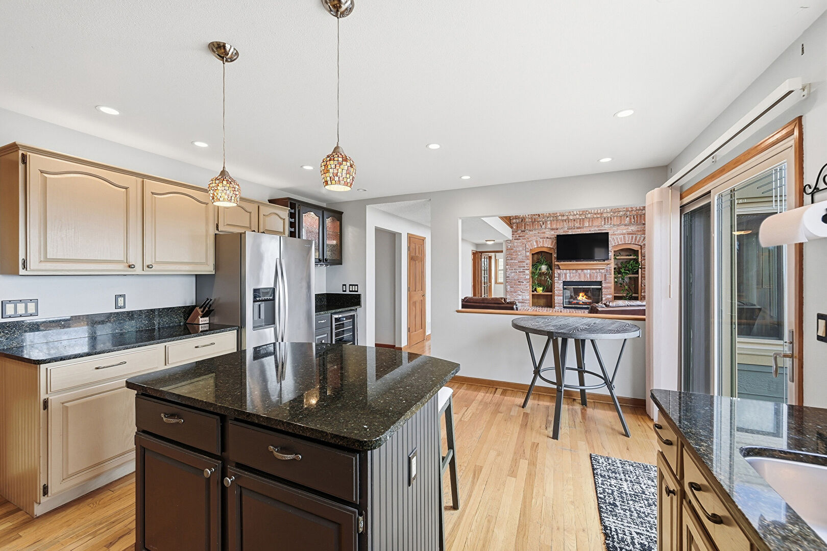 Arched Cabinets, Baseboards Wall, Carpet, Cream Cabinets, Crown Molding Cabinets, Dark Brown Cabinets, Drywall, Fireplace, Glass Insert Cabinets, Gray Cabinets, Kitchen Bar, Kitchen Island, Kitchen Peninsula, Medium Brown Cabinets, Natural Light, Open Shelves, Opens To Living Area, Pass Through Window, Pendant Lighting, Raised Cabinets, Recessed Lighting, Shaker Cabinets, Smoke Carbon Monoxide Detector, Stone Countertops, U Shaped Kitchen, Vent, Vinyl Floor, Visible Hinge Cabinets, Wine Cooler, Wood Finish Floor, Cream Cabinets, Drywall, Glass Insert Cabinets, Natural Light, Recessed Lighting, Smoke Carbon Monoxide Detector, Visible Hinge Cabinets
