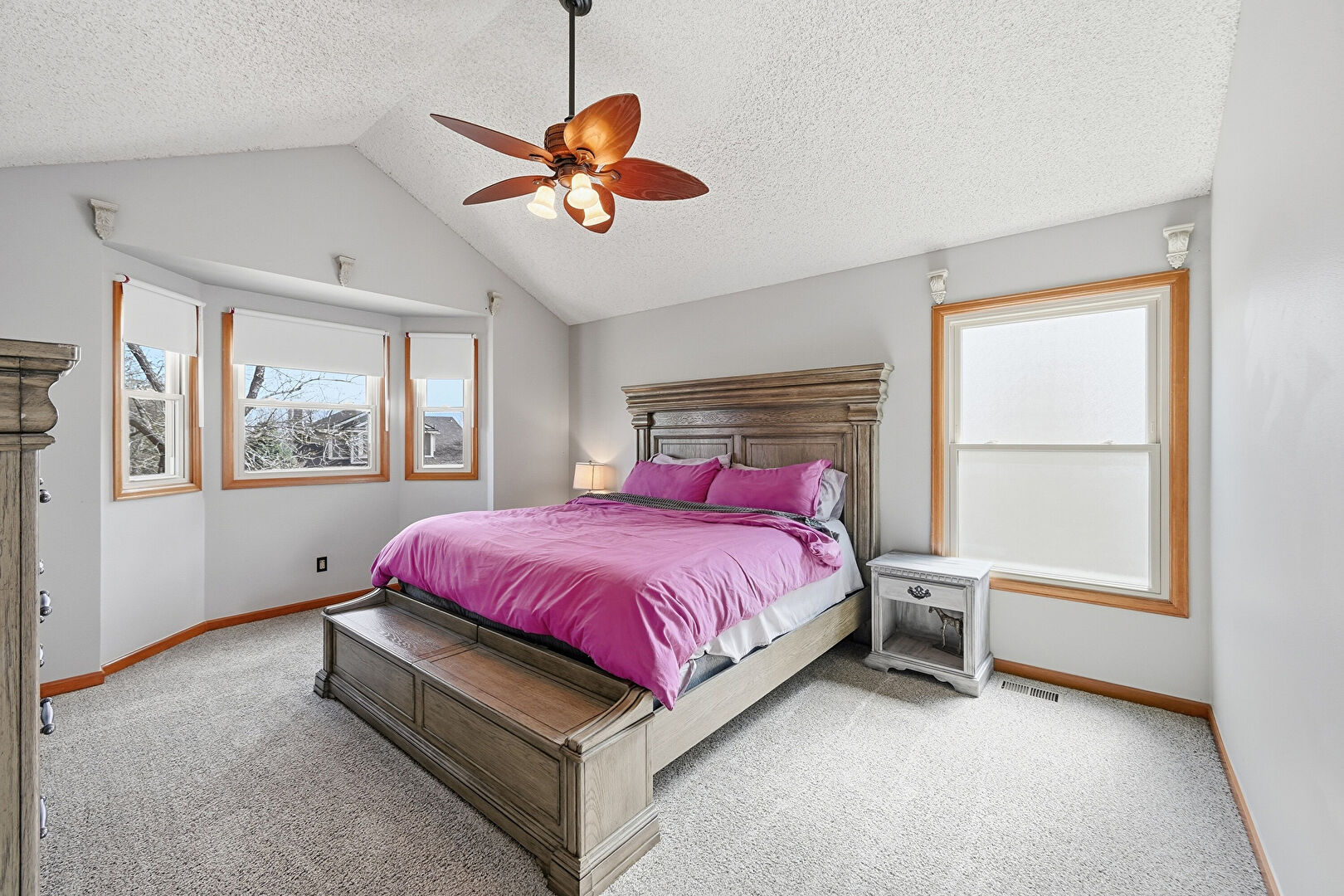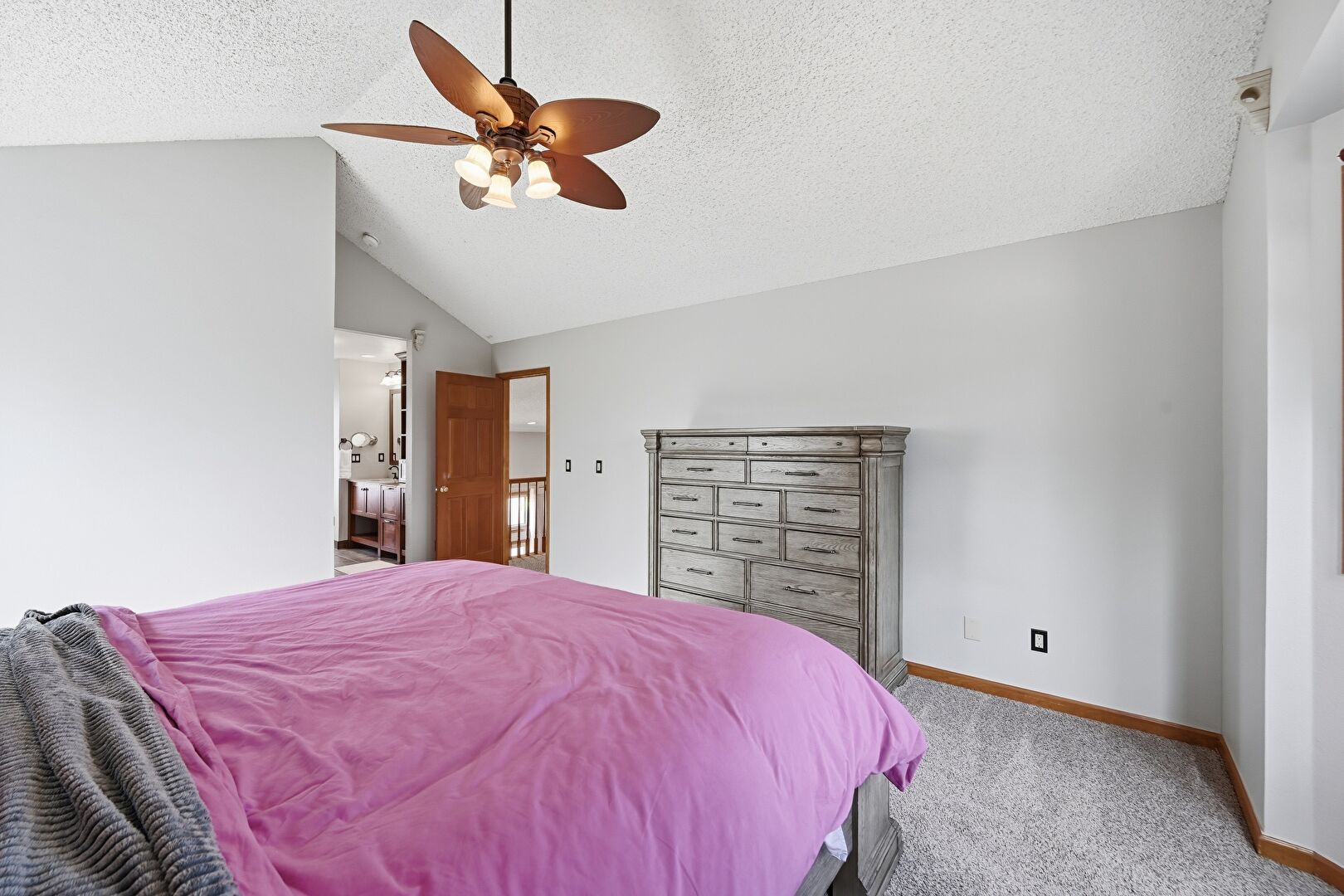 Baseboards Wall, Carpet, Cathedral Ceiling, Ceiling Fan, Drywall, Ensuite Bathroom, Natural Light, Textured Ceiling, Vaulted Ceiling, Vent, Carpet, Ceiling Fan