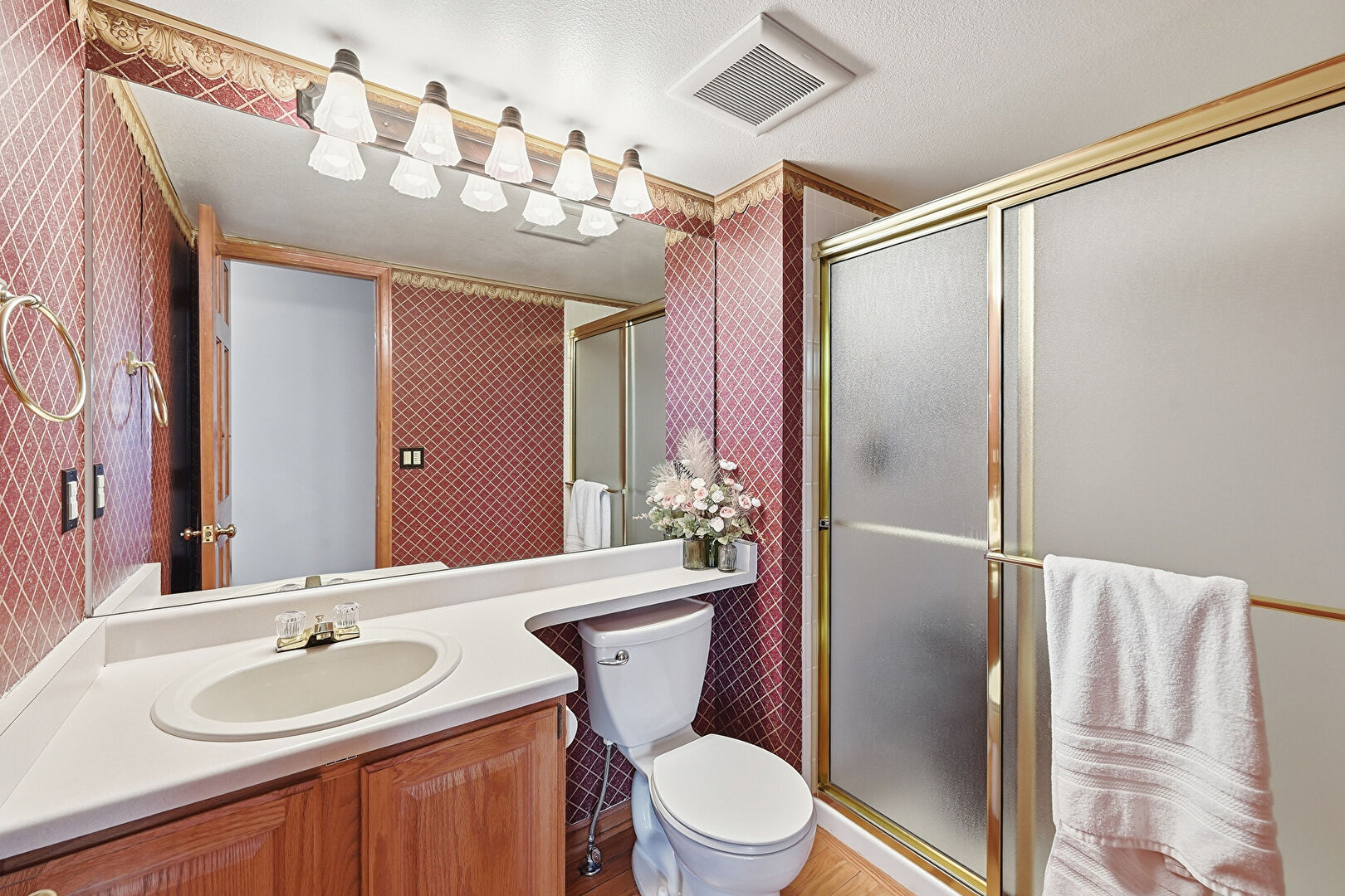 Baseboards Wall, Double Vanity, Drywall, Full Bathroom, Natural Light, Textured Ceiling, Vanity, Vent, Wallpaper Wall, Wood Finish Floor, Baseboards Wall, Combined Bath Shower, Vanity, Vinyl Floor