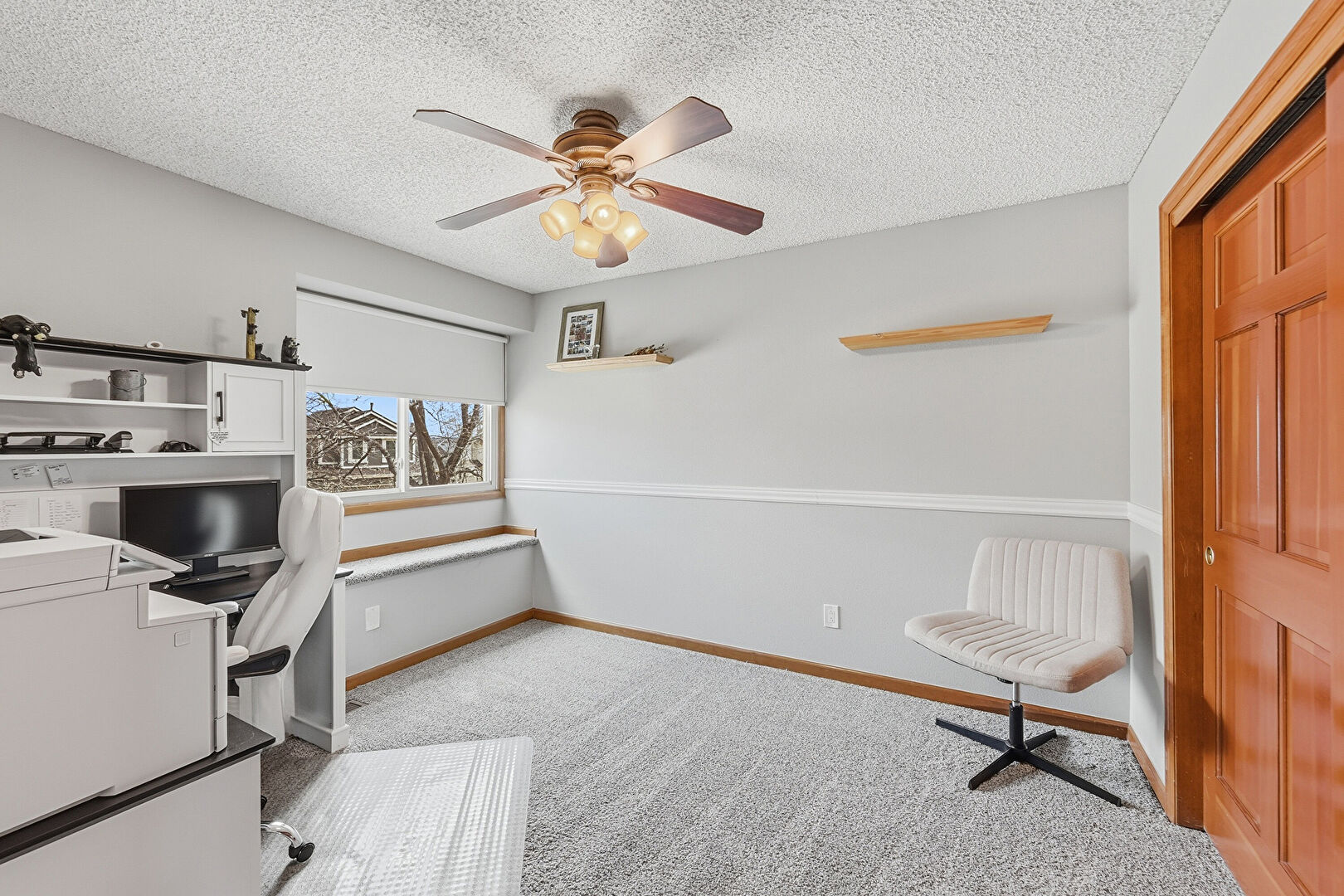 Baseboards Wall, Built In Desk, Ceiling Fan, Drywall, Natural Light, Office Area, Textured Ceiling, Wood Finish Floor, Carpet, Drywall