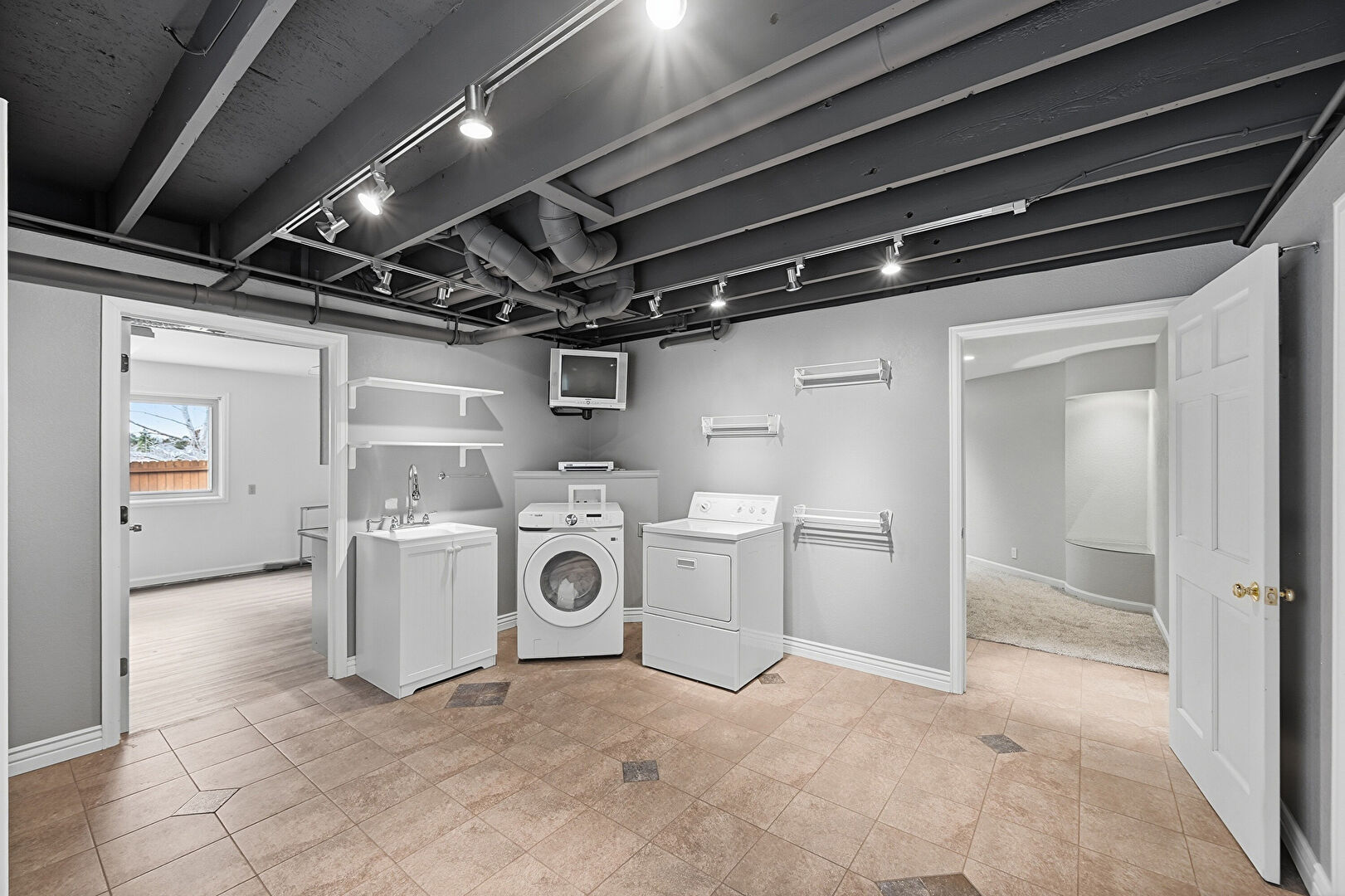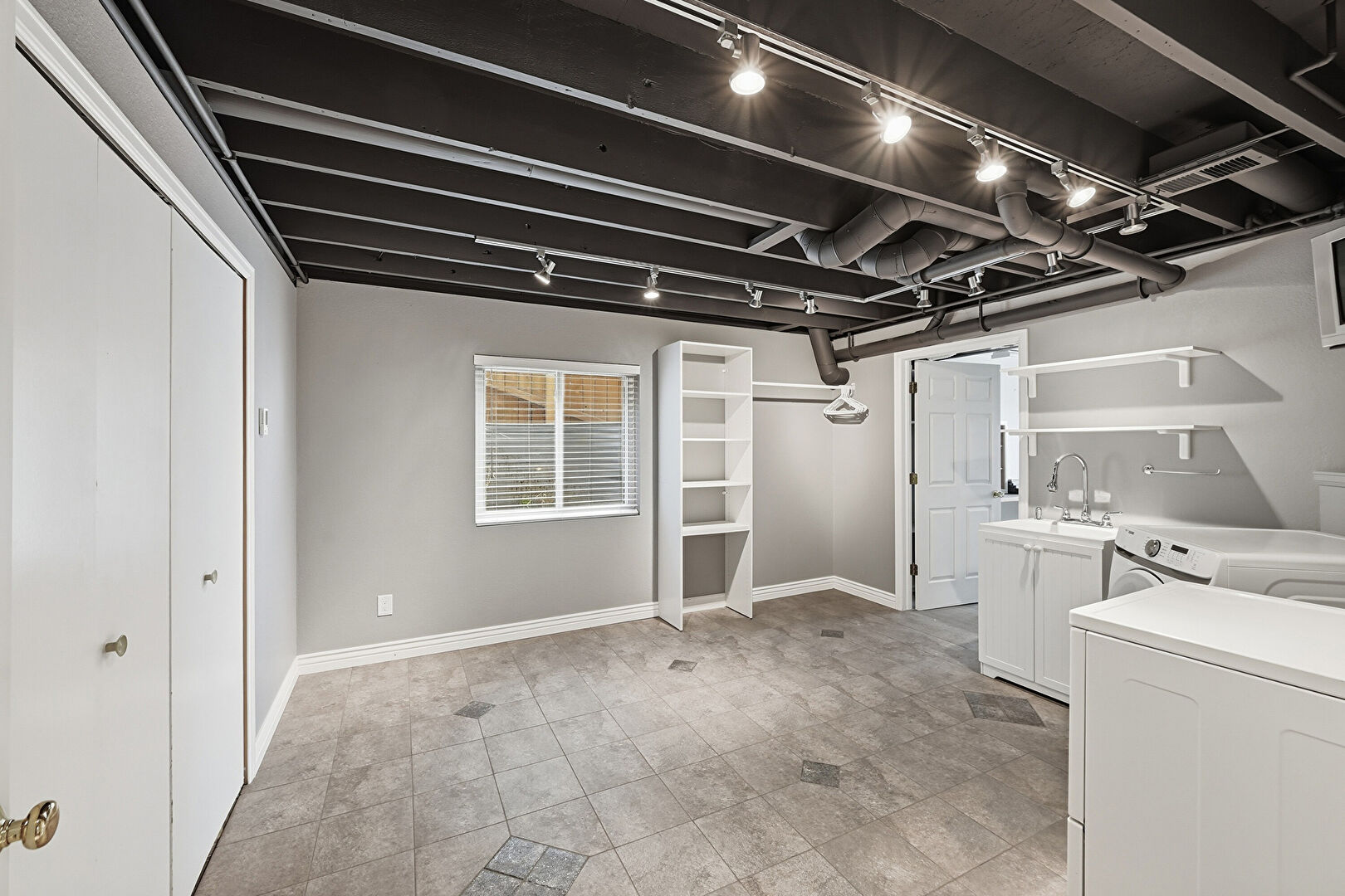 Baseboards Wall, Basement, Drywall, Laundry, Natural Light, Tile Floor, Track Lighting, Washer Hookup
