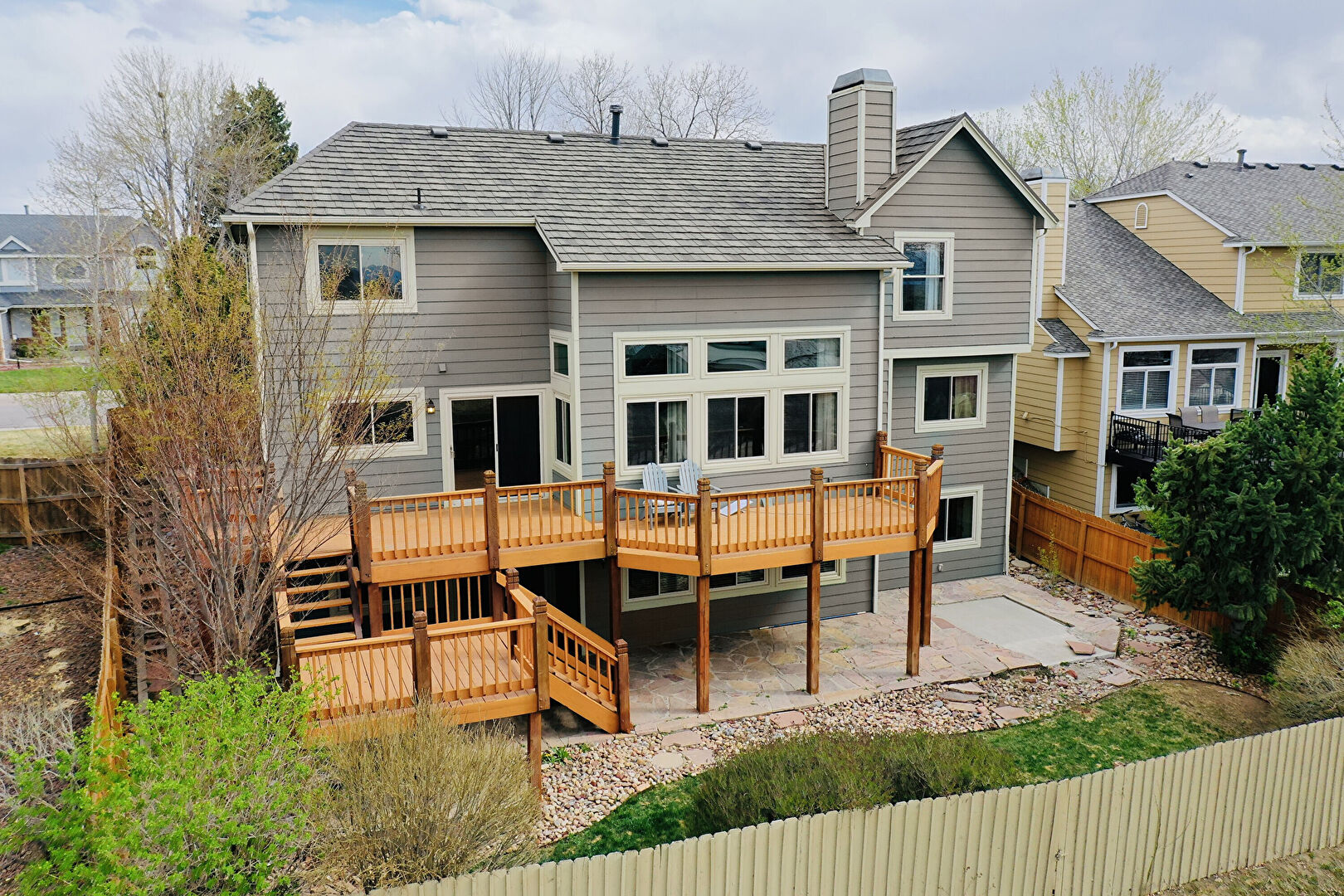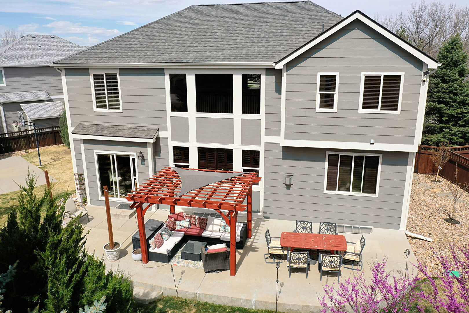 Central Ac, Chimney, Deck, Downspout, Fence, Gutters, Horizontal Siding, Lawn, Outdoor Living Space, Patio, Pergola, Residential View, Shingle Roof, Stairs, Deck, Outdoor Dining Area, Shingle Roof, Stairs