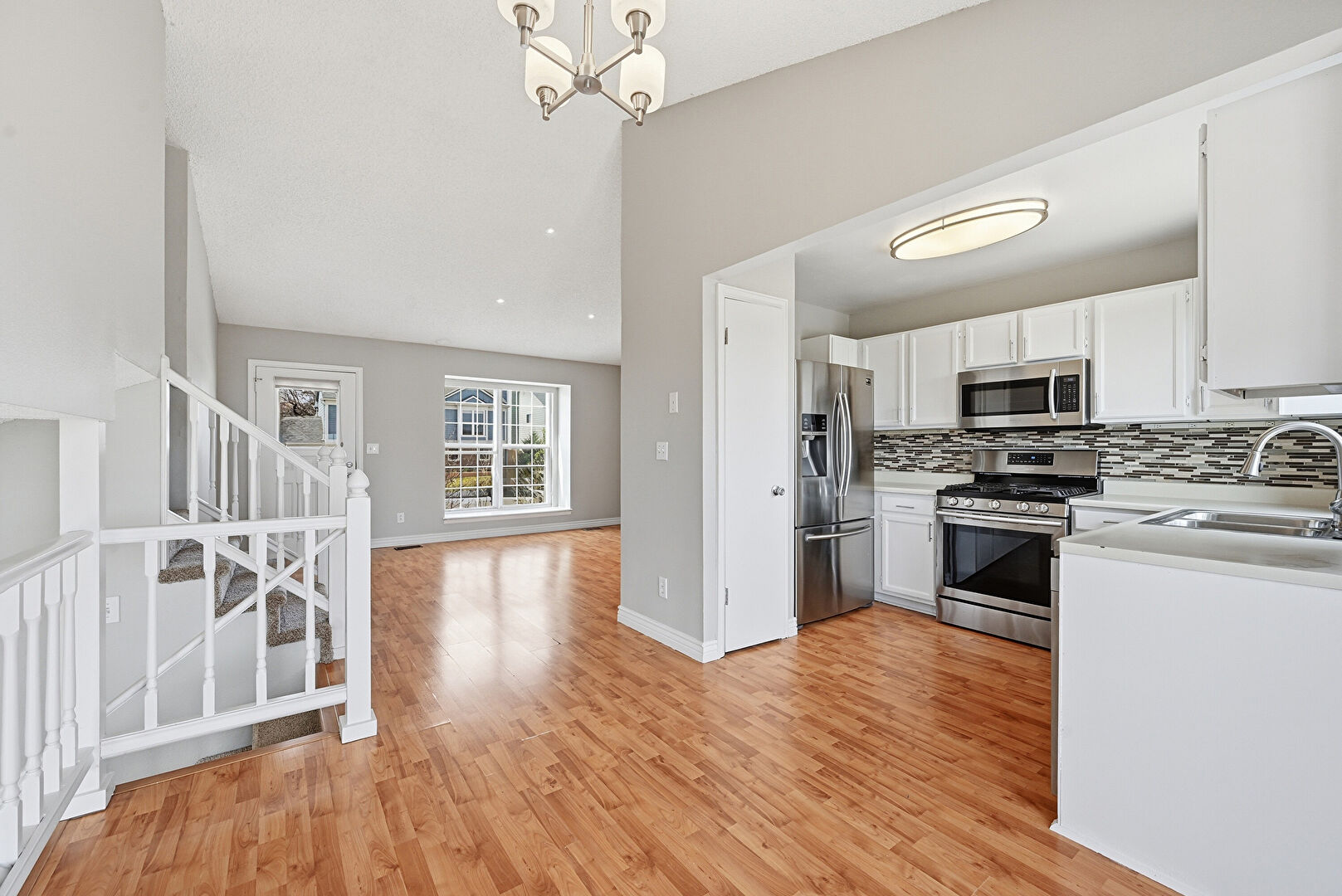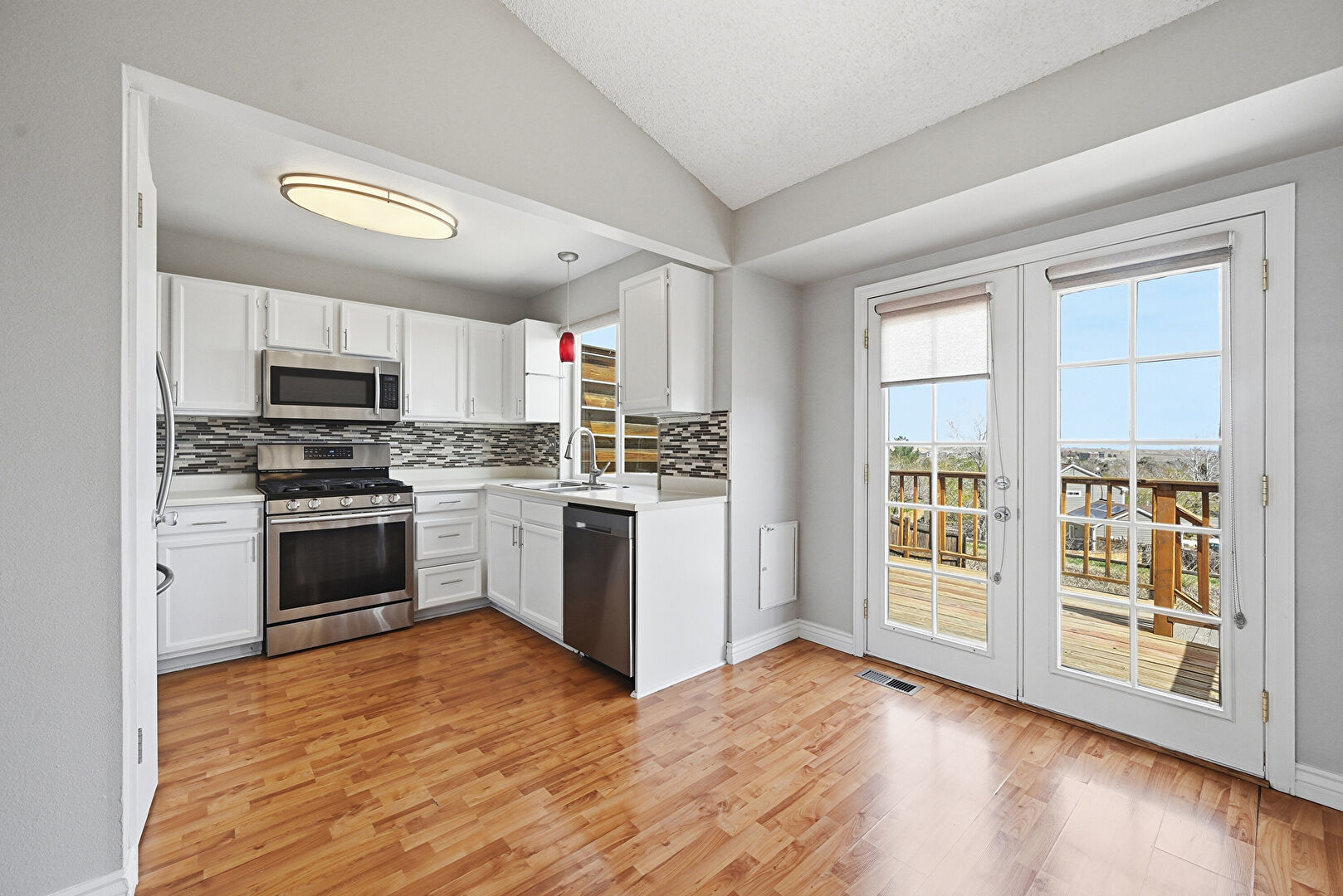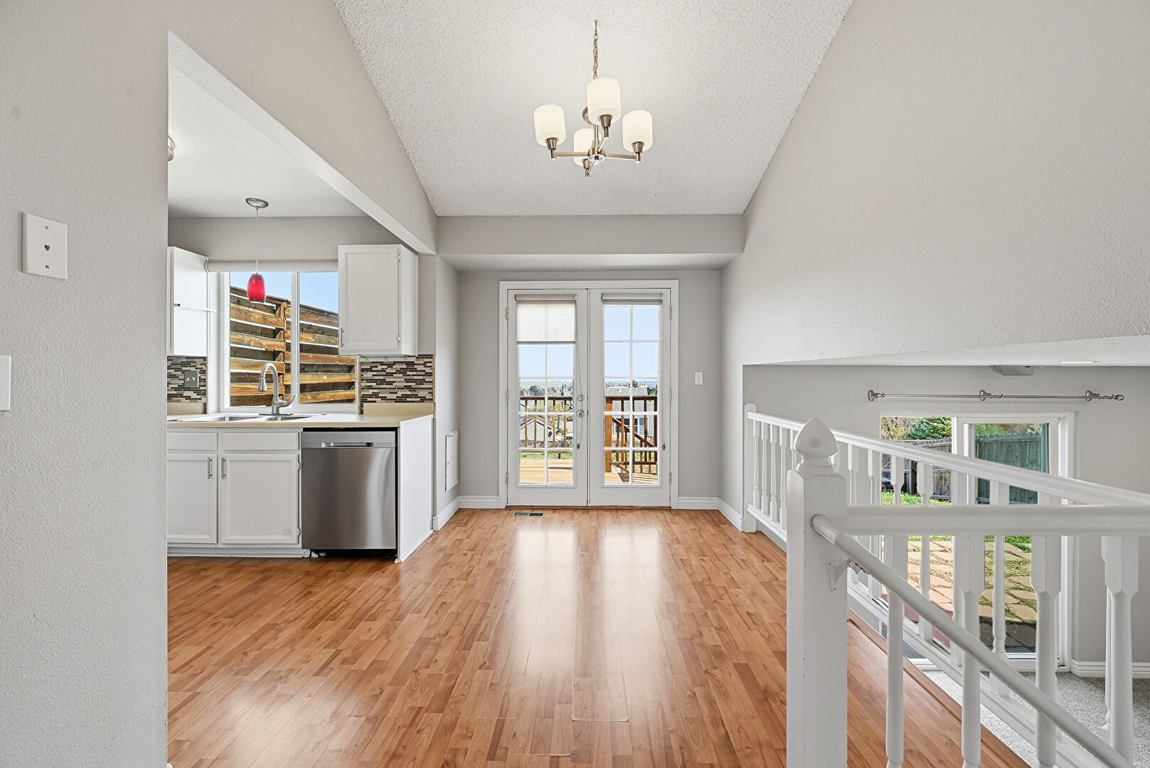 Baseboards Wall, French Doors, Natural Light, Pendant Lighting, Shaker Cabinets, Textured Ceiling, Textured Wall, Vaulted Ceiling, Vent, Wood Finish Floor, Notable Chandelier