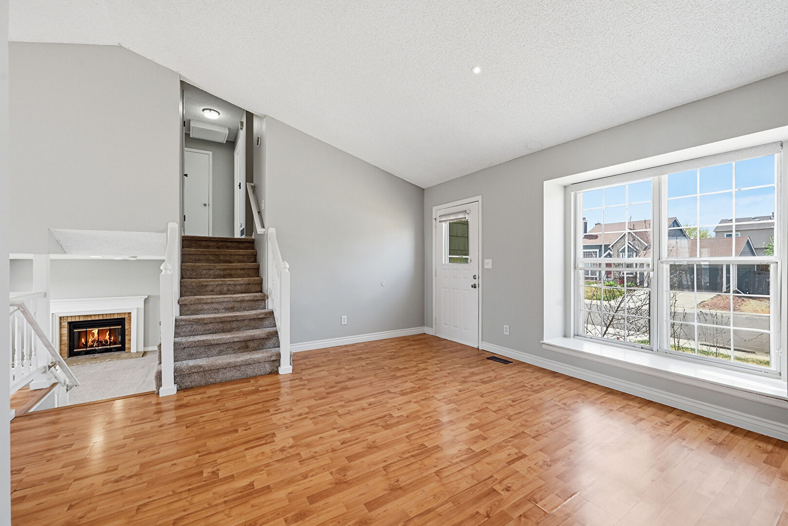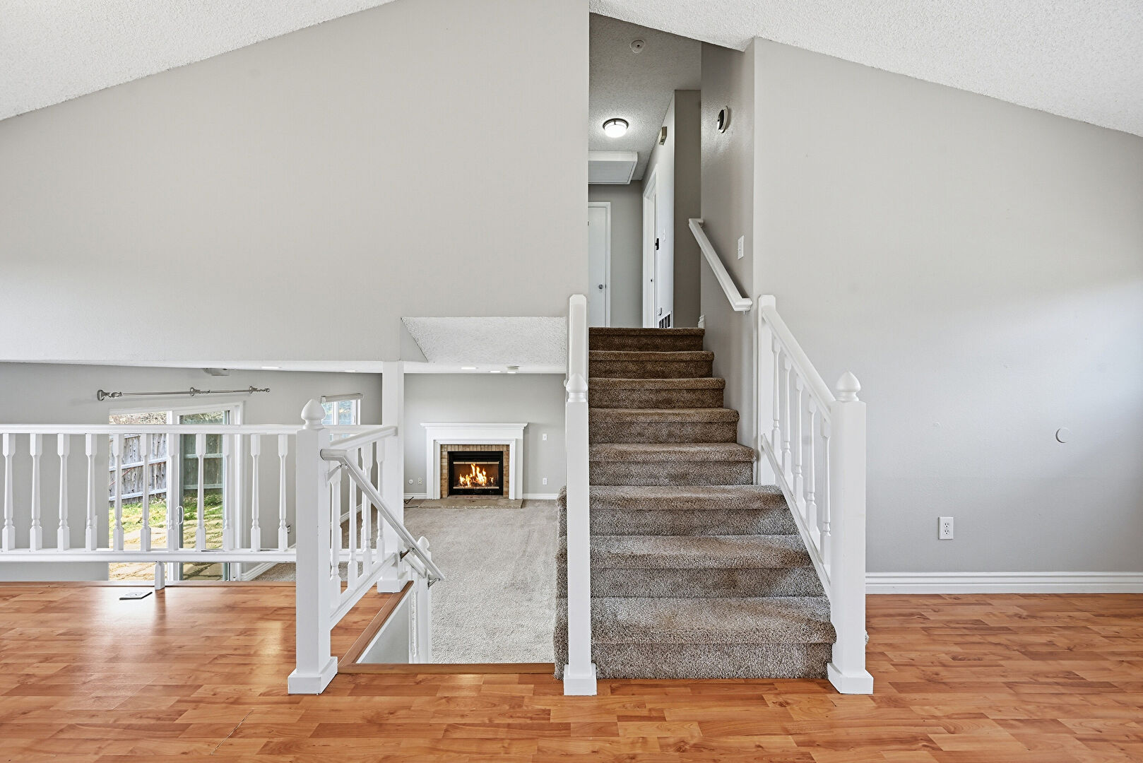 Drywall, Fireplace, High Ceiling, Natural Light, Stairs, Textured Ceiling, Wood Finish Floor, Baseboards Wall