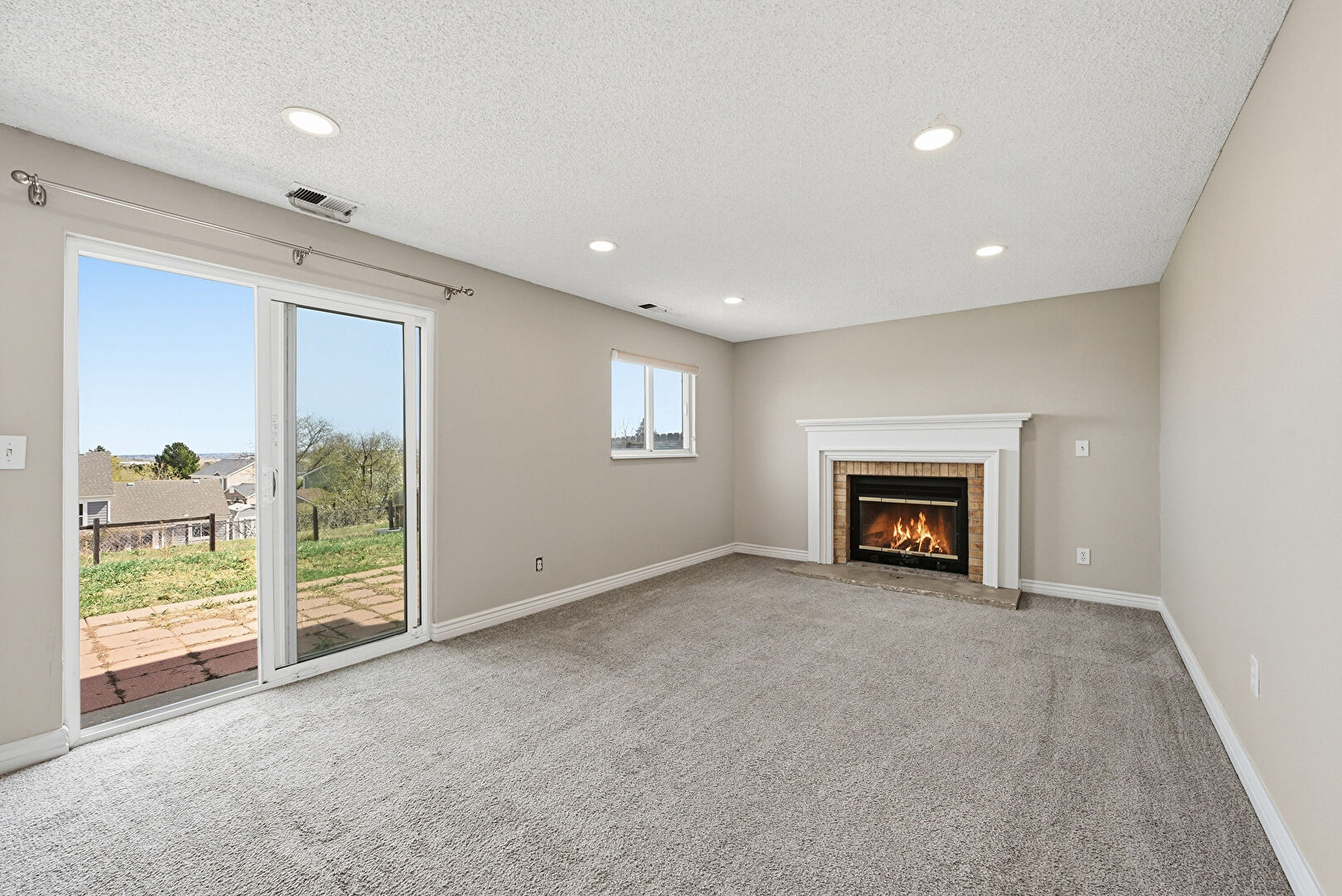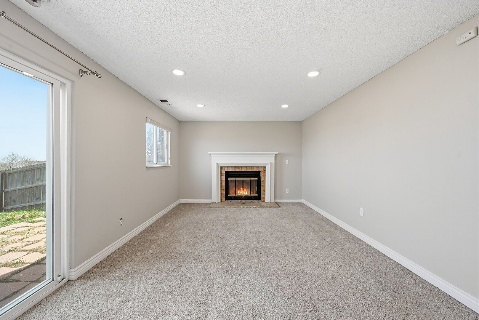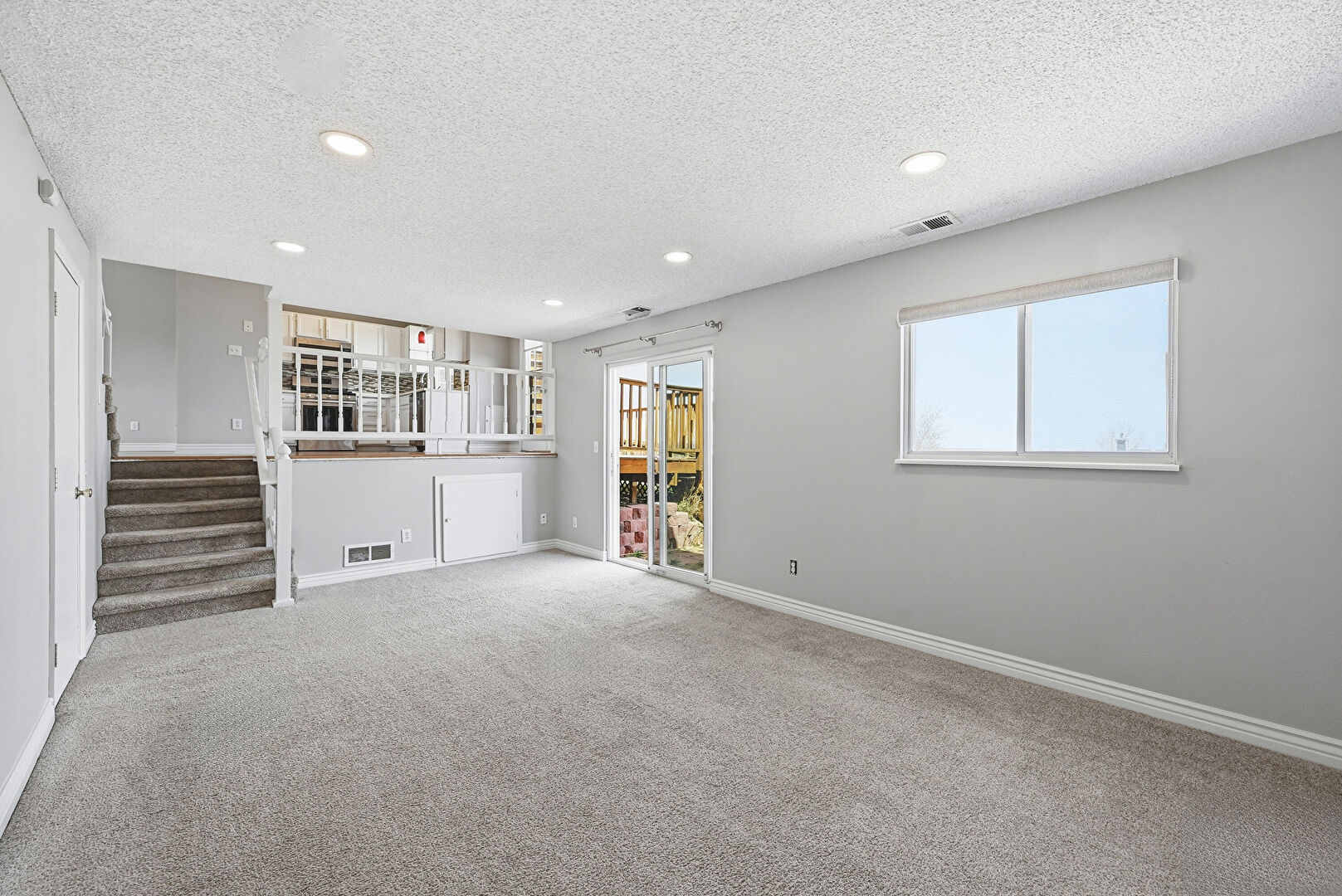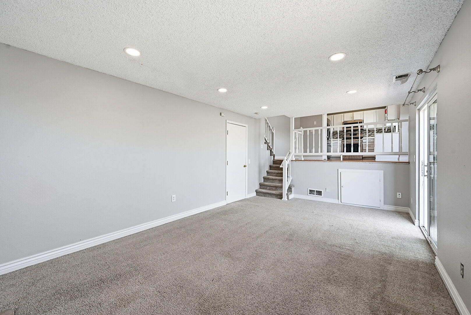 Baseboards Wall, Carpet, Drywall, Fireplace, Natural Light, Recessed Lighting, Stairs, Textured Ceiling, Vent, Carpet, Drywall, Textured Ceiling, Vent