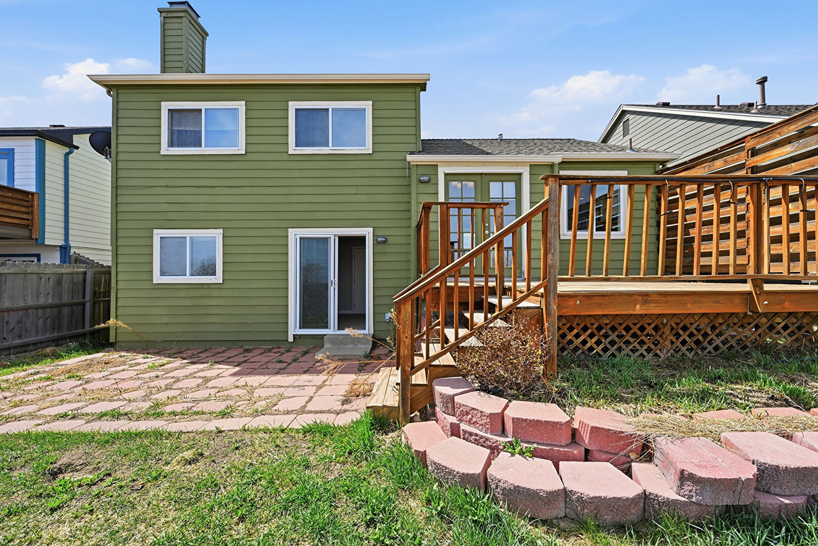 Chimney, Deck, Downspout, Fence, French Doors, Gutters, Horizontal Siding, Patio, Stairs