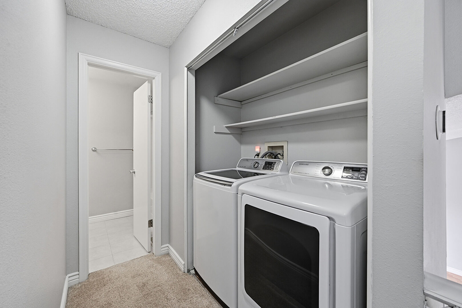 Baseboards Wall, Carpet, Laundry, Textured Ceiling, Tile Floor, Washer Hookup, Drywall