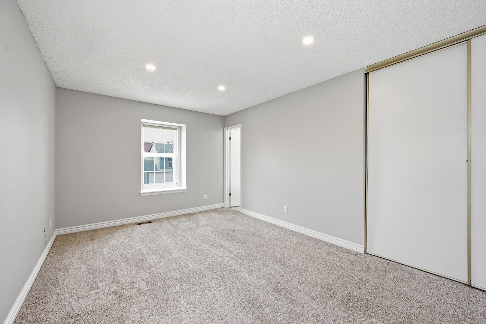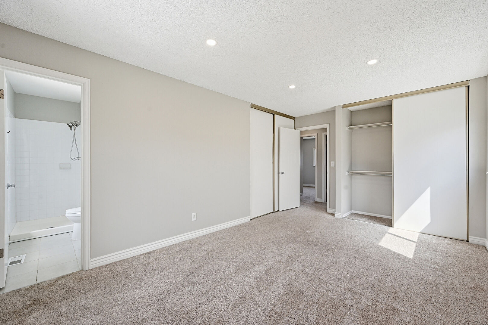 Baseboards Wall, Carpet, Drywall, Ensuite Bathroom, Natural Light, Recessed Lighting, Textured Ceiling, Vent, Carpet, Closet, Two Closets