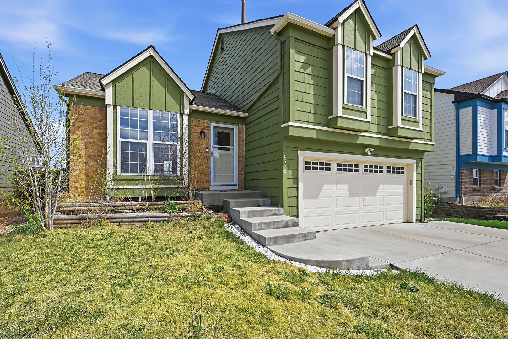 Board Batten Siding, Brick Siding, Built In Garage, Downspout, Driveway, Gutters, Horizontal Siding, Lawn, Shingle Roof, Stoop, Vertical Siding, Built In Garage, Shake Shingle Siding