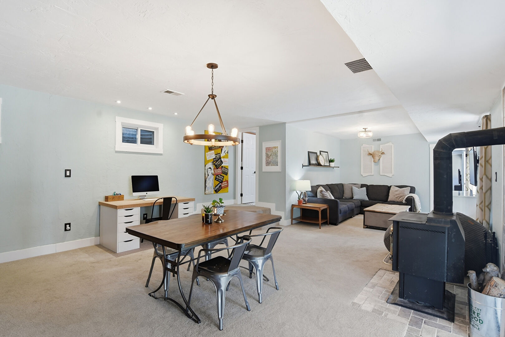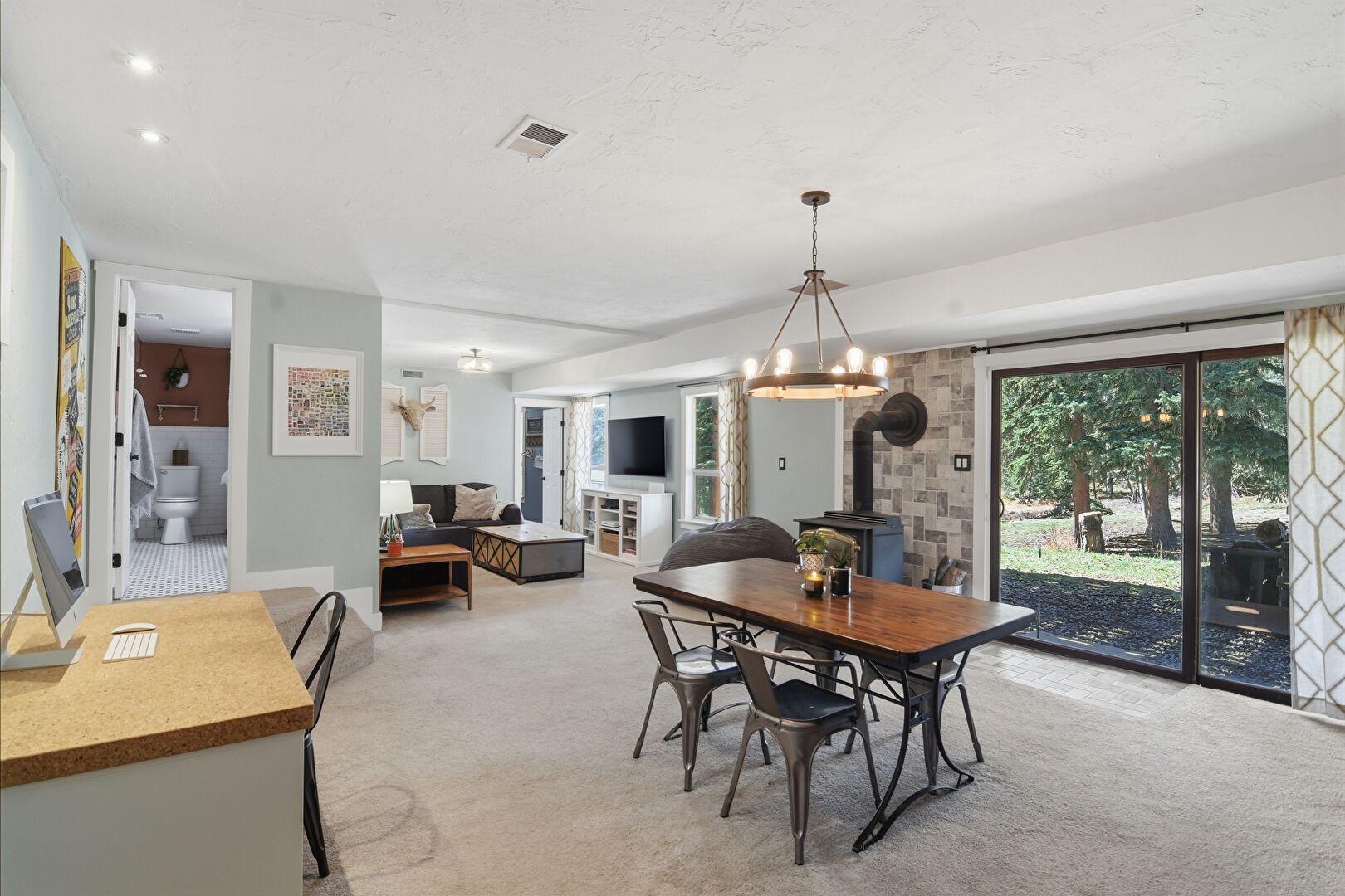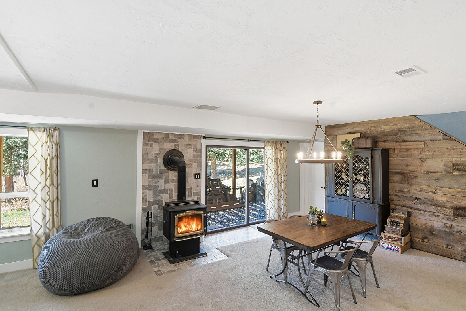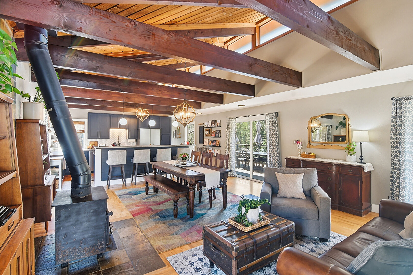 Baseboards Wall, Basement, Beamed Ceiling, Carpet, Drywall, High Ceiling, Natural Light, Notable Chandelier, Vaulted Ceiling, Vent, Wood Ceiling, Wood Finish Floor, Wood Stove, Beamed Ceiling, Natural Light, Vent