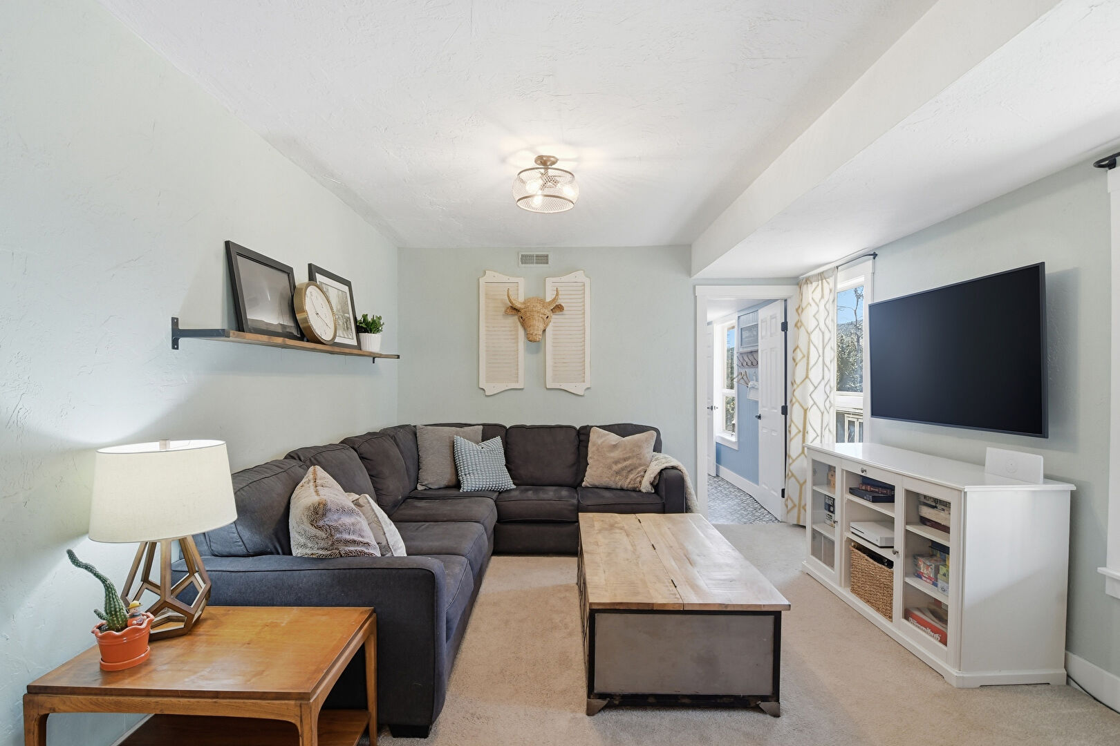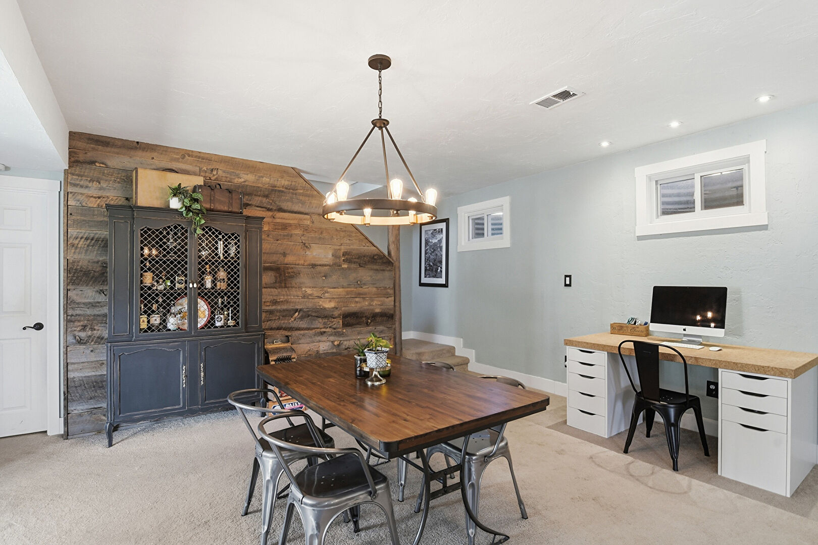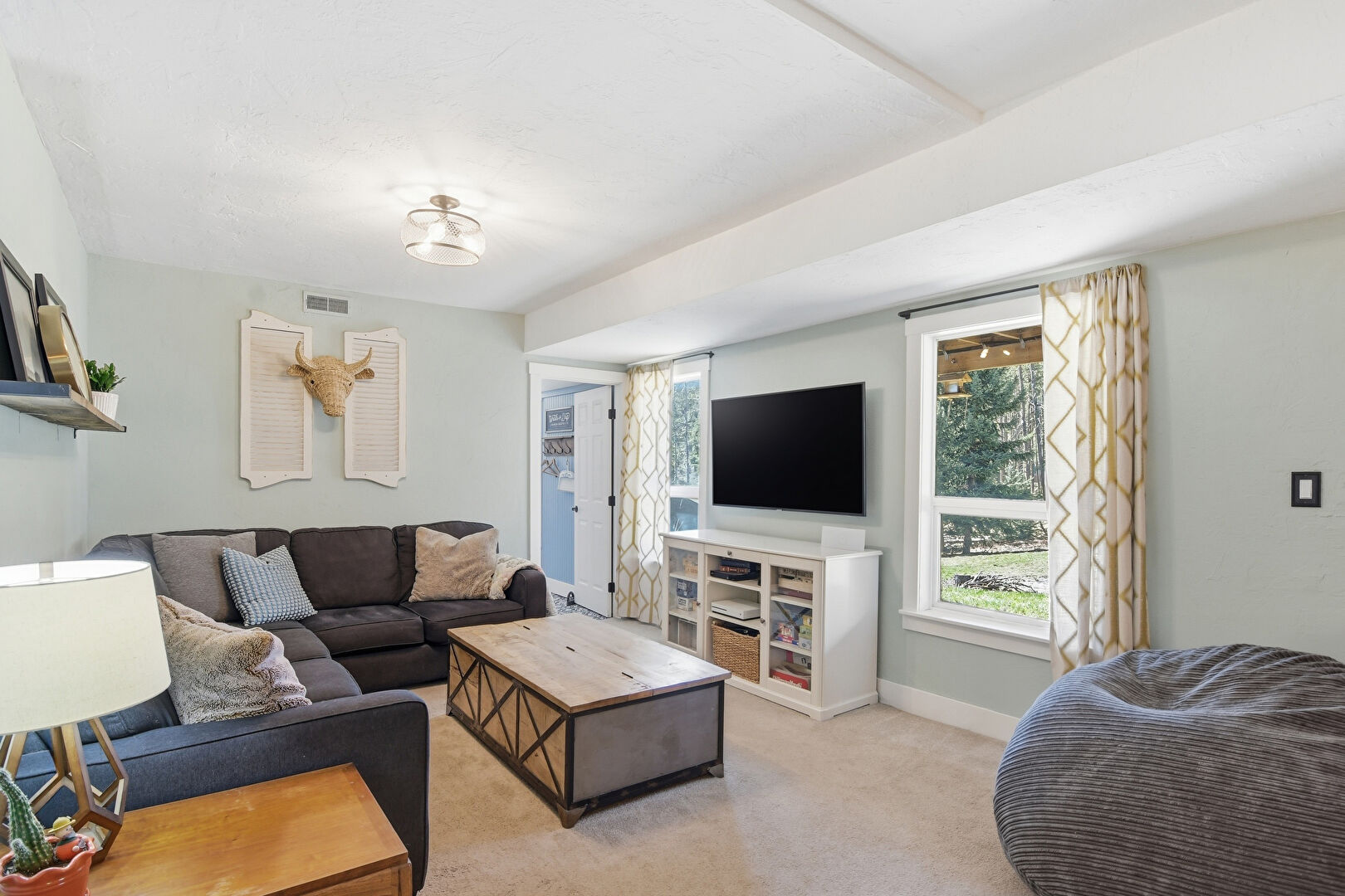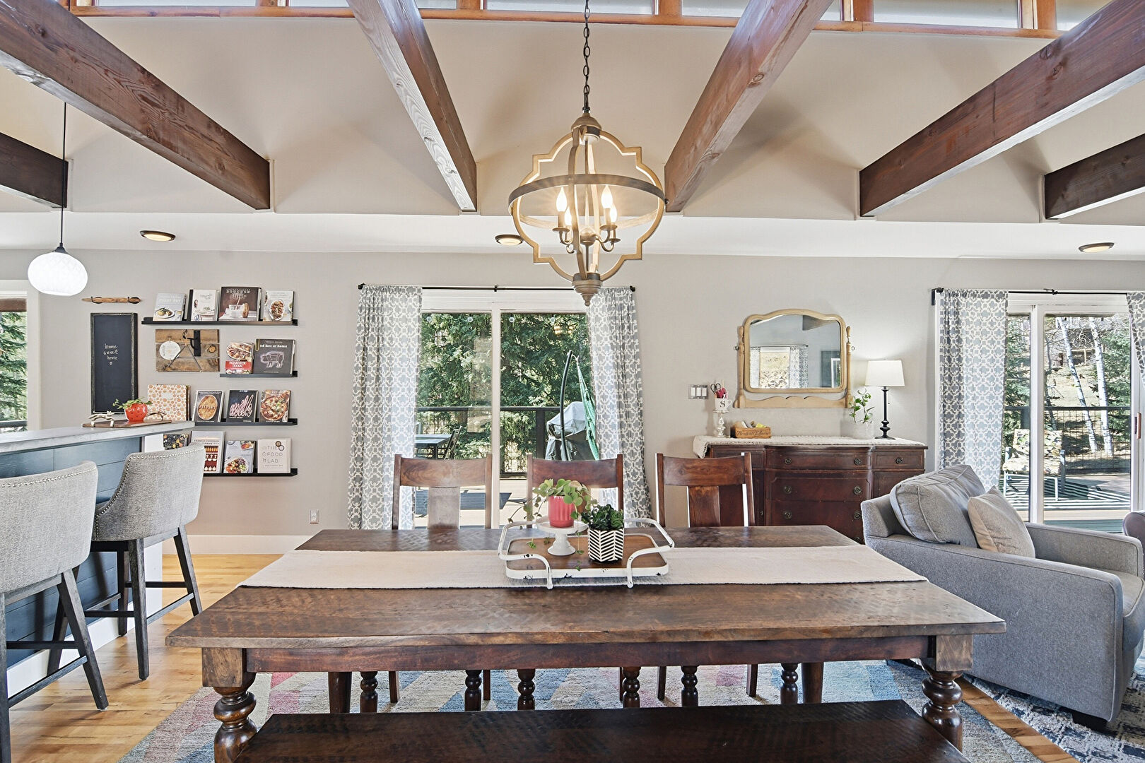 Baseboards Wall, Basement, Beamed Ceiling, Carpet, Drywall, High Ceiling, Natural Light, Notable Chandelier, Vaulted Ceiling, Vent, Wood Ceiling, Wood Finish Floor, Wood Stove, Beamed Ceiling, Natural Light, Vent