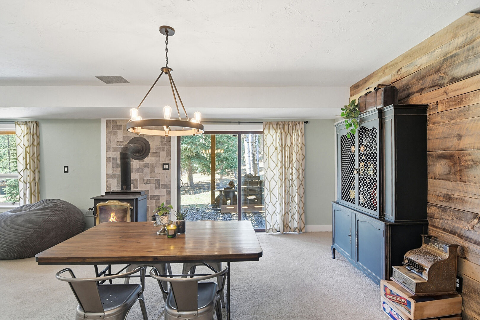 Accent Wall, Baseboards Wall, Beamed Ceiling, Carpet, Drywall, High Ceiling, Natural Light, Notable Chandelier, Office Area, Recessed Lighting, Stairs, Vaulted Ceiling, Vent, Wood Ceiling, Wood Finish Floor, Wood Stove, Wood Wall, Beamed Ceiling, Drywall, Notable Chandelier, Vent, Wood Stove, Wood Wall