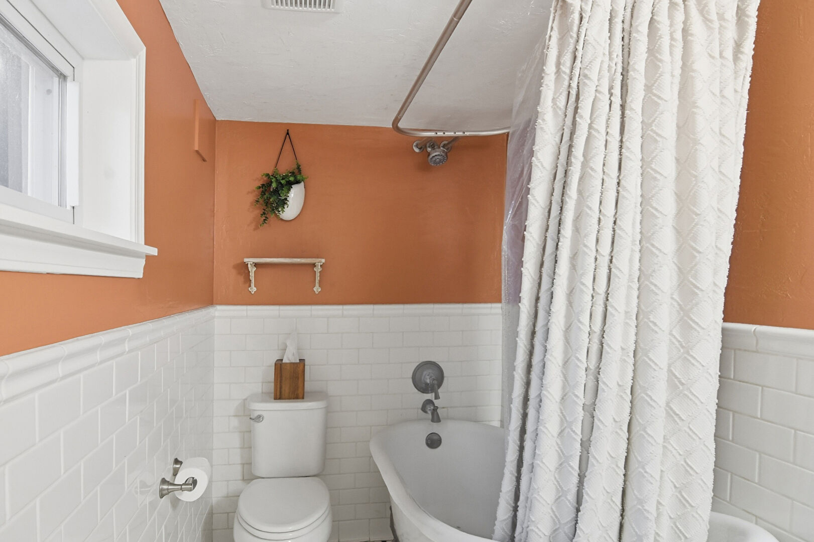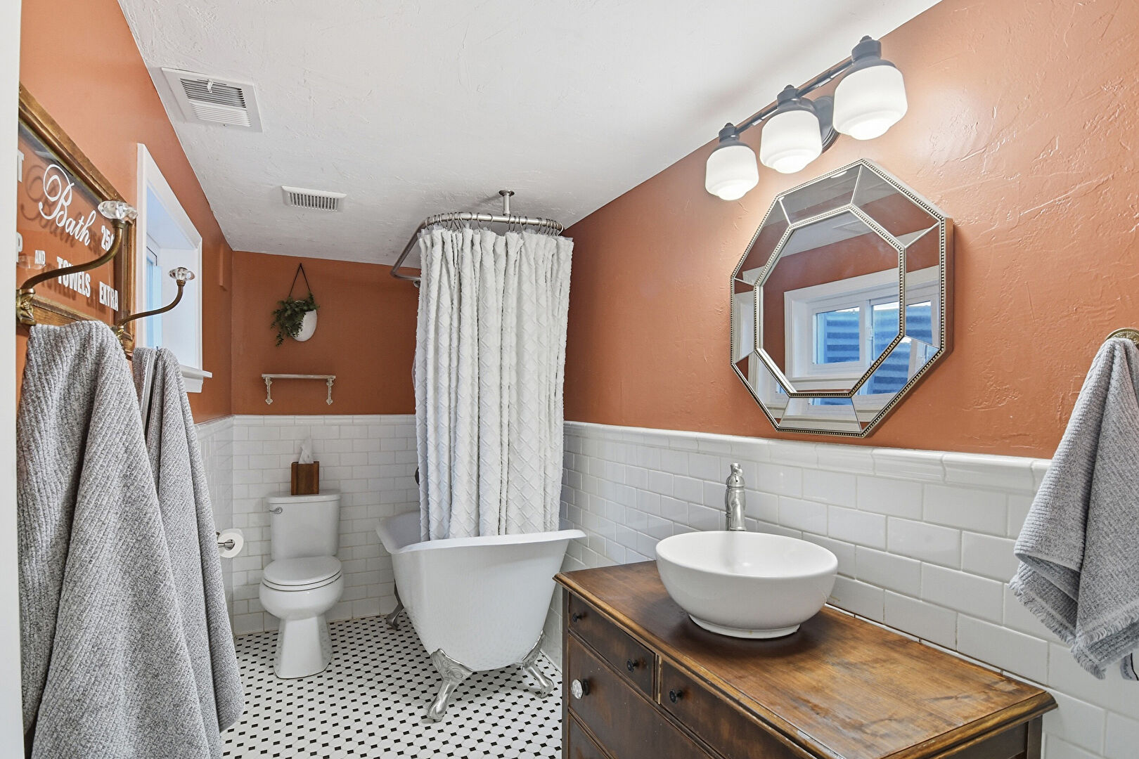 Combined Bath Shower, Drywall, Full Bathroom, Textured Wall, Tile Floor, Tile Wall, Vent, Wainscot Wall, Tile Floor, Vanity