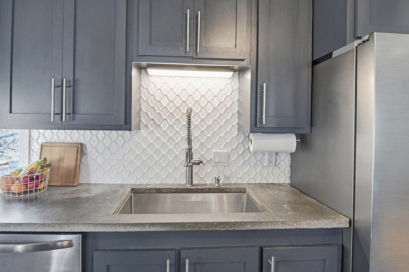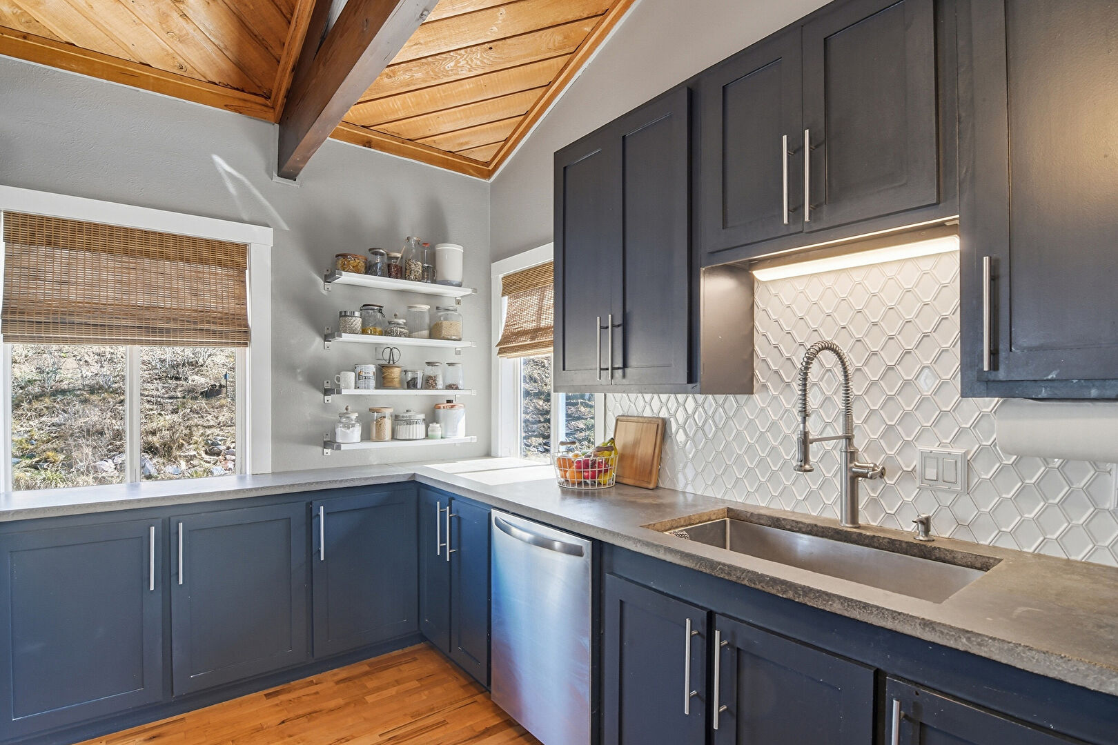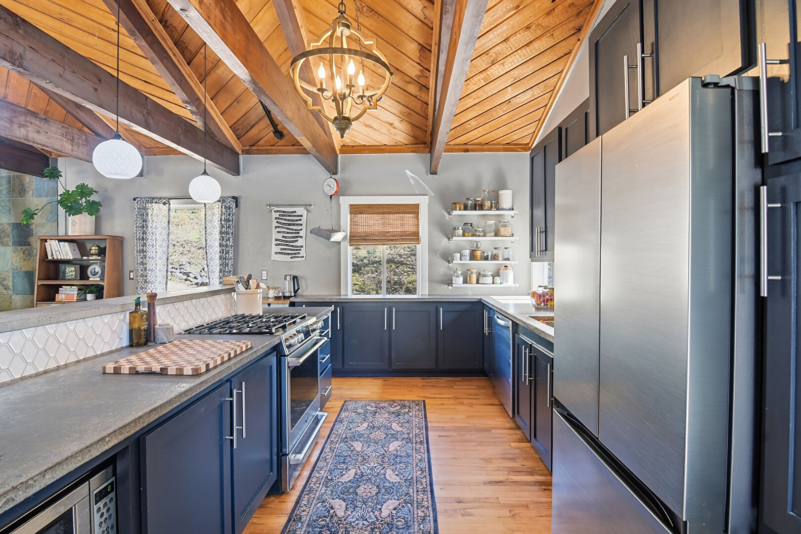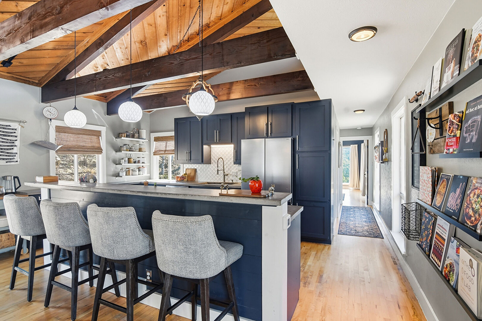 Baseboards Wall, Beamed Ceiling, Blue Cabinets, Drywall, High Ceiling, Kitchen Bar, Kitchen Island, Natural Light, Notable Chandelier, One Wall Kitchen, Open Shelves, Opens To Living Area, Pendant Lighting, Shaker Cabinets, Stone Countertops, Vaulted Ceiling, Wood Ceiling, Wood Finish Floor, Blue Cabinets, Open Shelves, Pendant Lighting, Wood Finish Floor