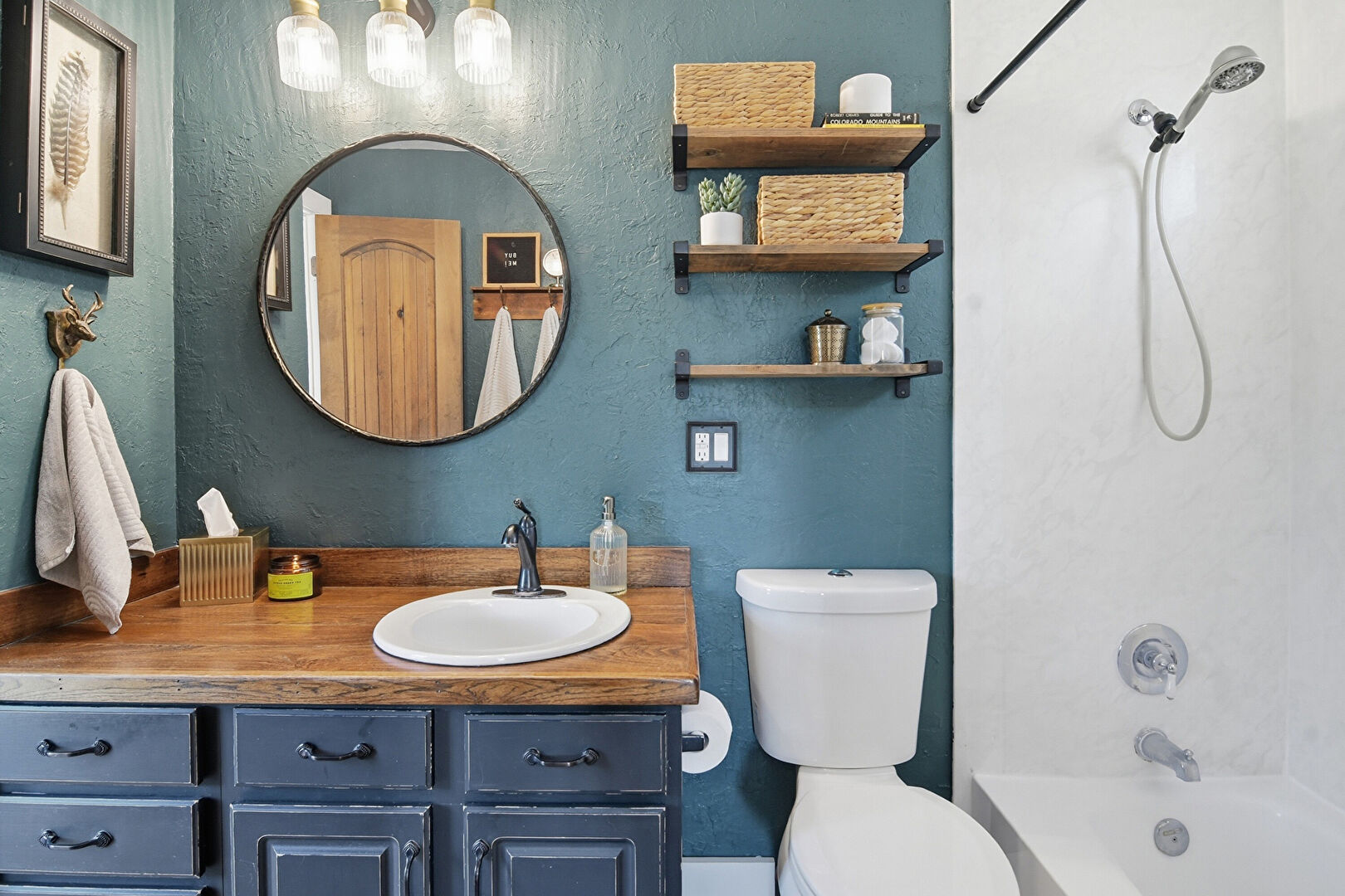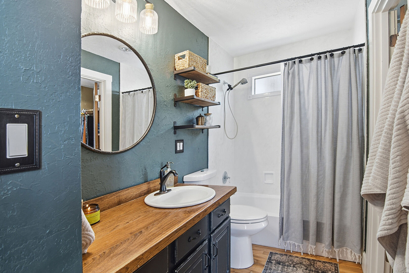 Combined Bath Shower, Full Bathroom, Natural Light, Textured Wall, Vanity, Full Bathroom, Wood Finish Floor