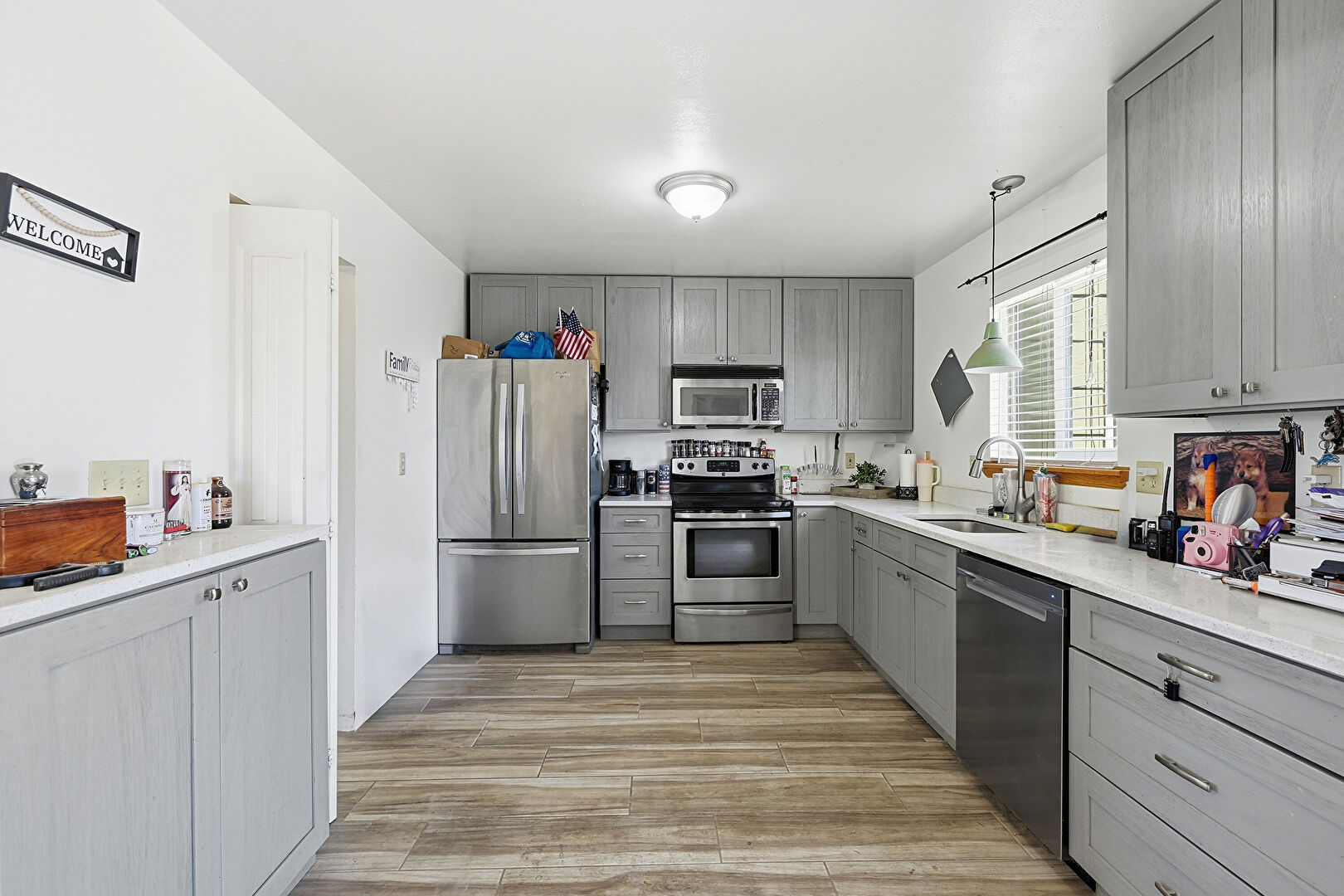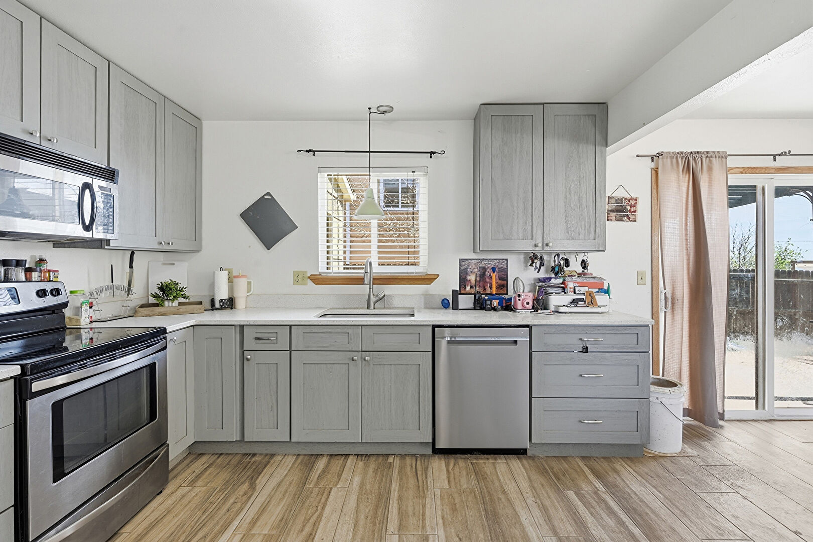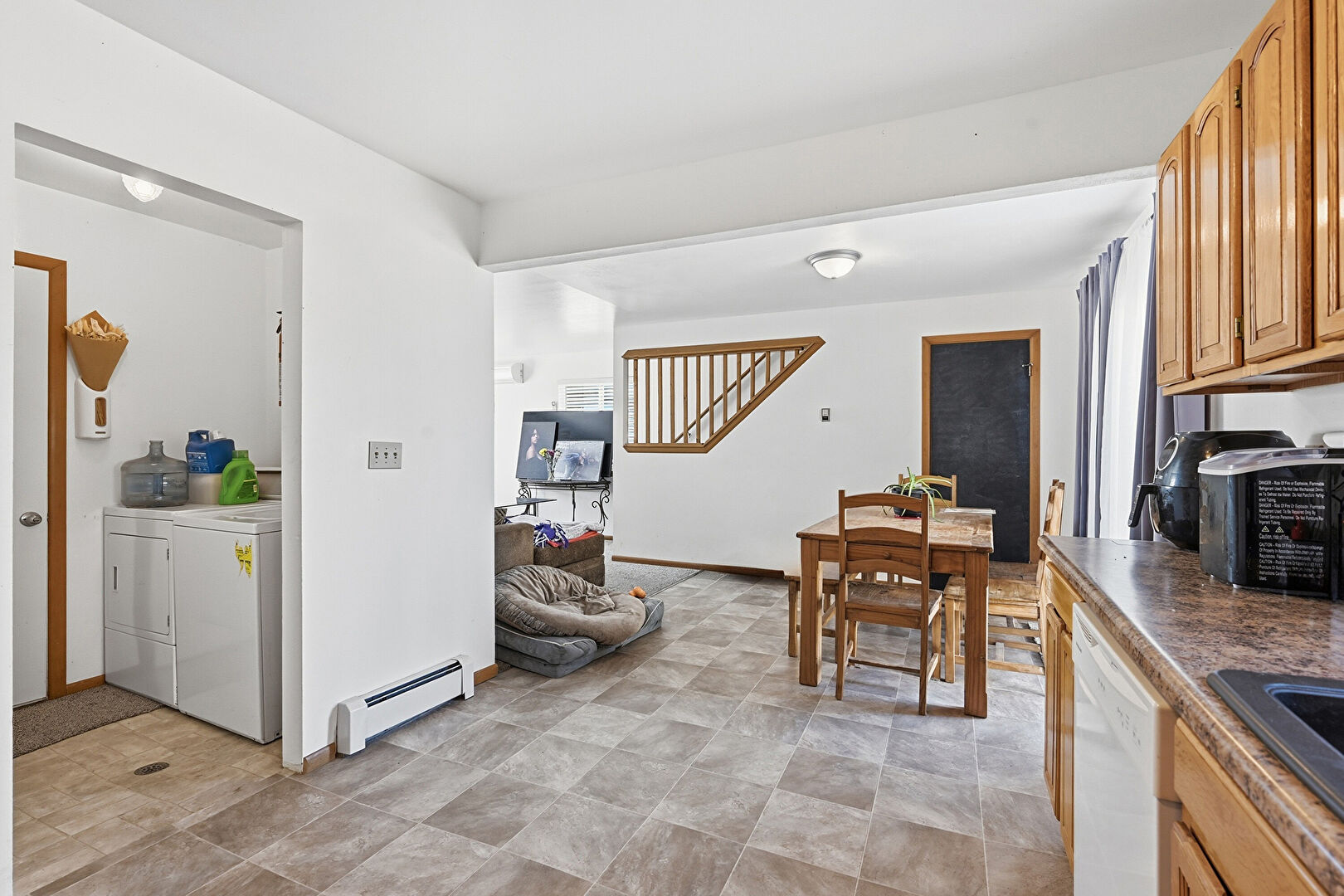 Arched Cabinets, Baseboard Radiator, Baseboards Wall, Drywall, Gray Cabinets, L Shaped Kitchen, Laundry, Medium Brown Cabinets, Natural Light, Pendant Lighting, Raised Cabinets, Shaker Cabinets, Stone Countertops, Stone Finish Floor, Wood Finish Floor, Natural Light, Opens To Living Area, Visible Hinge Cabinets, Wood Finish Floor