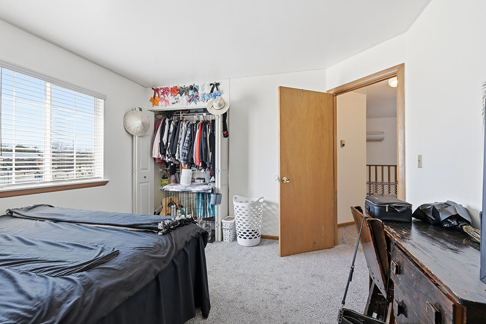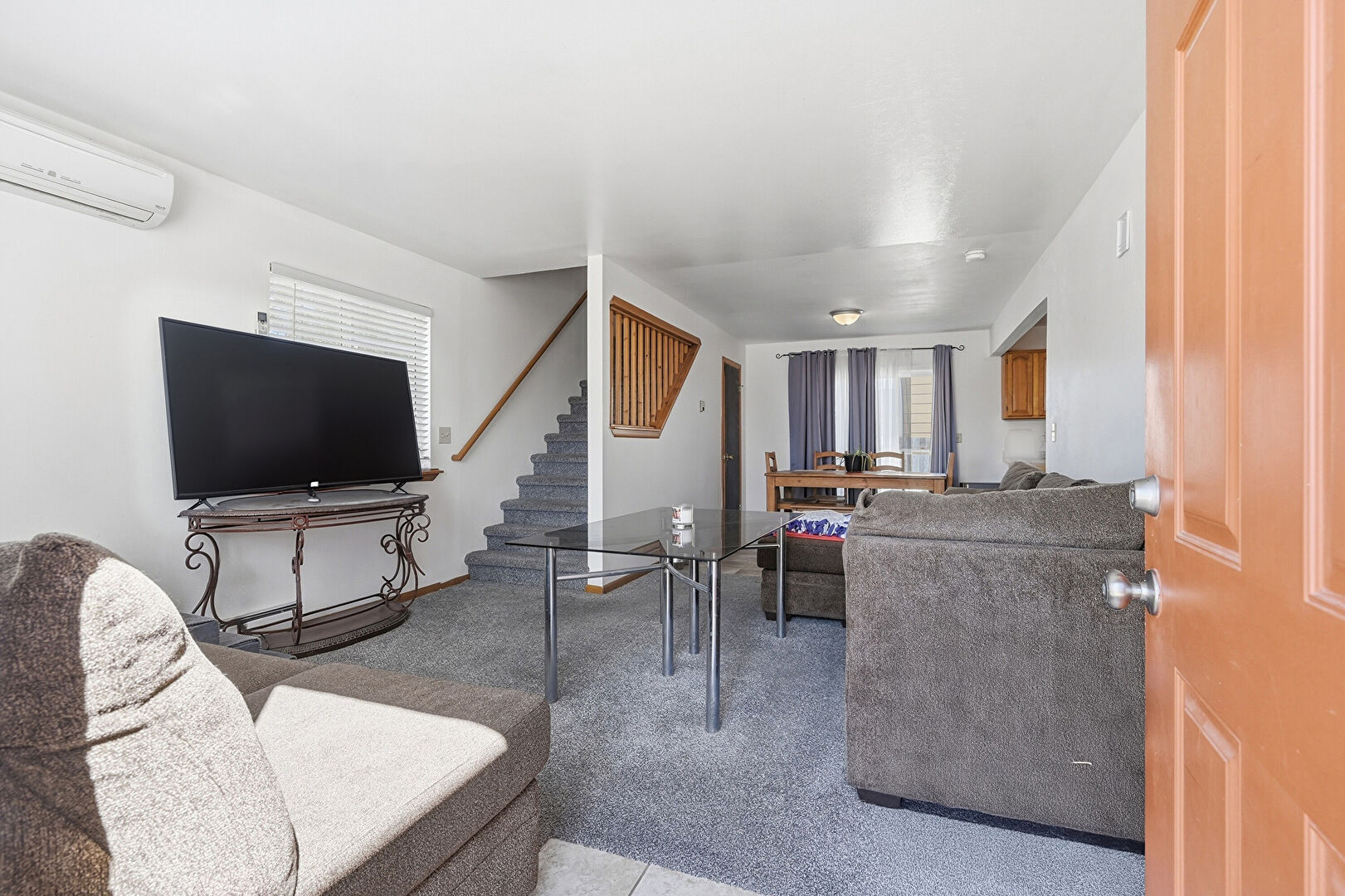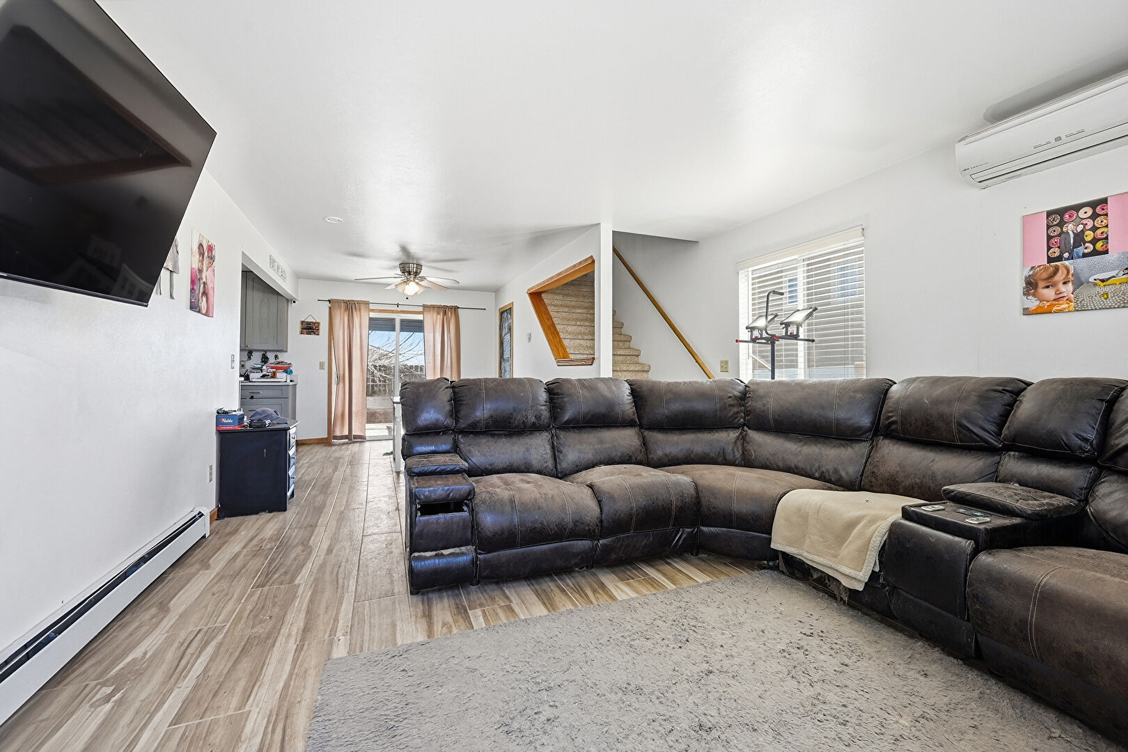 Baseboard Radiator, Baseboards Wall, Carpet, Ceiling Fan, Drywall, Natural Light, Stairs, Vent, Wall Mounted Ac, Wood Finish Floor, Baseboards Wall, Carpet, Natural Light, Wall Mounted Ac