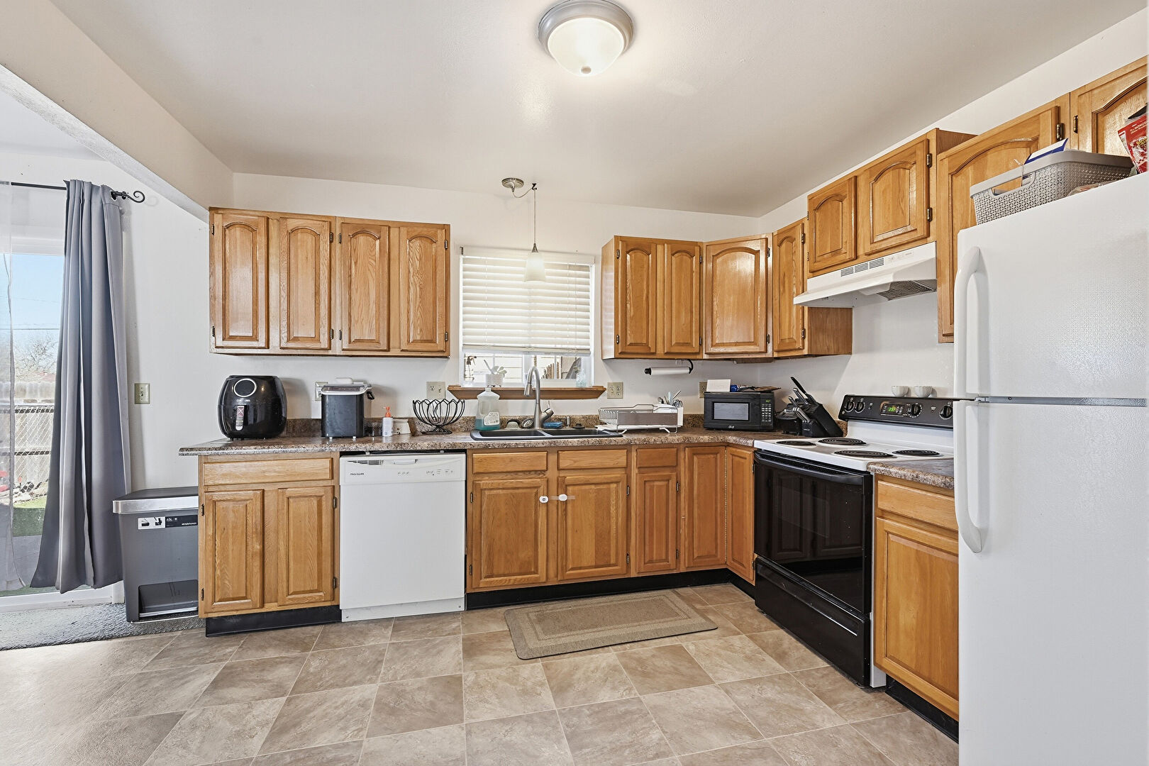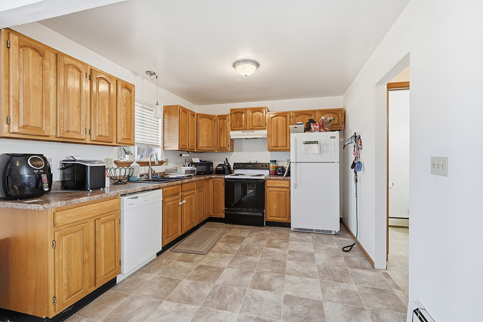 Arched Cabinets, Baseboard Radiator, Baseboards Wall, Ceiling Fan, Drywall, L Shaped Kitchen, Medium Brown Cabinets, Natural Light, Stairs, Stone Finish Floor, Wall Mounted Ac, Wood Finish Floor, Drywall, Raised Cabinets, Wall Mounted Ac, Wood Finish Floor