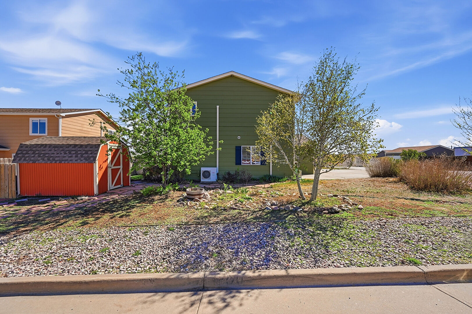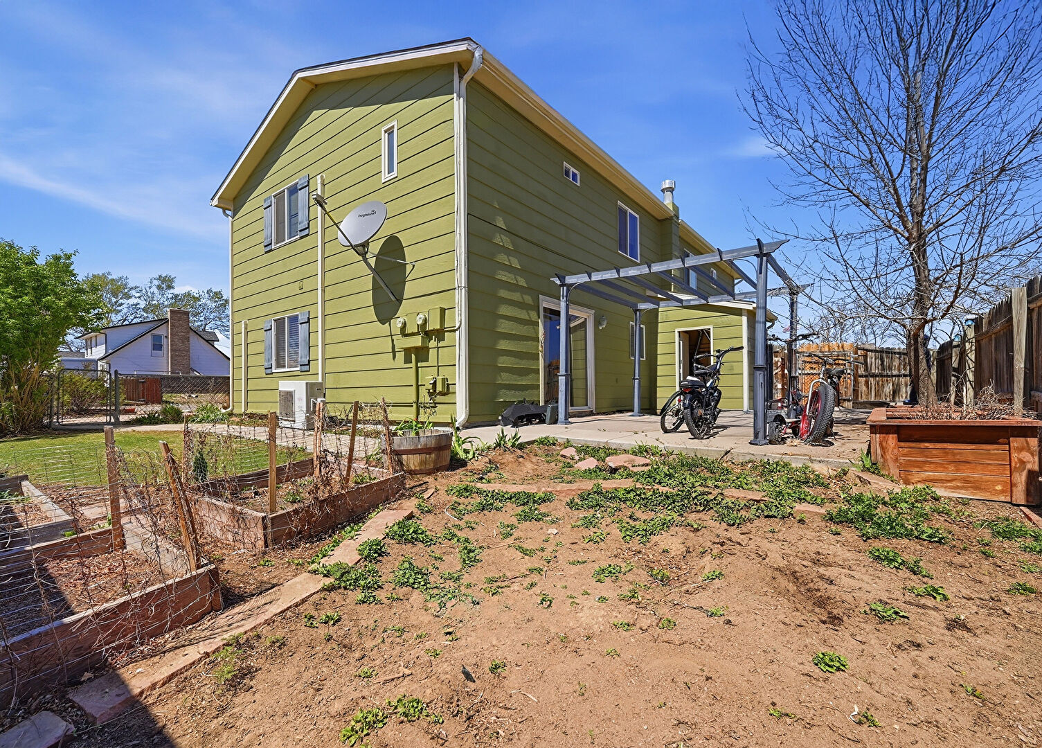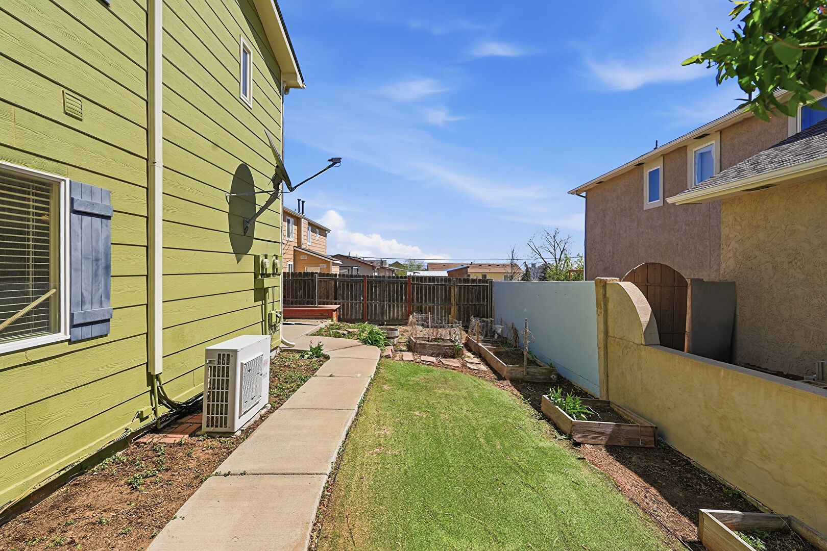 Downspout, Fence, Fire Pit, Garden, Gate, Grill, Gutters, Horizontal Siding, Lawn, Outdoor Structure, Patio, Pergola, Playground, Residential View, Satellite Dish, Shed, Split Ac Unit, Fence, Lawn, Patio, Shed, Split Ac Unit
