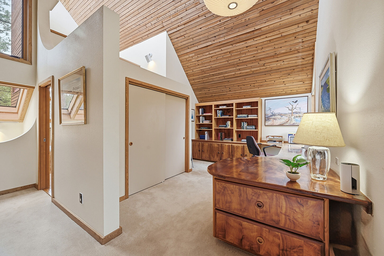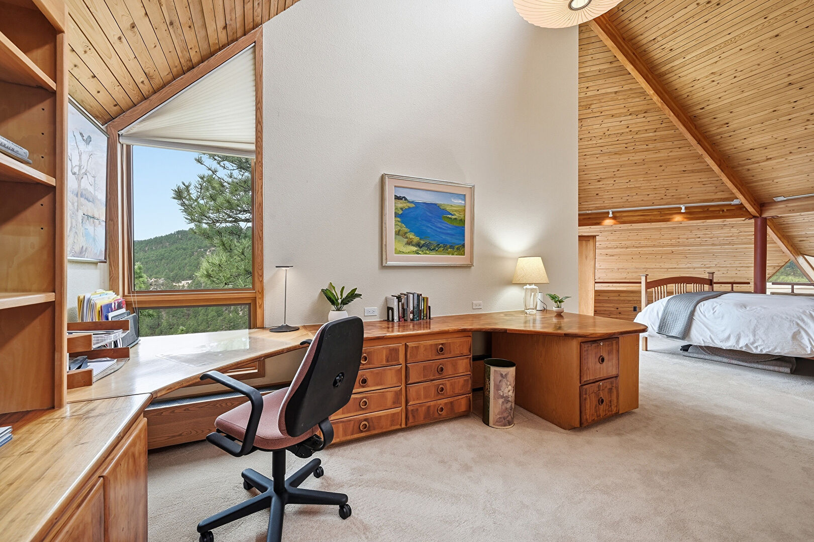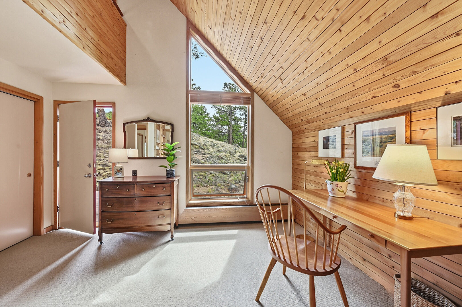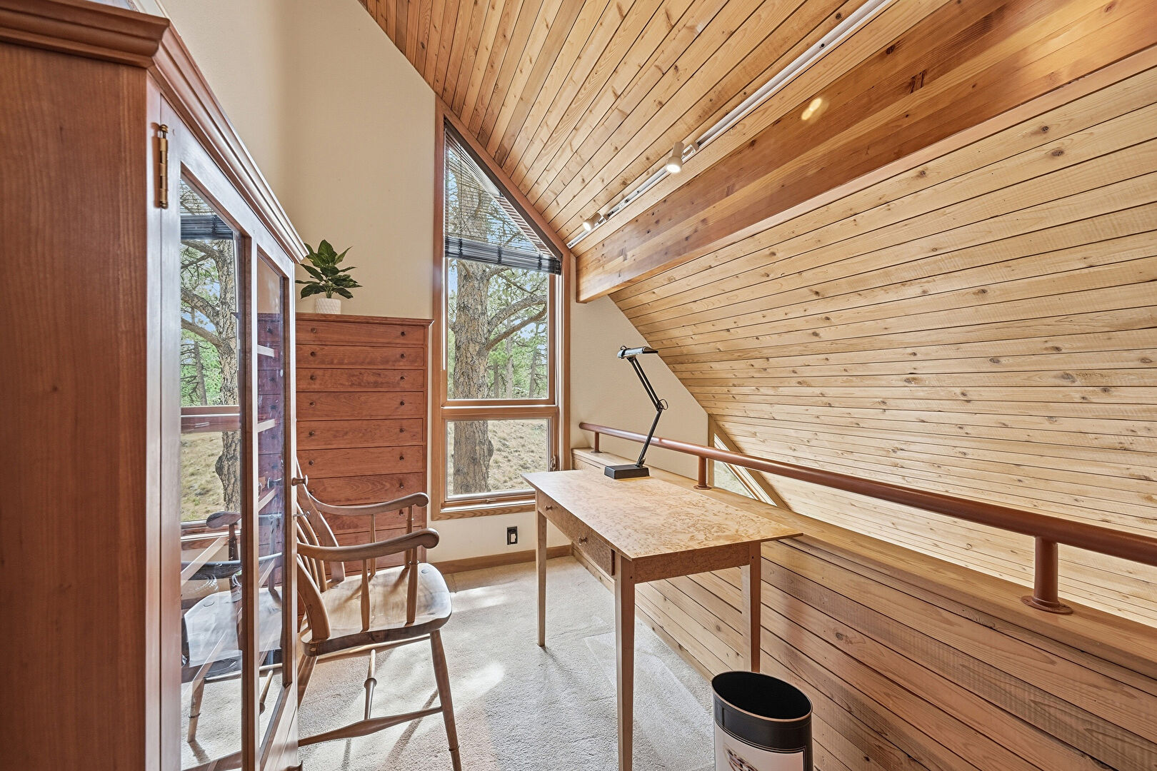 Access To Exterior, Baseboards Wall, Beamed Ceiling, Bonus Room, Built In Desk, Carpet, Cathedral Ceiling, Drywall, Floor Ceiling Windows, High Ceiling, Mountain View, Natural Light, Office Area, Skylight, Vaulted Ceiling, Wood Ceiling, Wood Wall, High Ceiling, Natural Light, Track Lighting, Wood Ceiling, Wood Wall