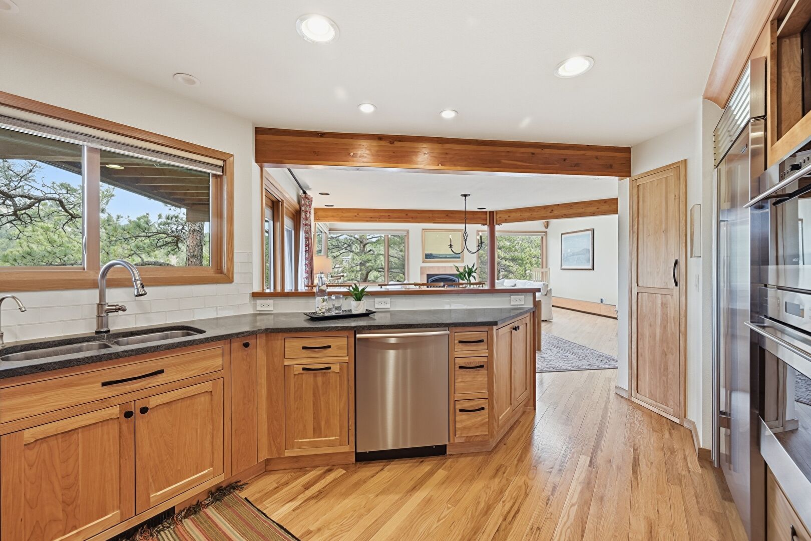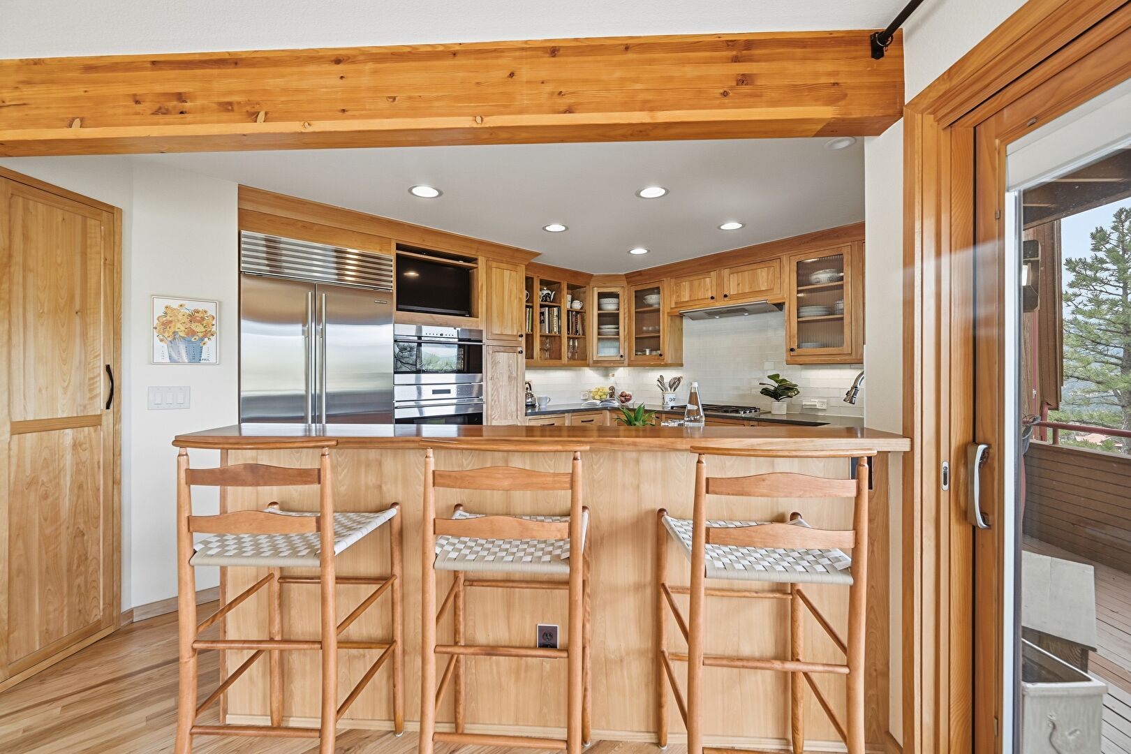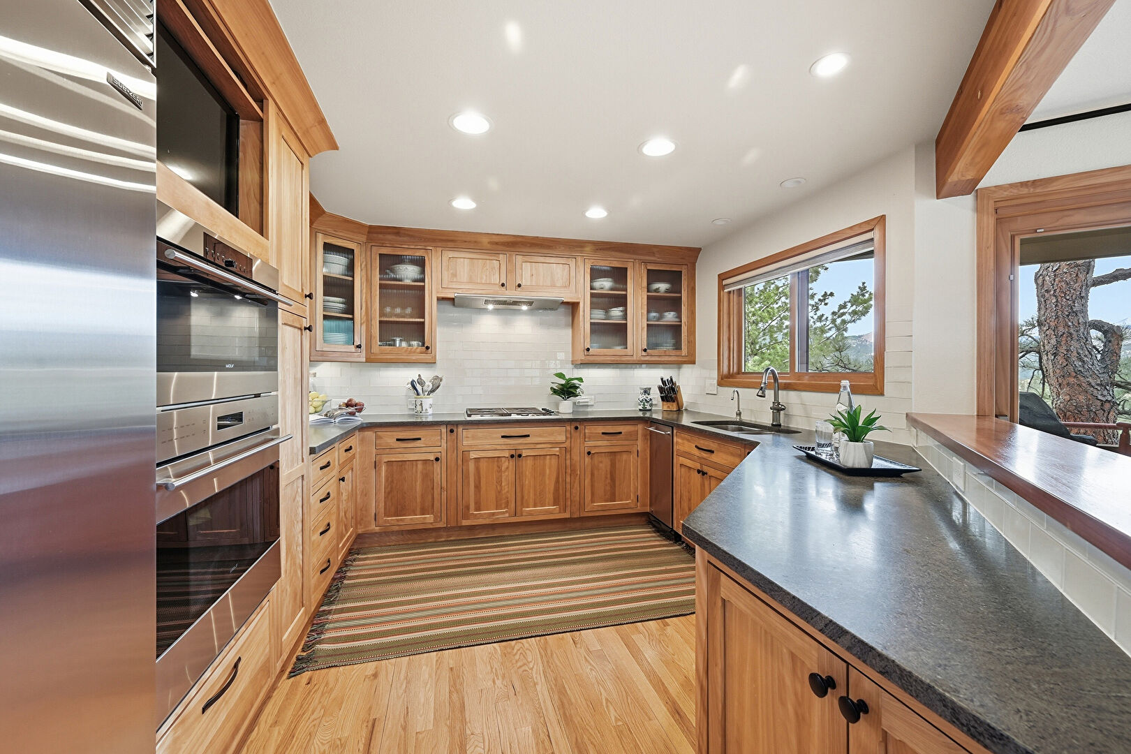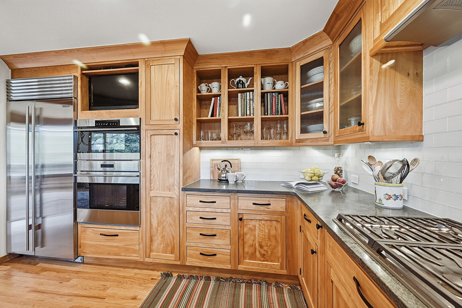 Baseboards Wall, Beamed Ceiling, Butcher Block Countertops, Double Oven, Drywall, Glass Insert Cabinets, Kitchen Bar, Kitchen Peninsula, Medium Brown Cabinets, Natural Light, Pendant Lighting, Raised Cabinets, Recessed Lighting, Shaker Cabinets, Stone Countertops, U Shaped Kitchen, Wood Finish Floor, Crown Molding Cabinets, Natural Light