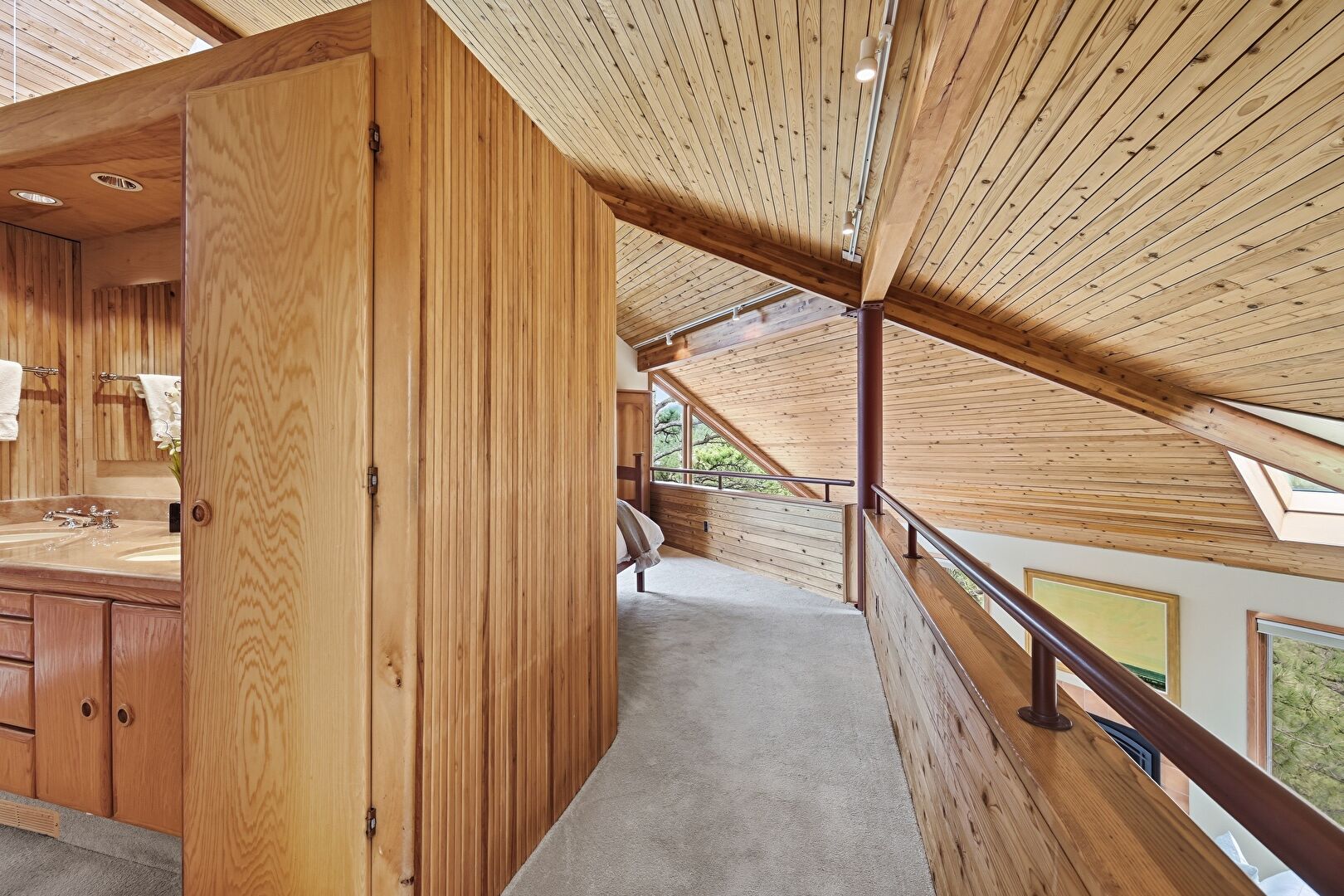 Baseboards Wall, Carpet, Drywall, High Ceiling, Natural Light, Vaulted Ceiling, Wood Ceiling, Wood Wall, Upstairs Landing, Vaulted Ceiling