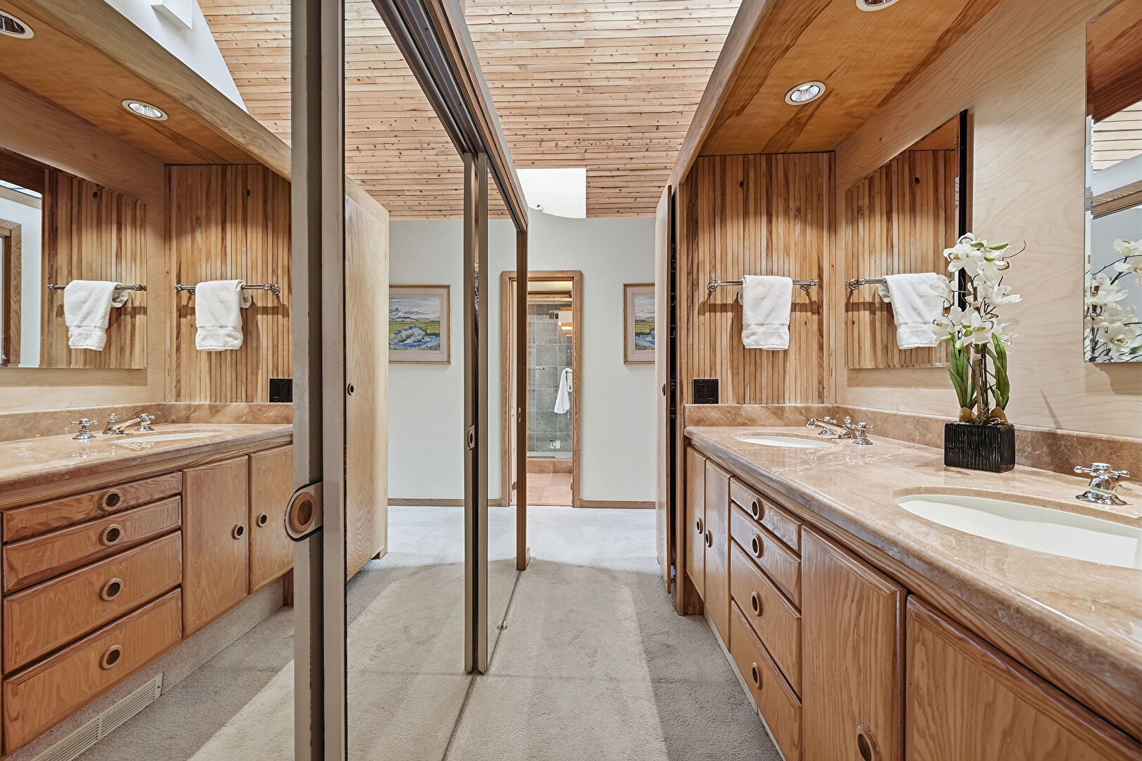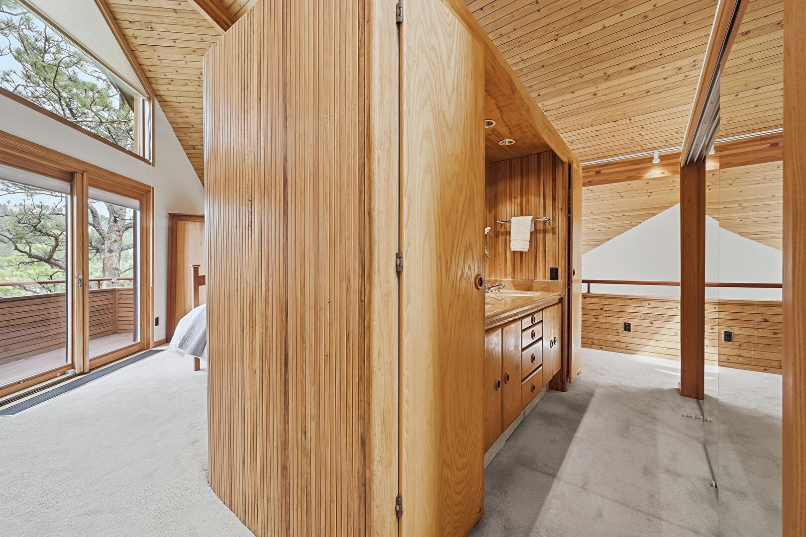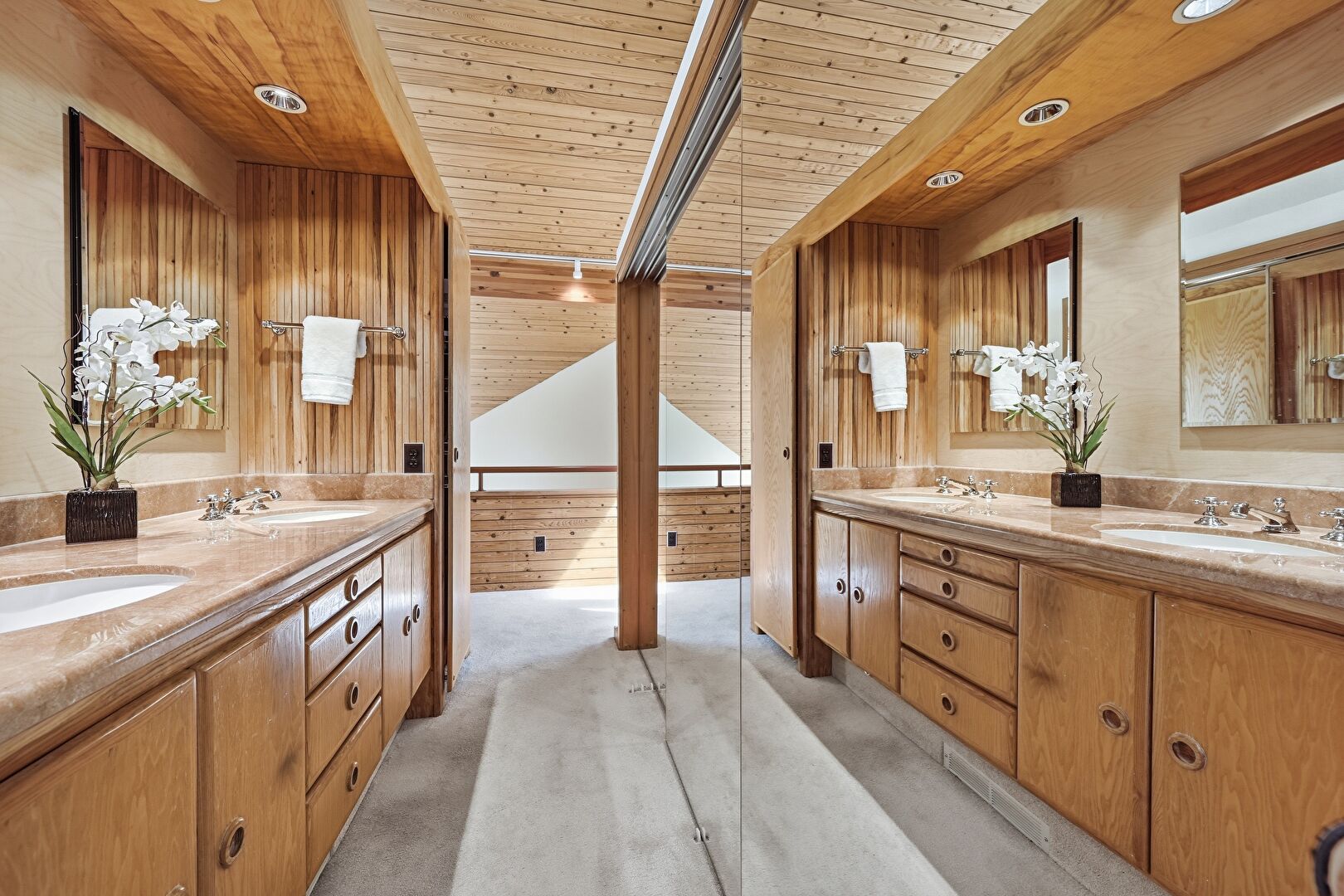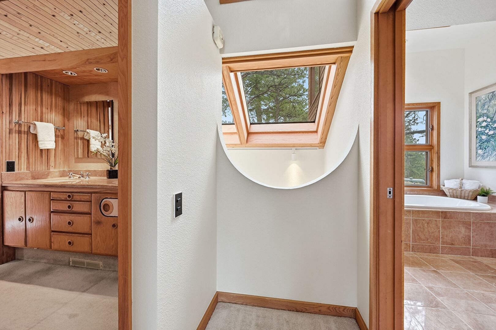 Baseboards Wall, Carpet, Double Vanity, Drywall, Ensuite Bathroom, Full Bathroom, Half Bathroom, High Ceiling, Natural Light, Recessed Lighting, Skylight, Smoke Carbon Monoxide Detector, Textured Wall, Tile Floor, Vanity, Vaulted Ceiling, Vent, Wainscot Wall, Wood Ceiling, Wood Wall, Carpet, Drywall, Full Bathroom, Natural Light, Textured Wall, Tile Floor, Wood Ceiling, Wood Wall
