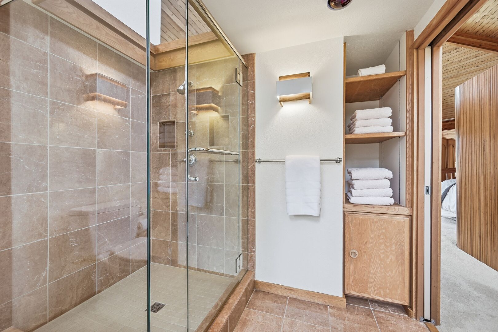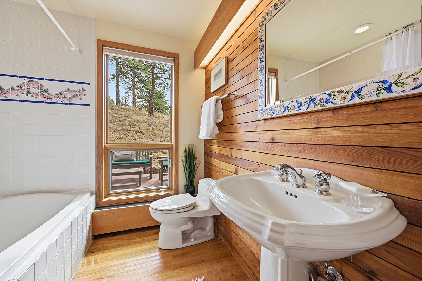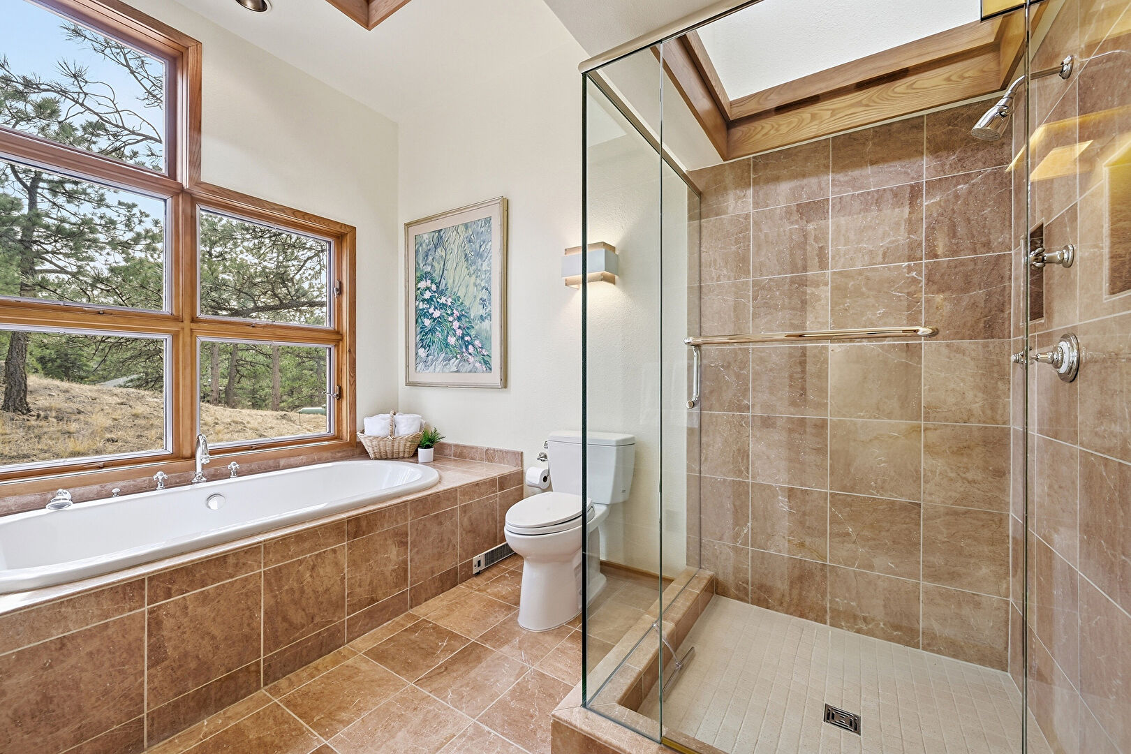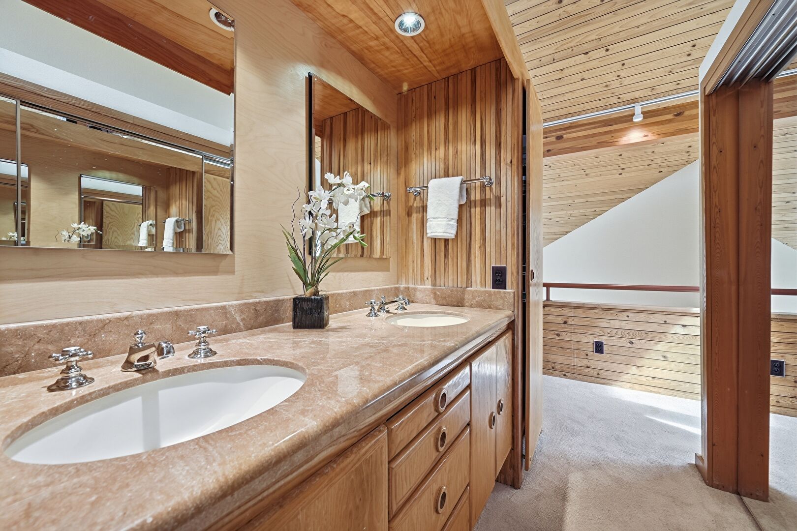 Baseboards Wall, Carpet, Double Vanity, Drywall, Ensuite Bathroom, Full Bathroom, Half Bathroom, High Ceiling, Natural Light, Recessed Lighting, Skylight, Smoke Carbon Monoxide Detector, Textured Wall, Tile Floor, Vanity, Vaulted Ceiling, Vent, Wainscot Wall, Wood Ceiling, Wood Wall, Carpet, Drywall, Full Bathroom, Natural Light, Textured Wall, Tile Floor, Wood Ceiling, Wood Wall