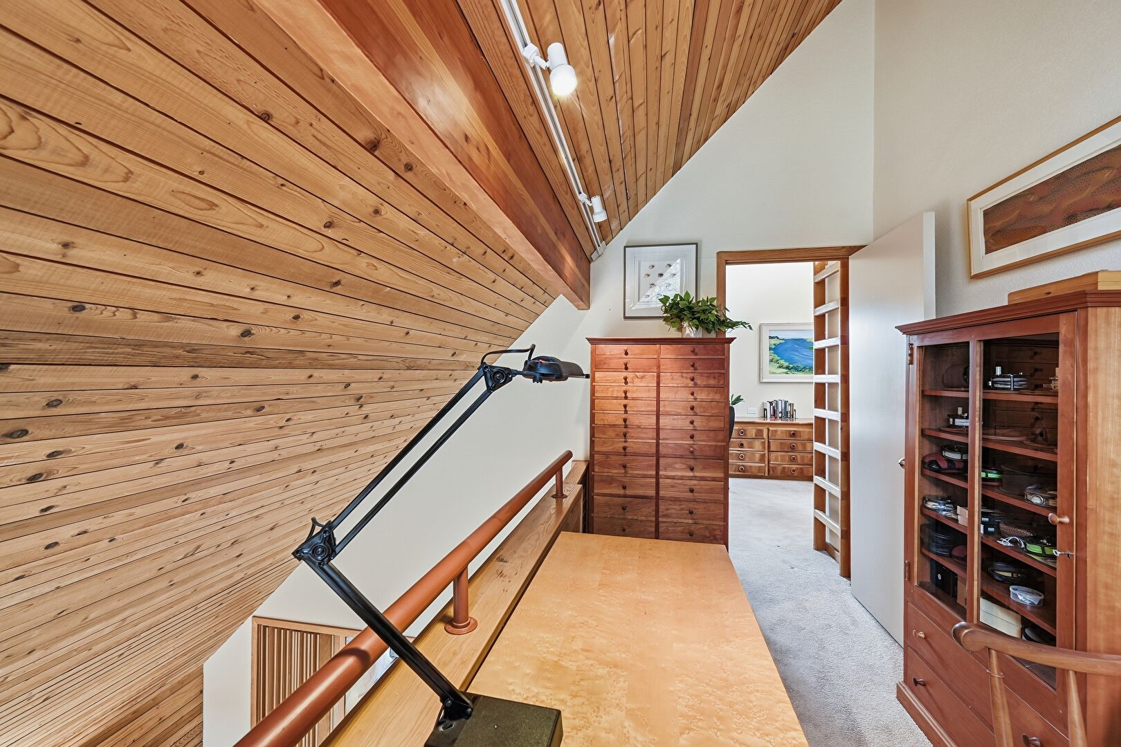Accent Wall, Access To Exterior, Baseboard Radiator, Baseboards Wall, Bonus Room, Carpet, Drywall, High Ceiling, Natural Light, Office Area, Recessed Lighting, Stairs, Vaulted Ceiling, Wood Ceiling, Wood Wall, Carpet, Natural Light, Recessed Lighting, Vaulted Ceiling, Vent, Wood Ceiling, Wood Wall