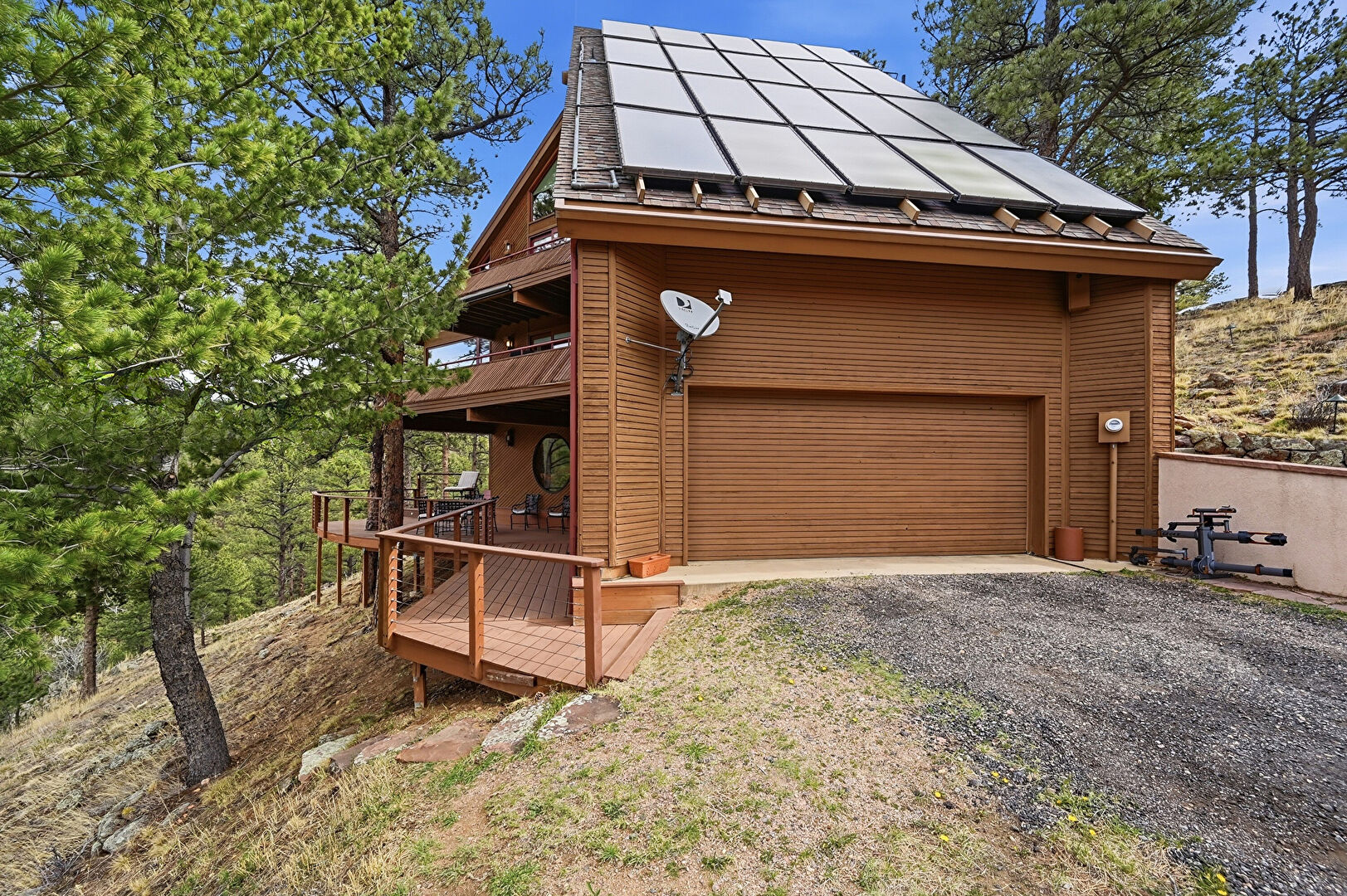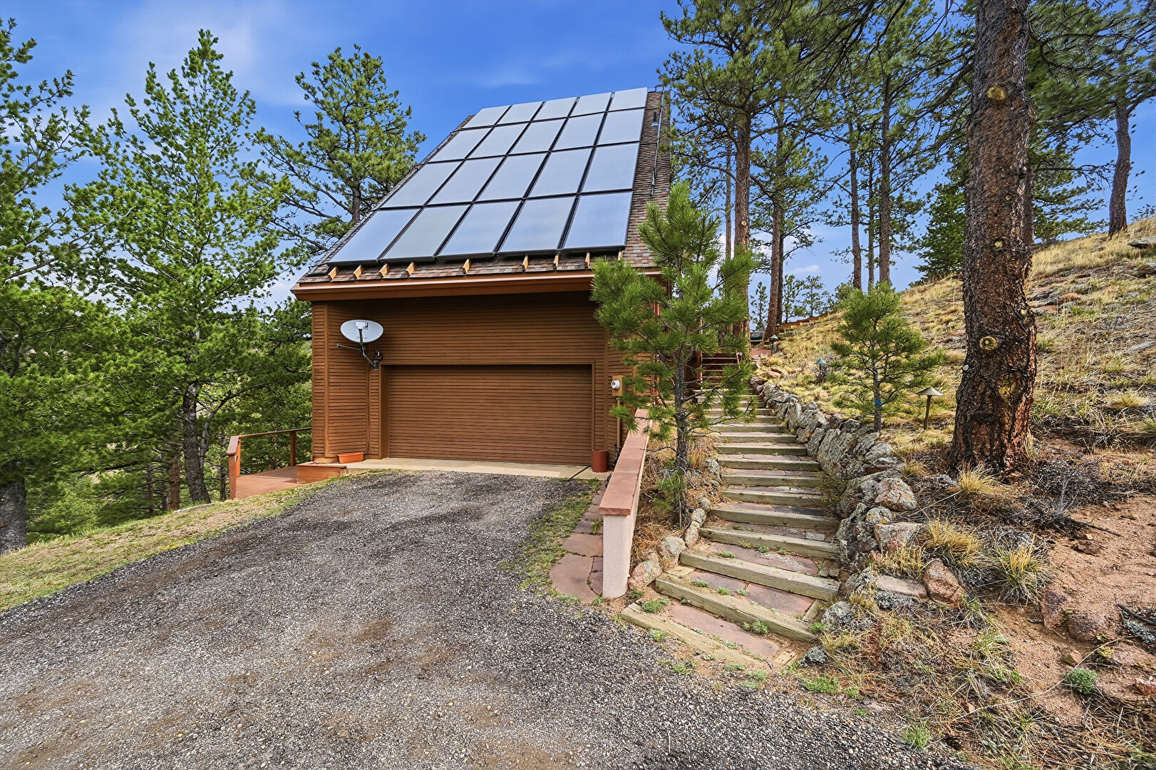 Built In Garage, Driveway, Electric Meter, Garage, Horizontal Siding, Metal Roof, Solar Panels, Stairs, Standing Seam Roof, Satellite Dish, Solar Panels