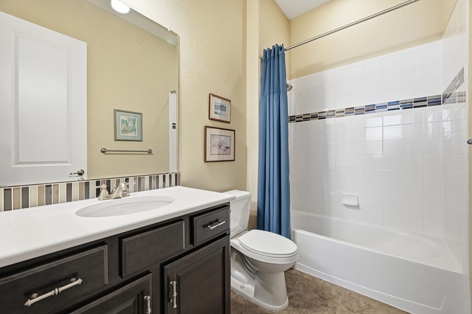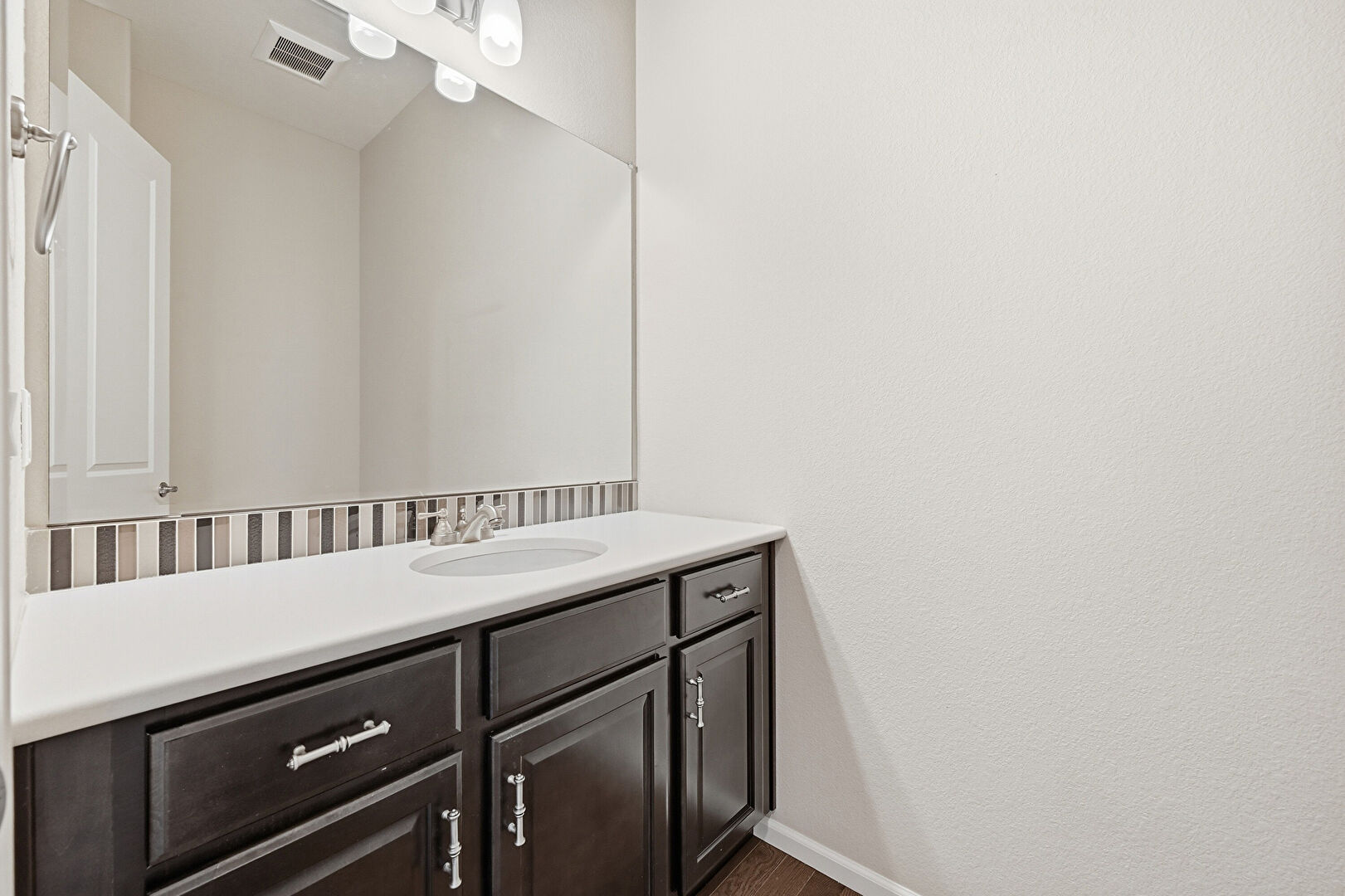 Baseboards Wall, Combined Bath Shower, Half Bathroom, Textured Wall, Tile Floor, Vanity, Vent, Full Bathroom, Wood Finish Floor
