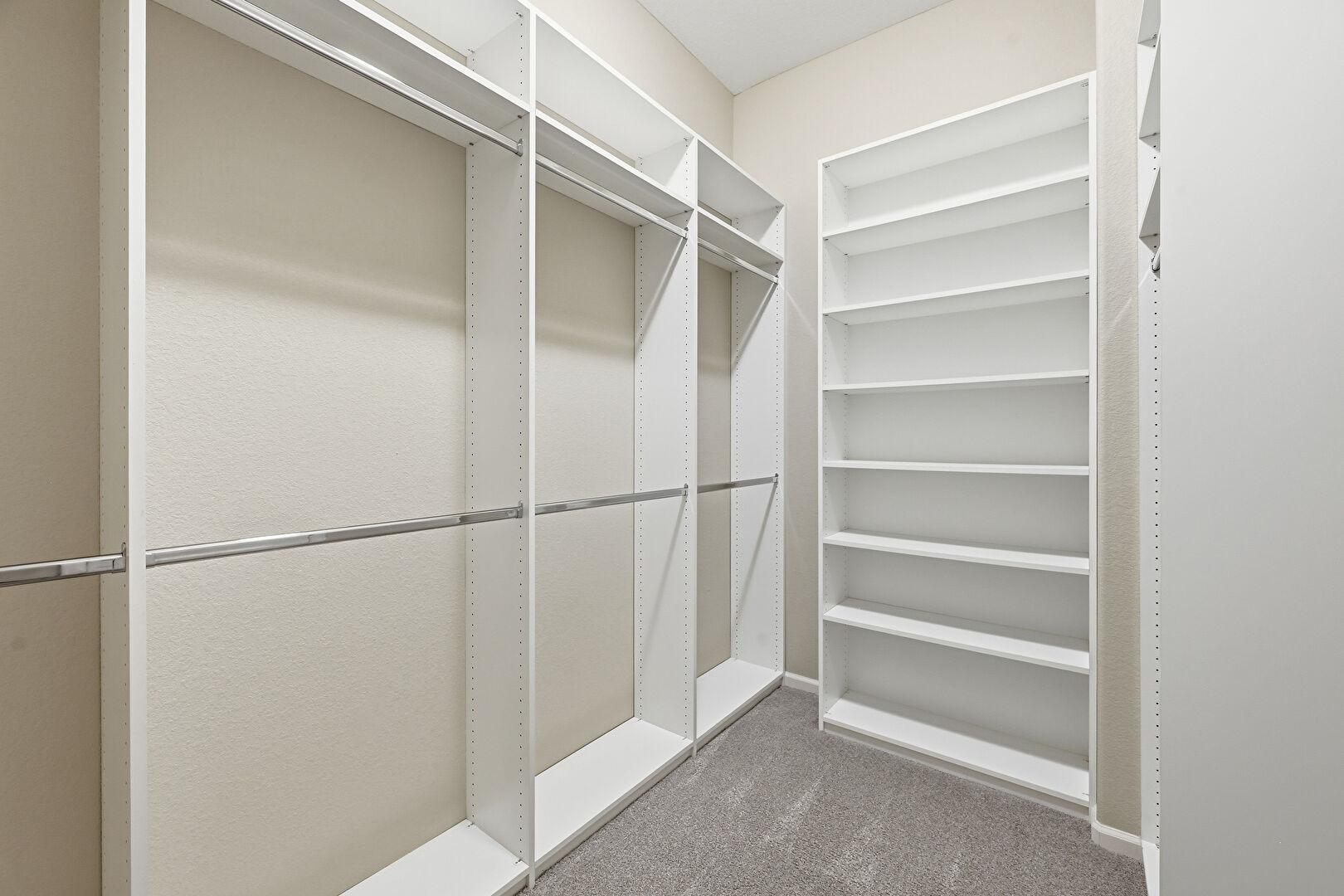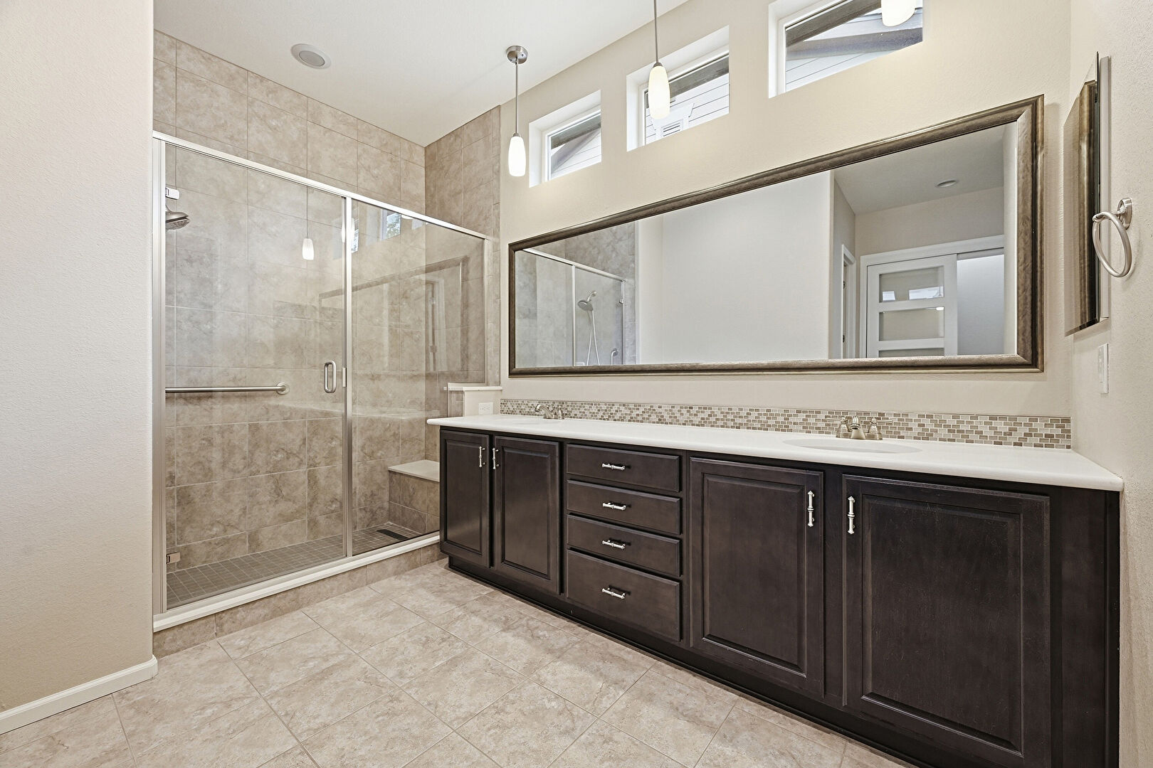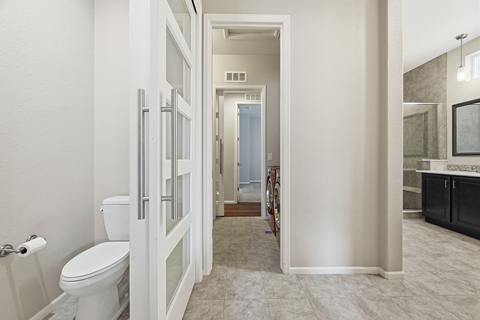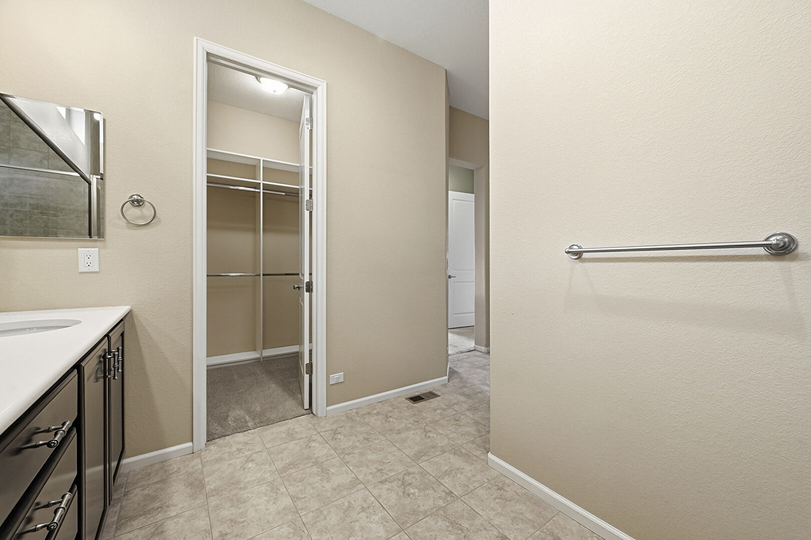 Baseboards Wall, Double Vanity, Drywall, Full Bathroom, Textured Wall, Tile Floor, Vanity, Vent, Walk In Closet, Water Closet, Full Bathroom, Natural Light, Tile Floor