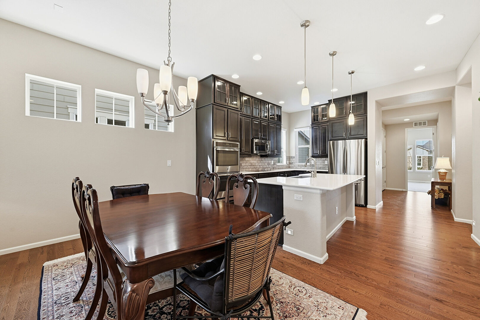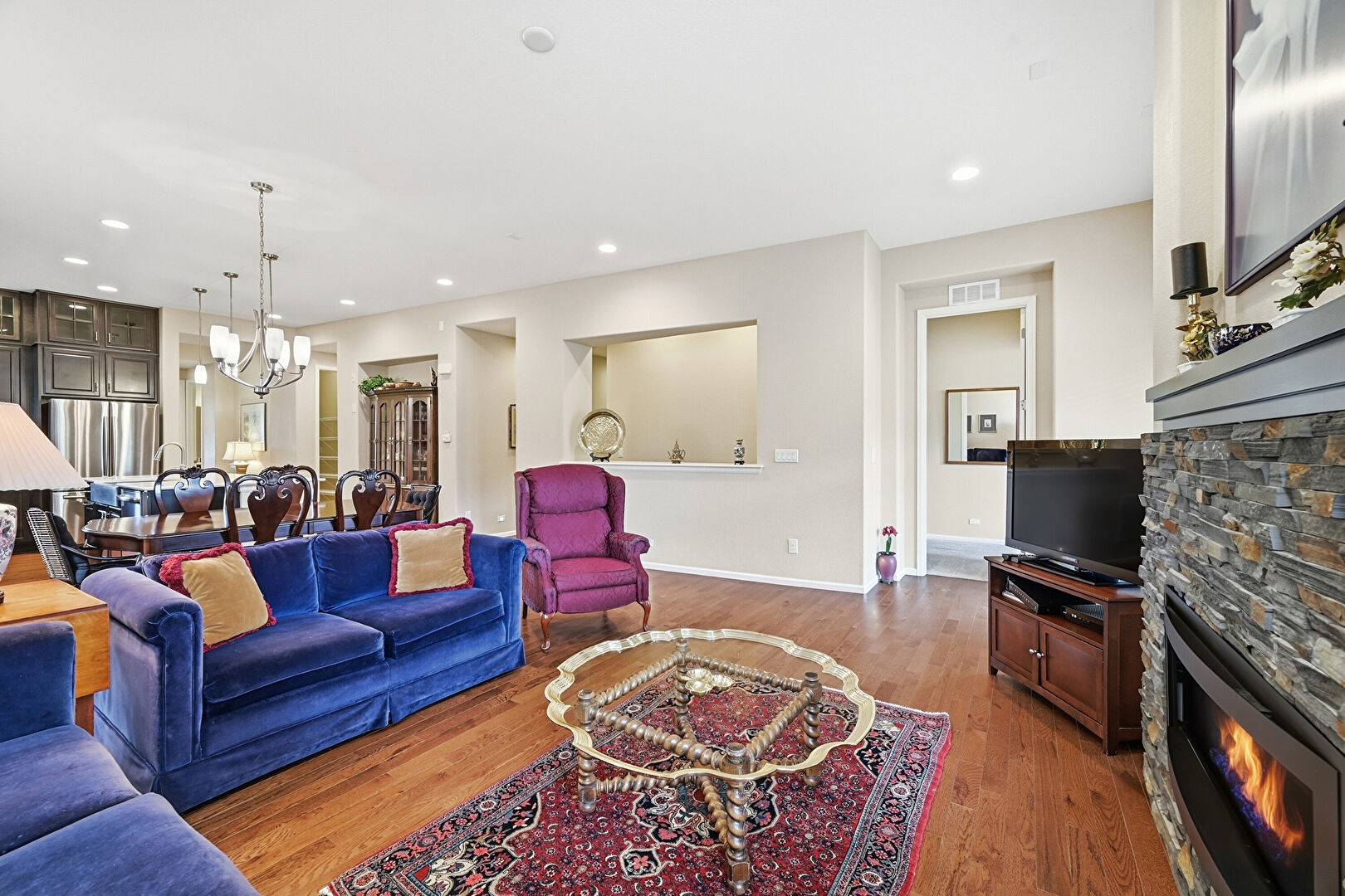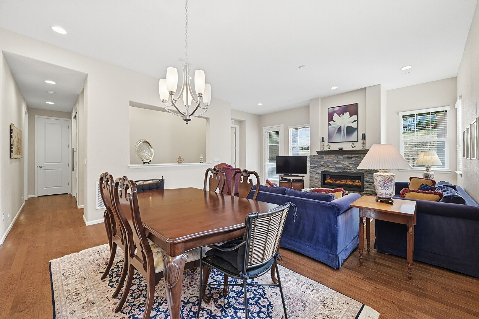 Baseboards Wall, Drywall, Fireplace, L Shaped Kitchen, Natural Light, Notable Chandelier, Recessed Lighting, Vent, Wood Finish Floor, Double Oven, Wood Finish Floor