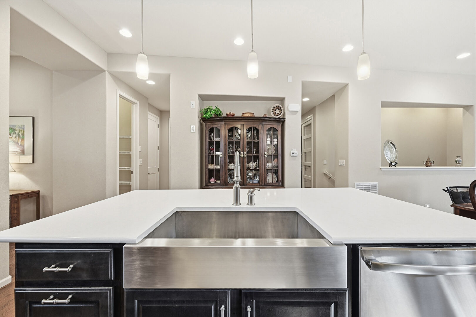 Baseboards Wall, Black Cabinets, Dark Brown Cabinets, Double Oven, Drywall, Glass Insert Cabinets, Kitchen Bar, Kitchen Island, L Shaped Kitchen, Natural Light, Notable Chandelier, Opens To Living Area, Pendant Lighting, Raised Cabinets, Recessed Lighting, Stone Countertops, Vent, Warming Drawer, Wood Finish Floor, Drywall, Fireplace, Kitchen Island, Natural Light, Vent