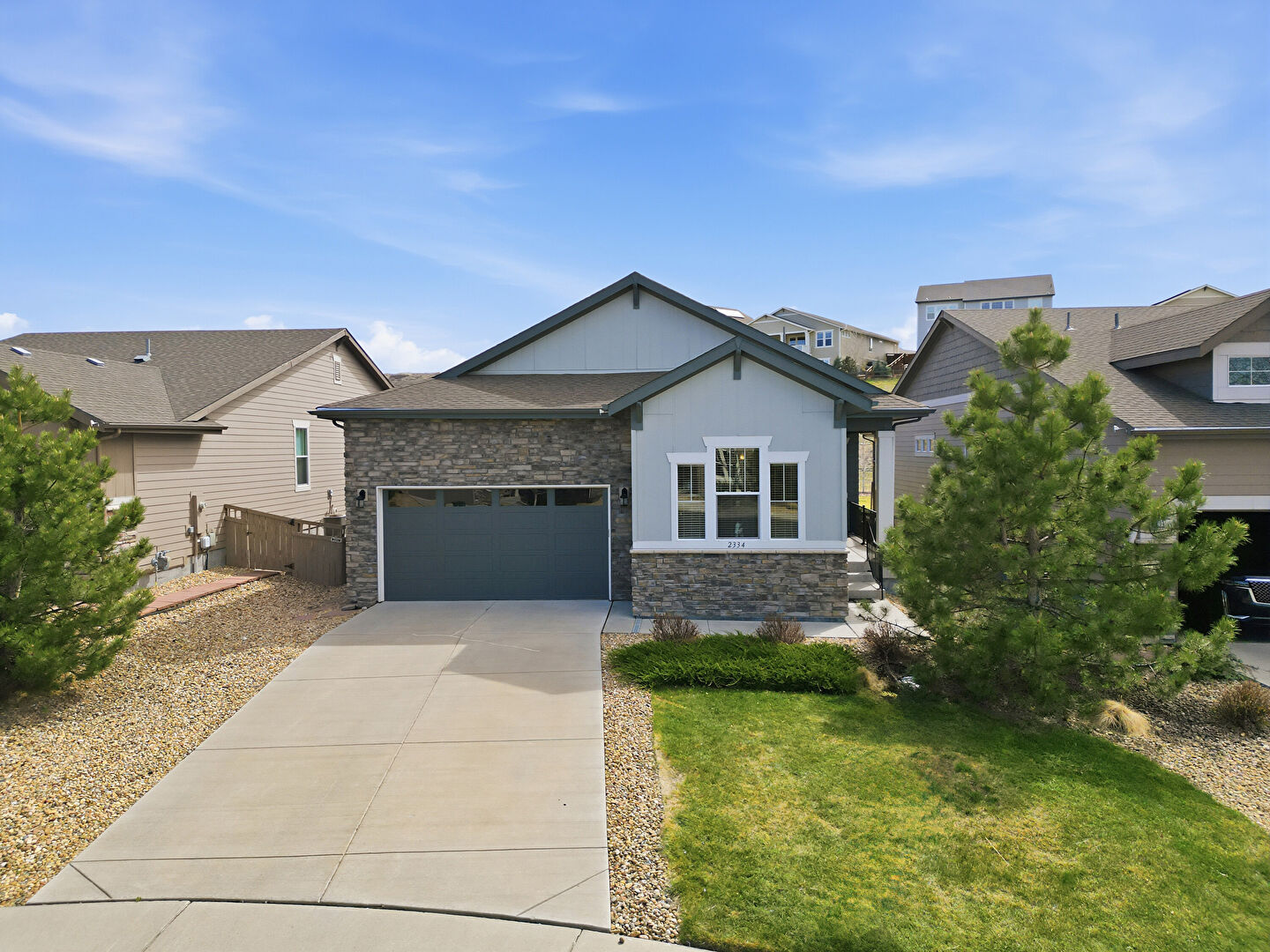 Board Batten Siding, Concrete Foundation, Downspout, Driveway, Fence, Gutters, Lawn, Stone Siding, Vertical Siding, Horizontal Siding, Lawn, Vertical Siding