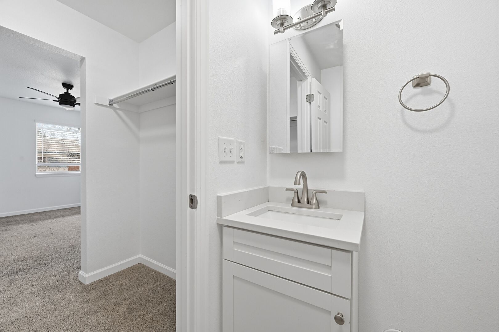 Baseboards Wall, Ceiling Fan, Drywall, Half Bathroom, Natural Light, Vanity, Vent, Walk In Closet, Carpet, Full Bathroom