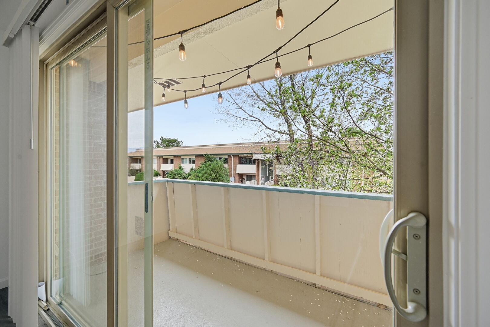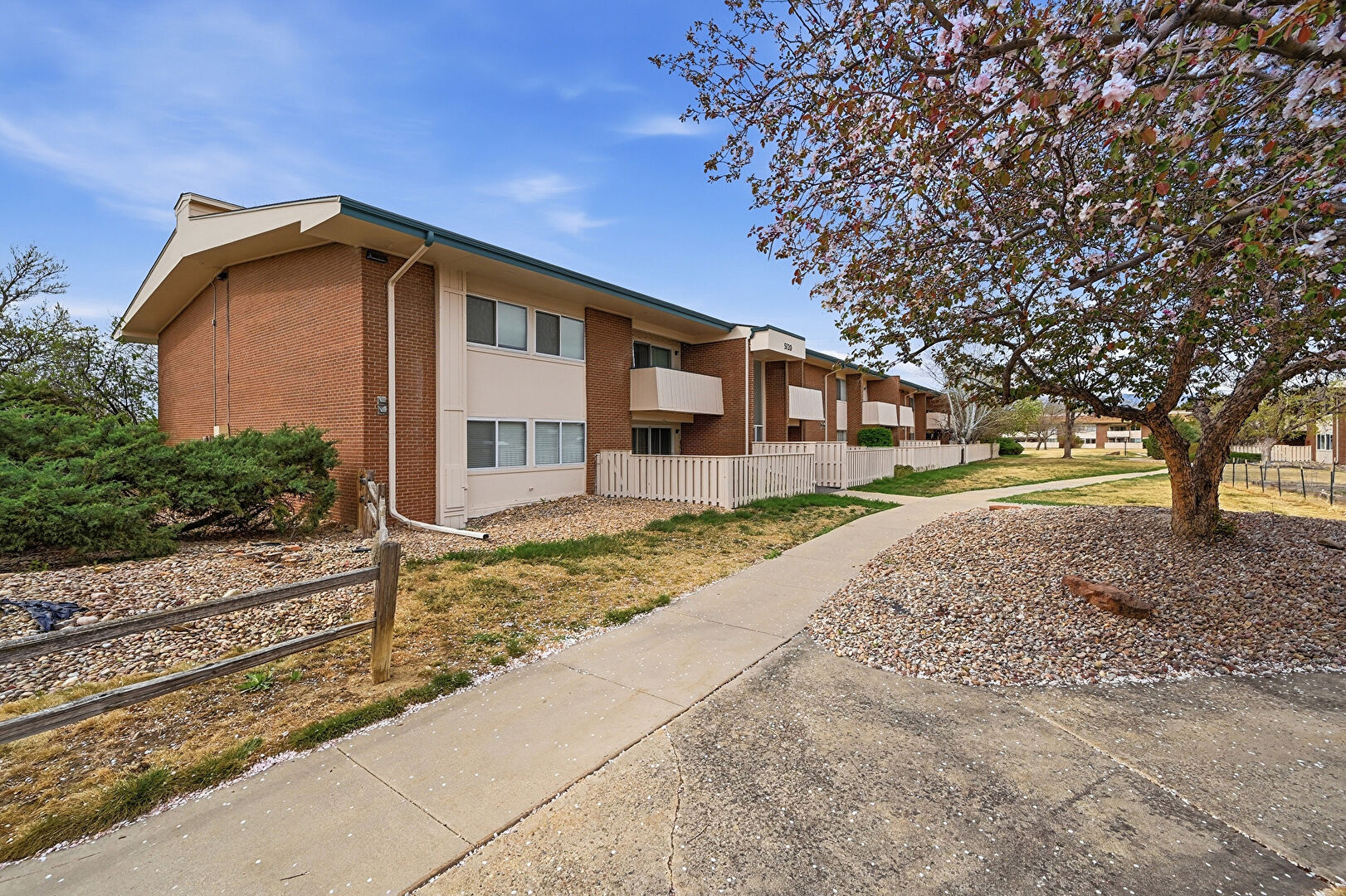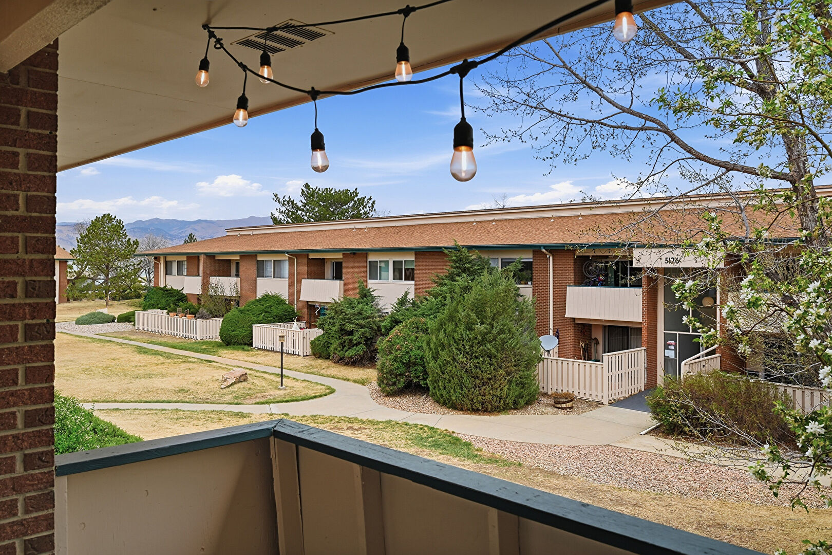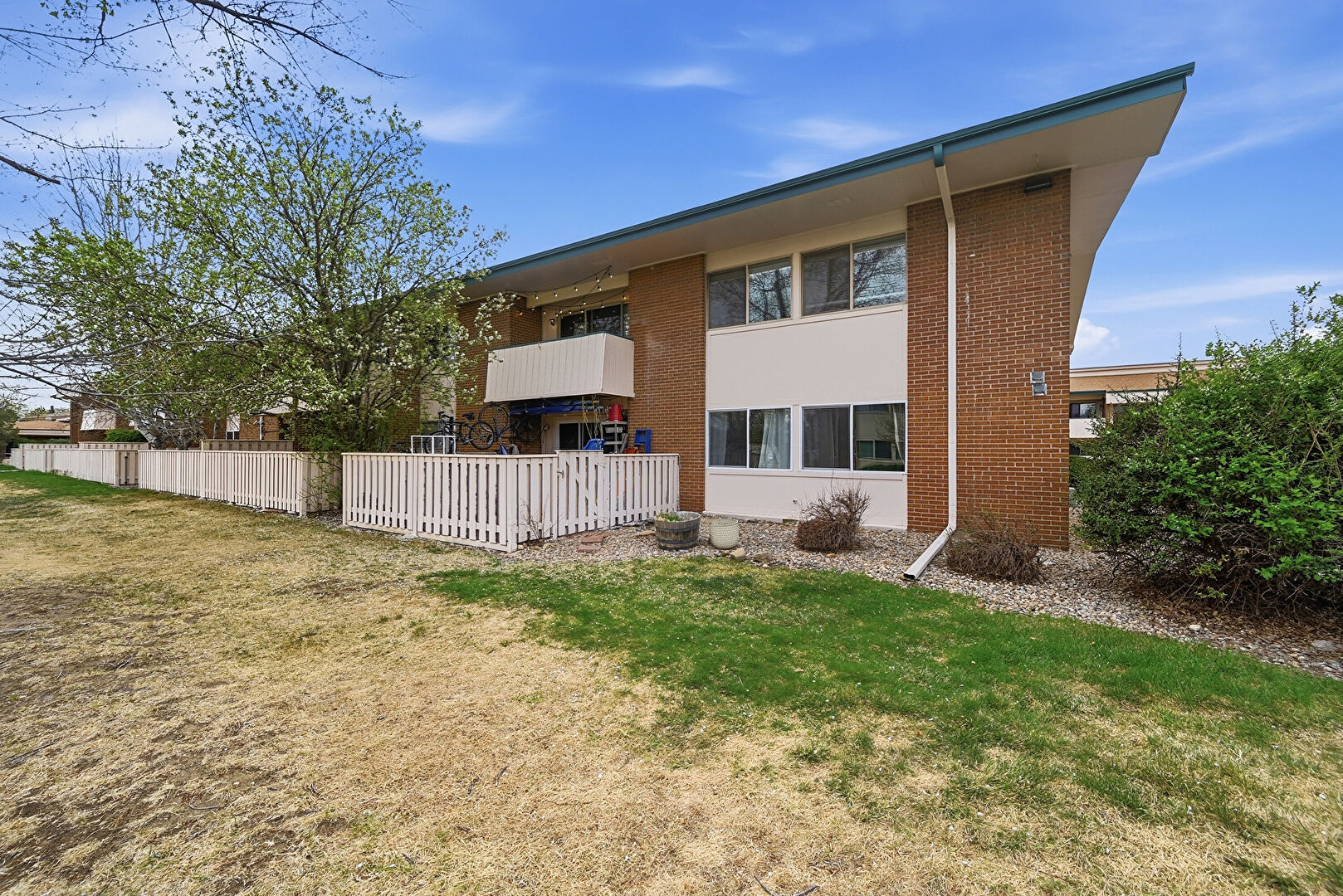 Apartment Complex View, Brick Siding, Downspout, Fence, Lawn, Balcony, Fence