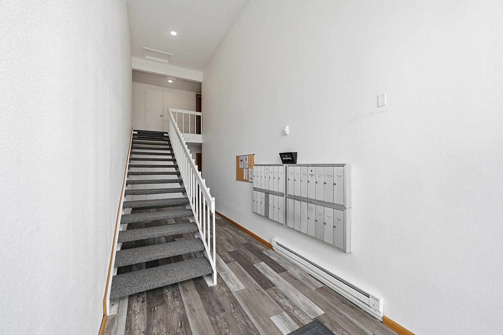Baseboard Radiator, Baseboards Wall, Drywall, Recessed Lighting, Stairs, Wood Finish Floor, Mail Area