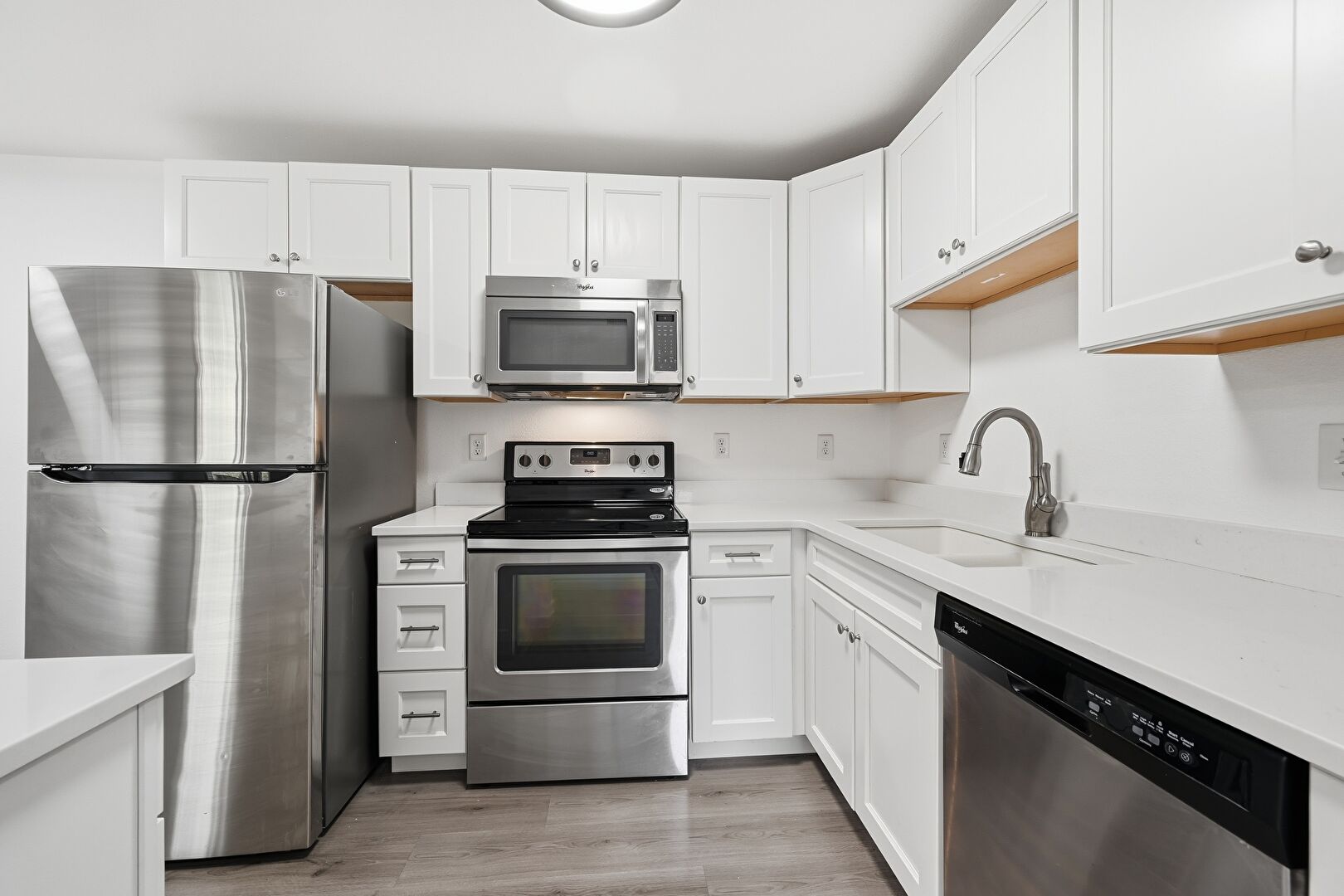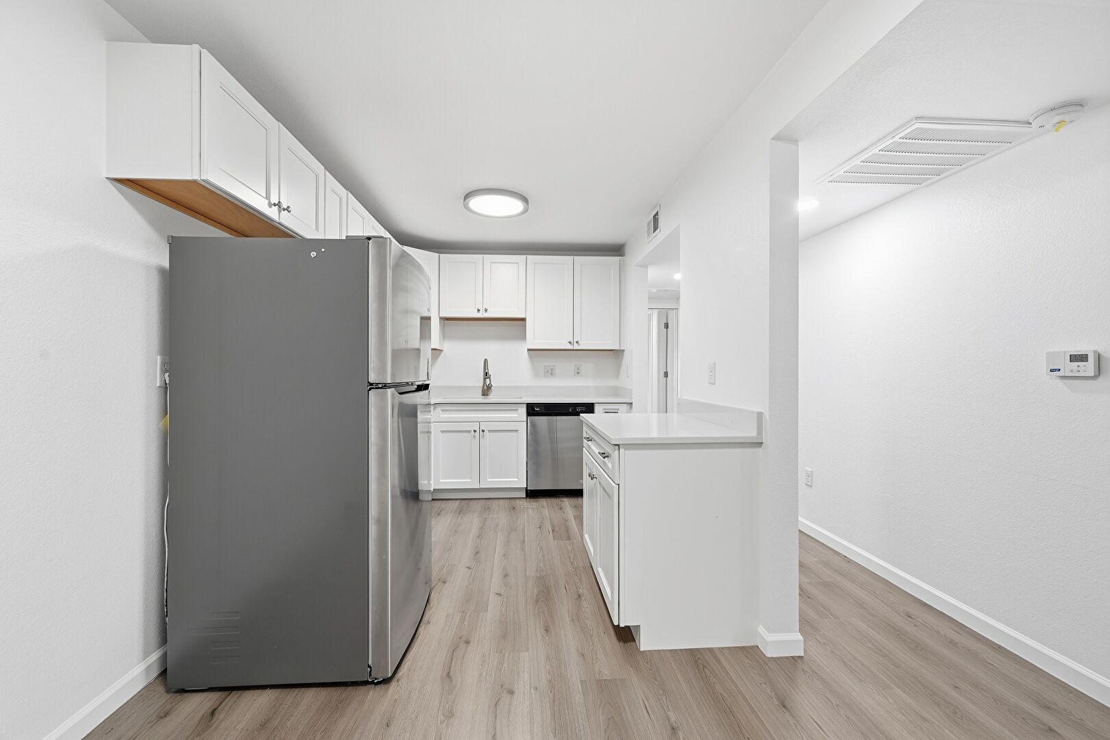 Baseboards Wall, Drywall, Electric Panel, Kitchen Peninsula, L Shaped Kitchen, Pass Through Window, Recessed Lighting, Shaker Cabinets, Stone Countertops, Vent, Wood Finish Floor, Baseboards Wall, Drywall, Wood Finish Floor