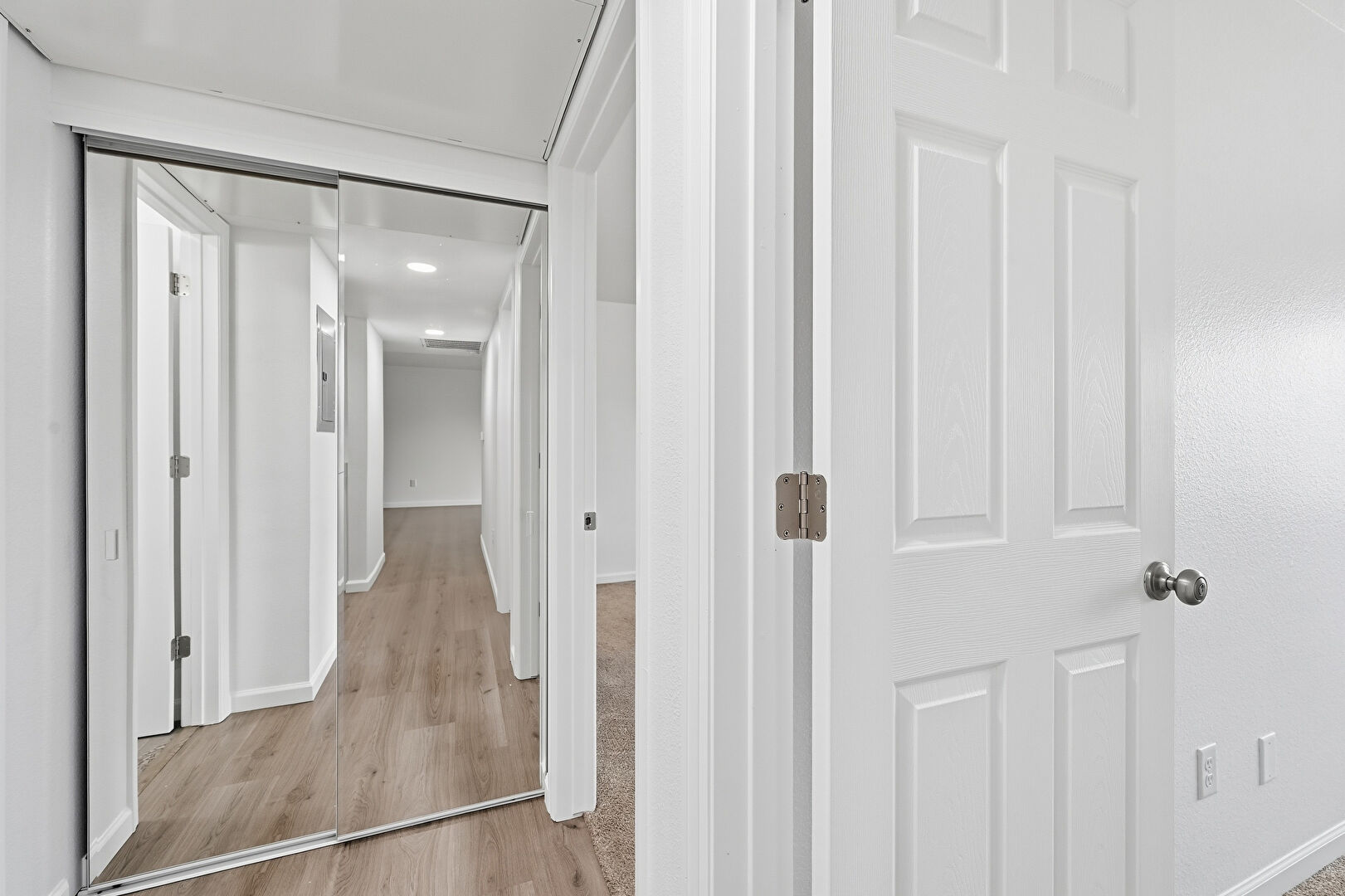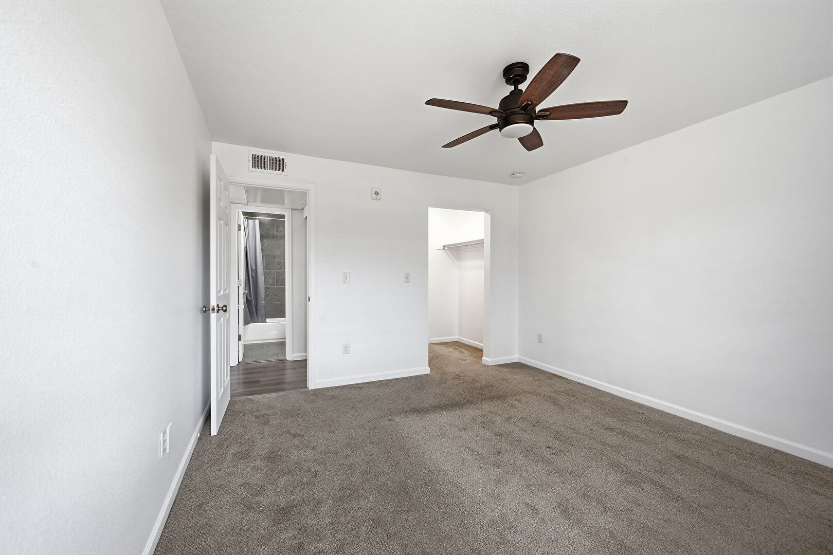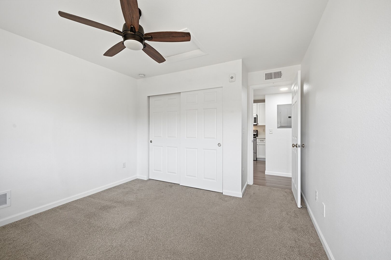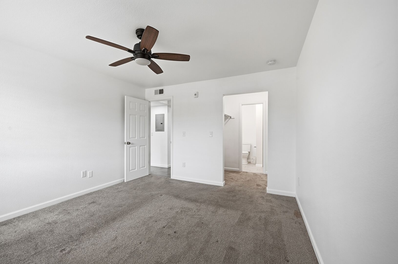 Baseboards Wall, Carpet, Ceiling Fan, Drywall, Electric Panel, Vent, Carpet, Natural Light, Walk In Closet