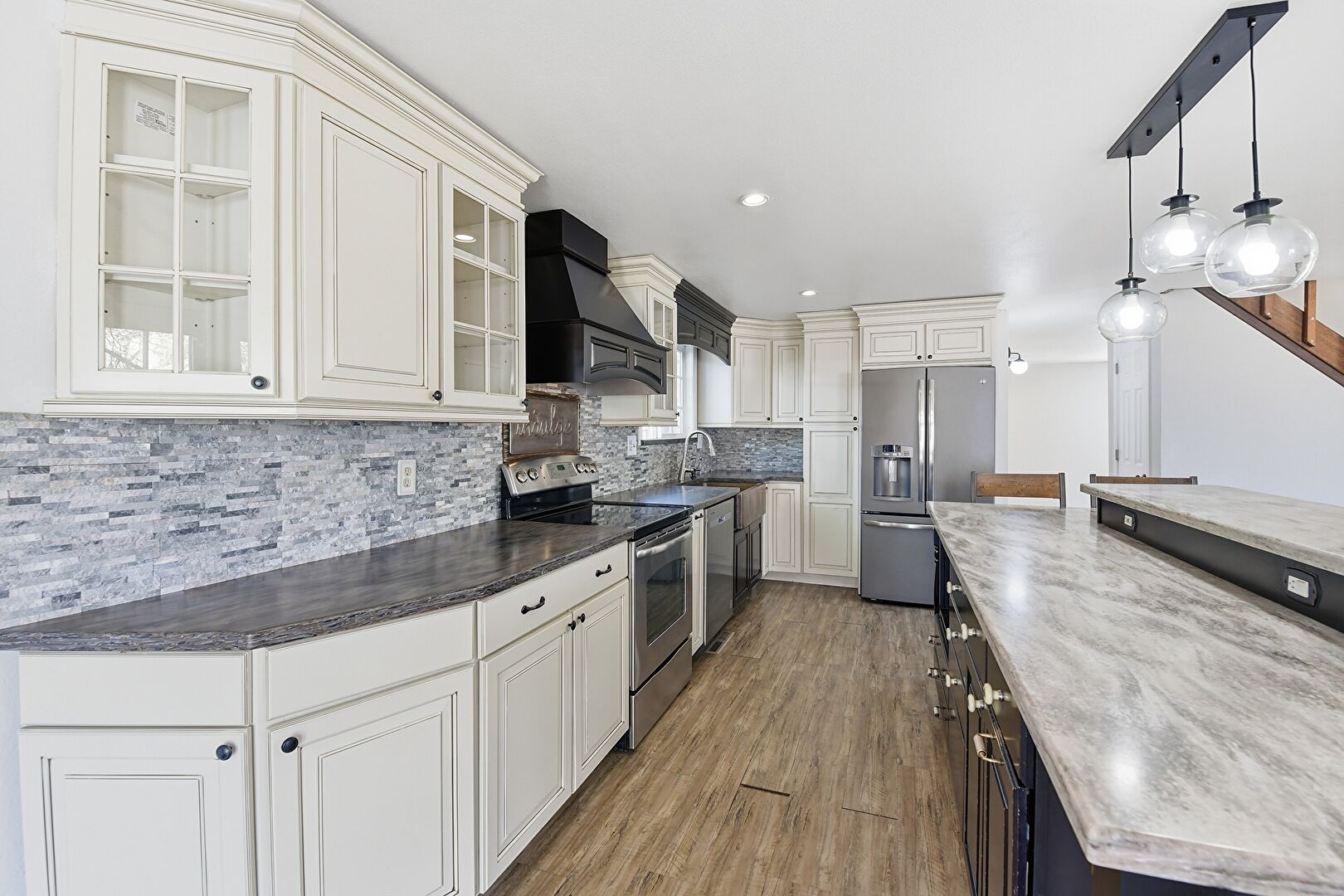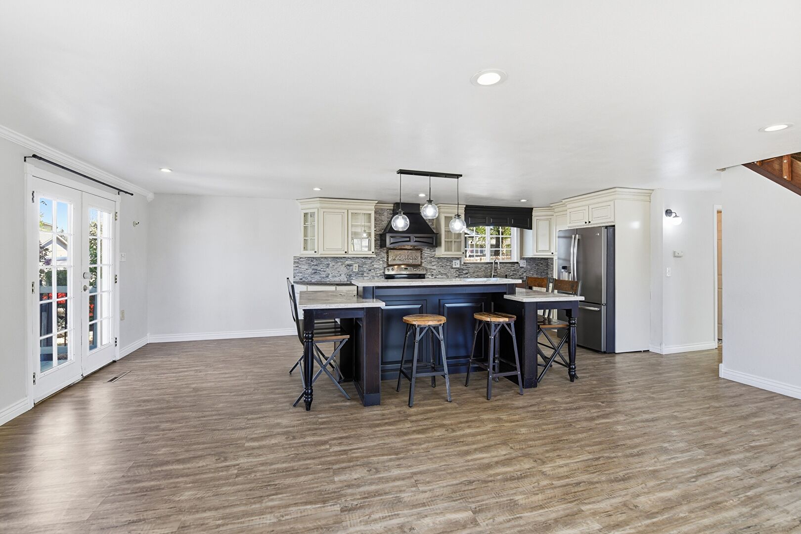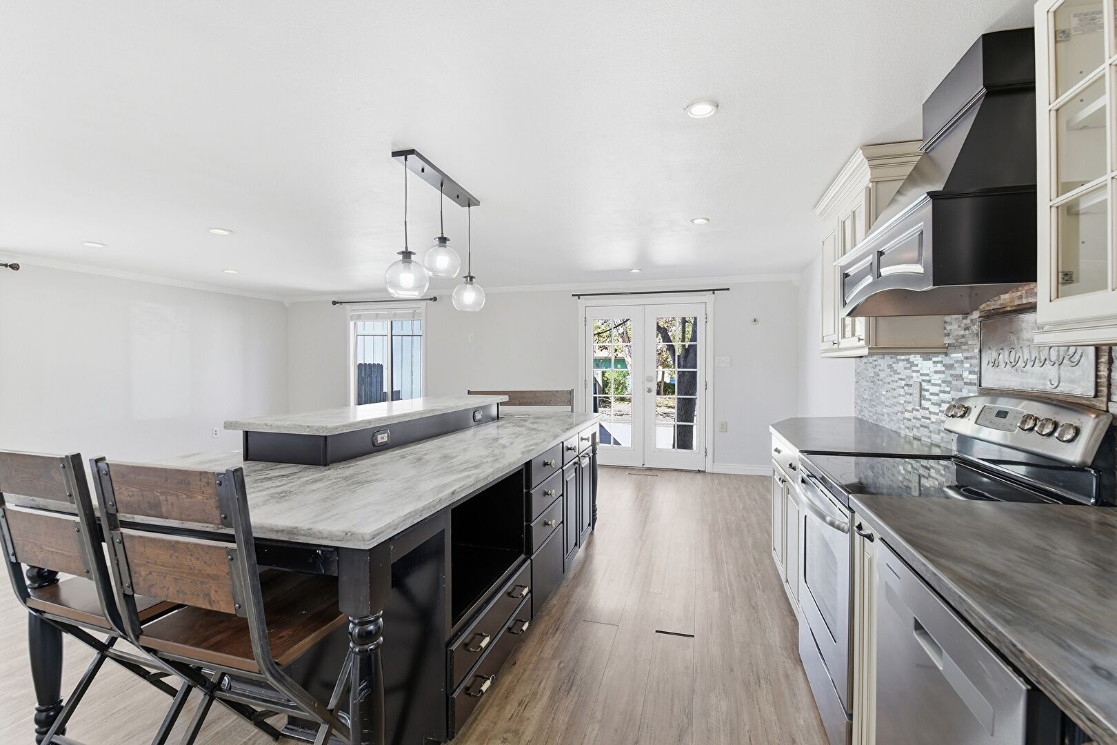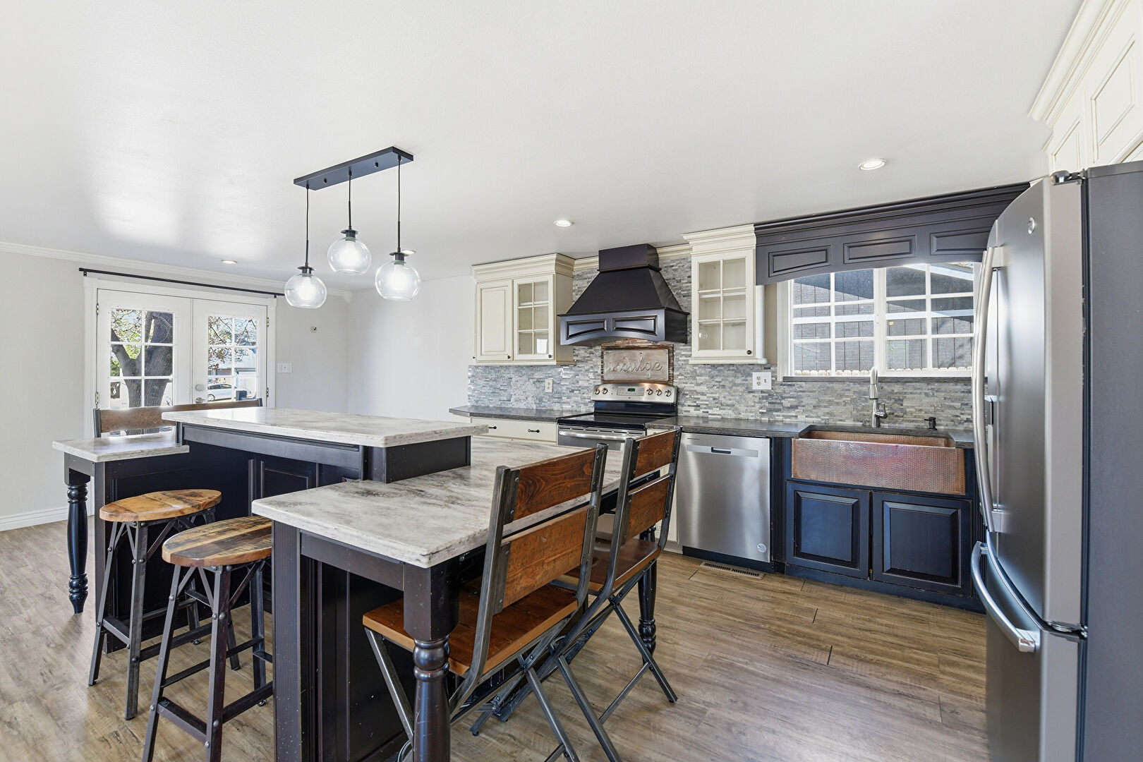 Baseboards Wall, Black Cabinets, Blue Cabinets, Cream Cabinets, Crown Molding, Crown Molding Cabinets, Dark Brown Cabinets, Drywall, French Doors, Glass Insert Cabinets, Kitchen Bar, Kitchen Island, L Shaped Kitchen, Natural Light, Opens To Living Area, Pendant Lighting, Raised Cabinets, Recessed Lighting, Shaker Cabinets, Stone Countertops, Wood Finish Floor, Crown Molding Cabinets, French Doors, Recessed Lighting, Stone Countertops