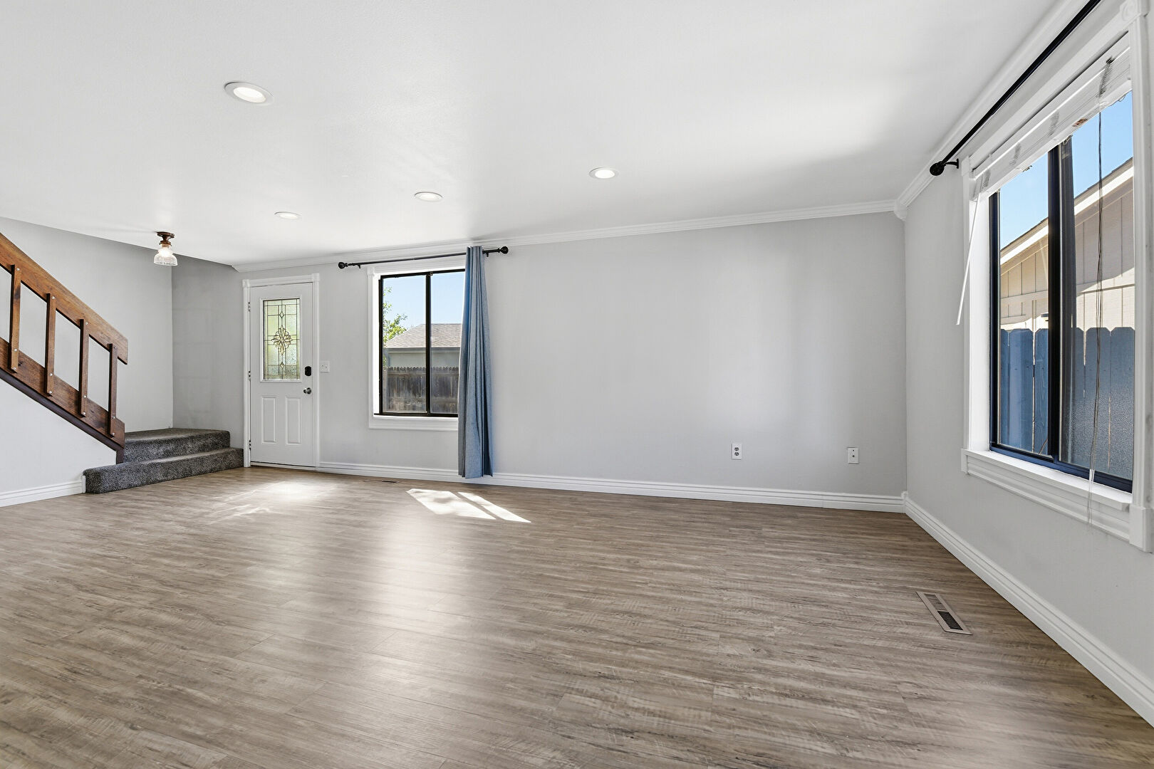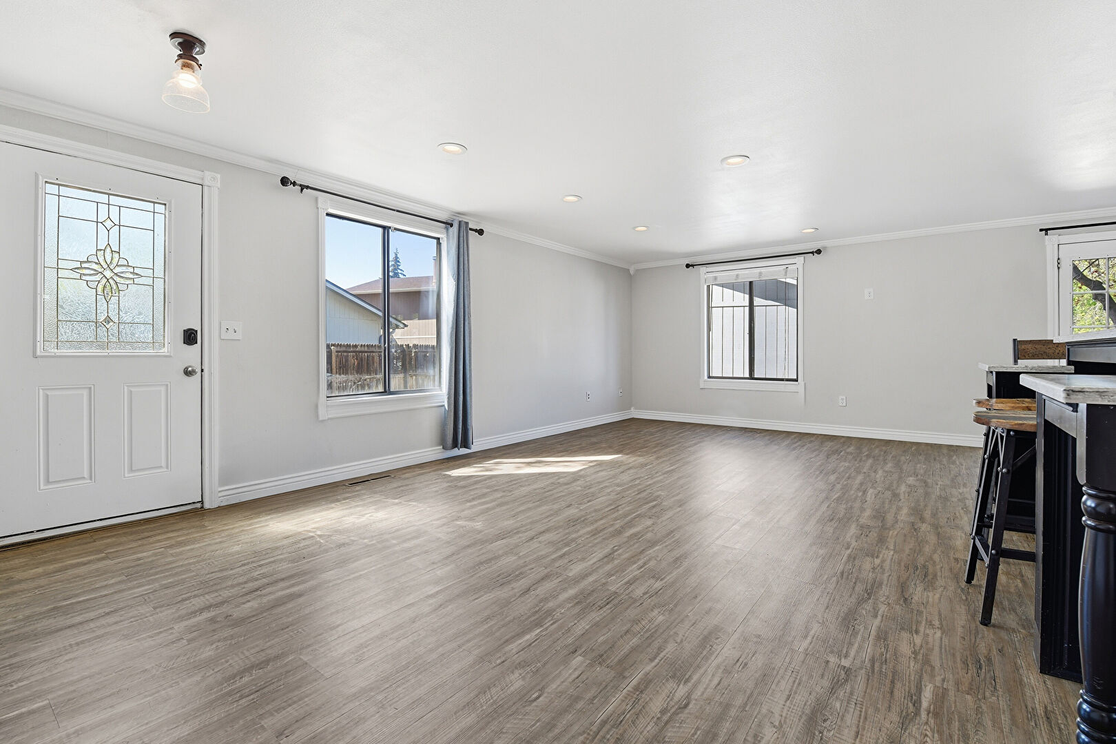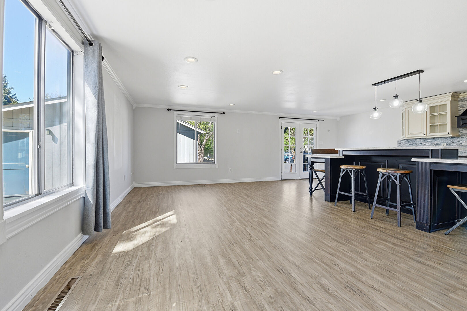 Baseboards Wall, Crown Molding, Drywall, French Doors, Indoor Bar, Natural Light, Recessed Lighting, Stairs, Vent, Wood Finish Floor, Baseboards Wall, Recessed Lighting, Vent