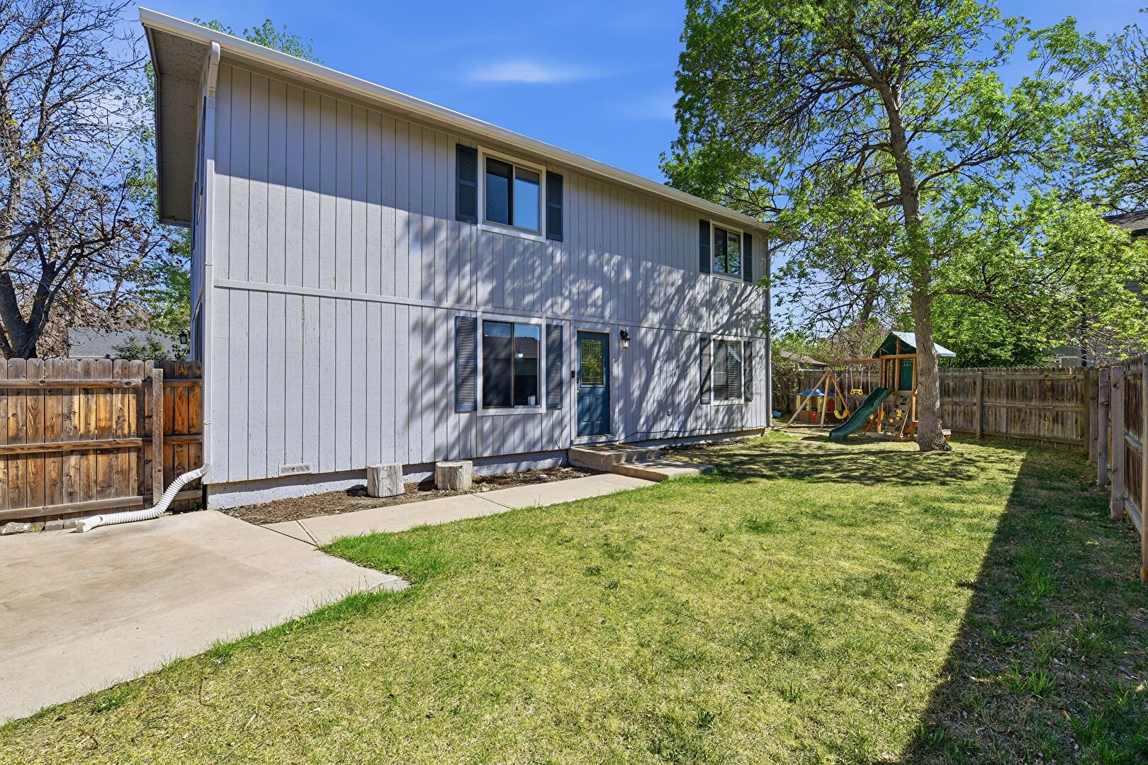 Concrete Foundation, Downspout, Fence, Gutters, Lawn, Patio, Playground, Shed, Vertical Siding, Concrete Foundation, Outdoor Structure