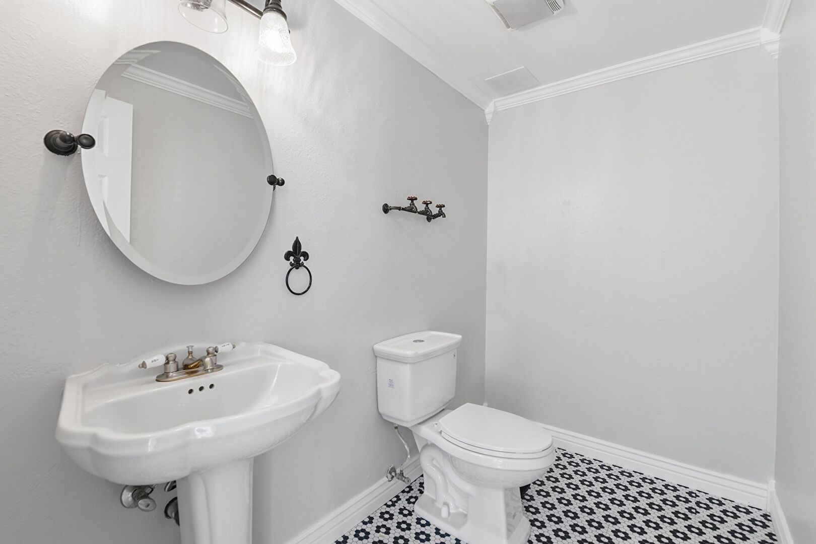 Crown Molding, Drywall, Full Bathroom, Half Bathroom, Tile Floor, Vanity, Vent, Baseboards Wall, Combined Bath Shower