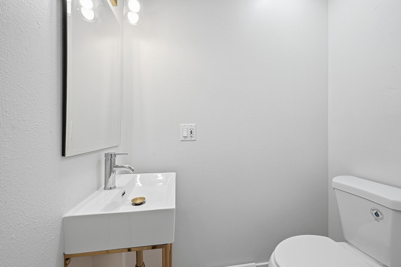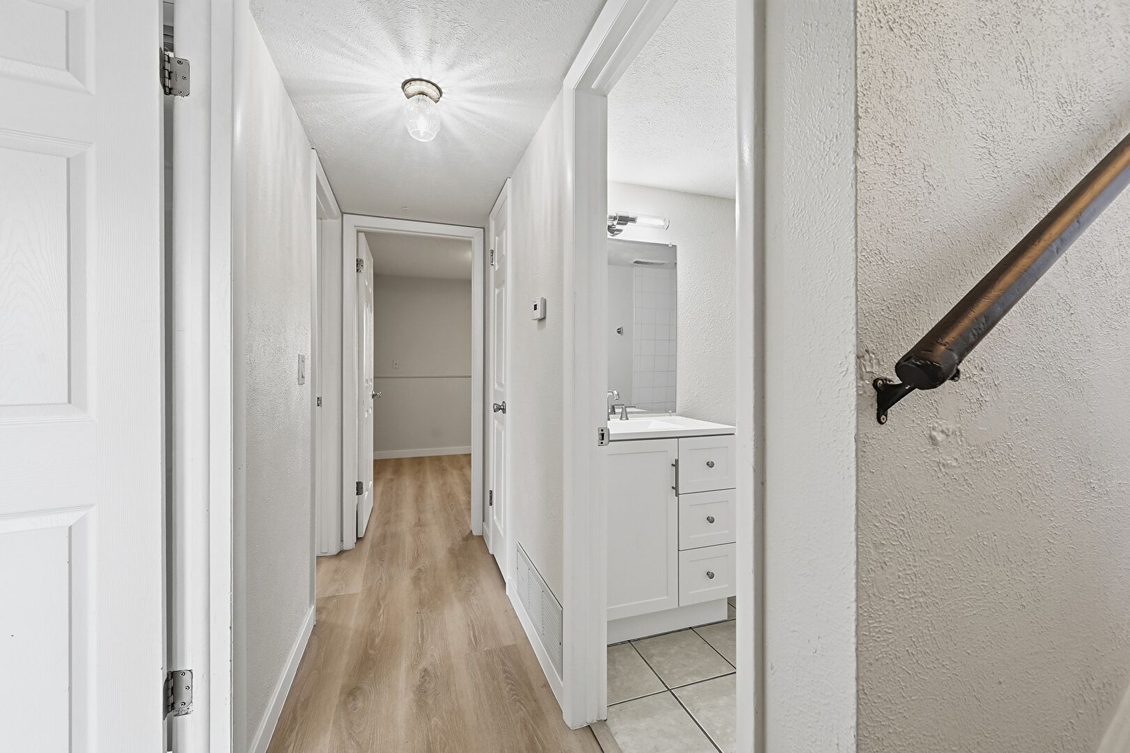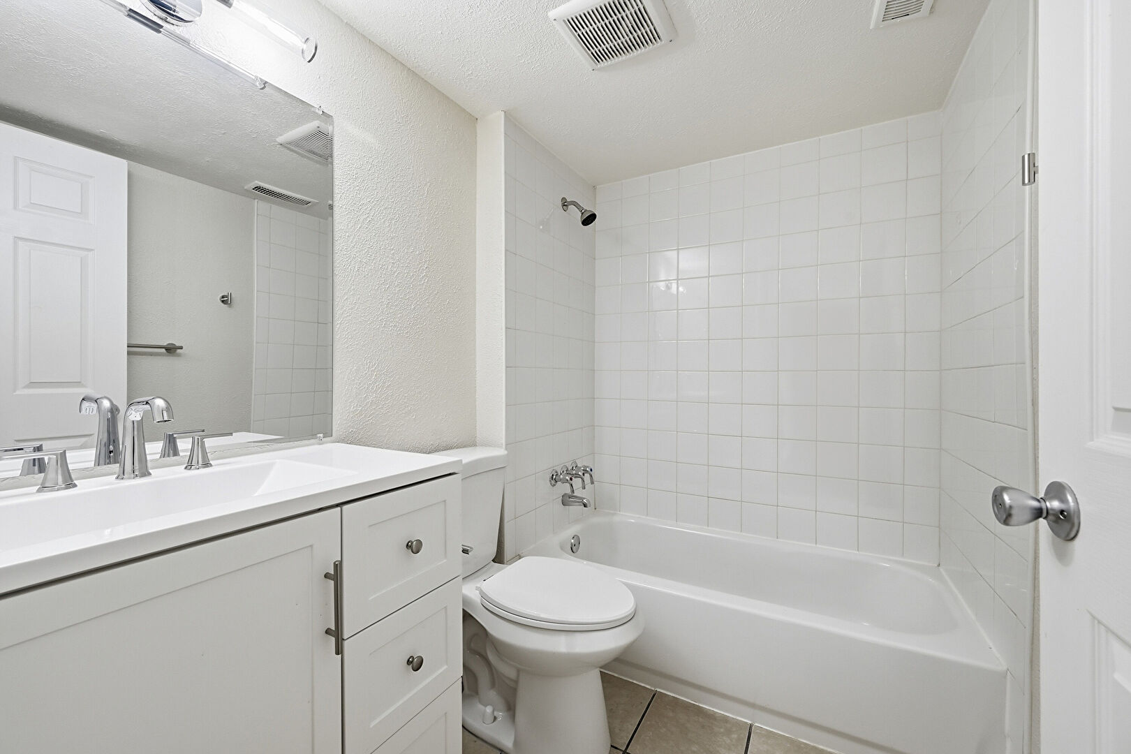 Baseboards Wall, Combined Bath Shower, Full Bathroom, Textured Wall, Tile Floor, Vanity, Vent, Half Bathroom, Textured Ceiling