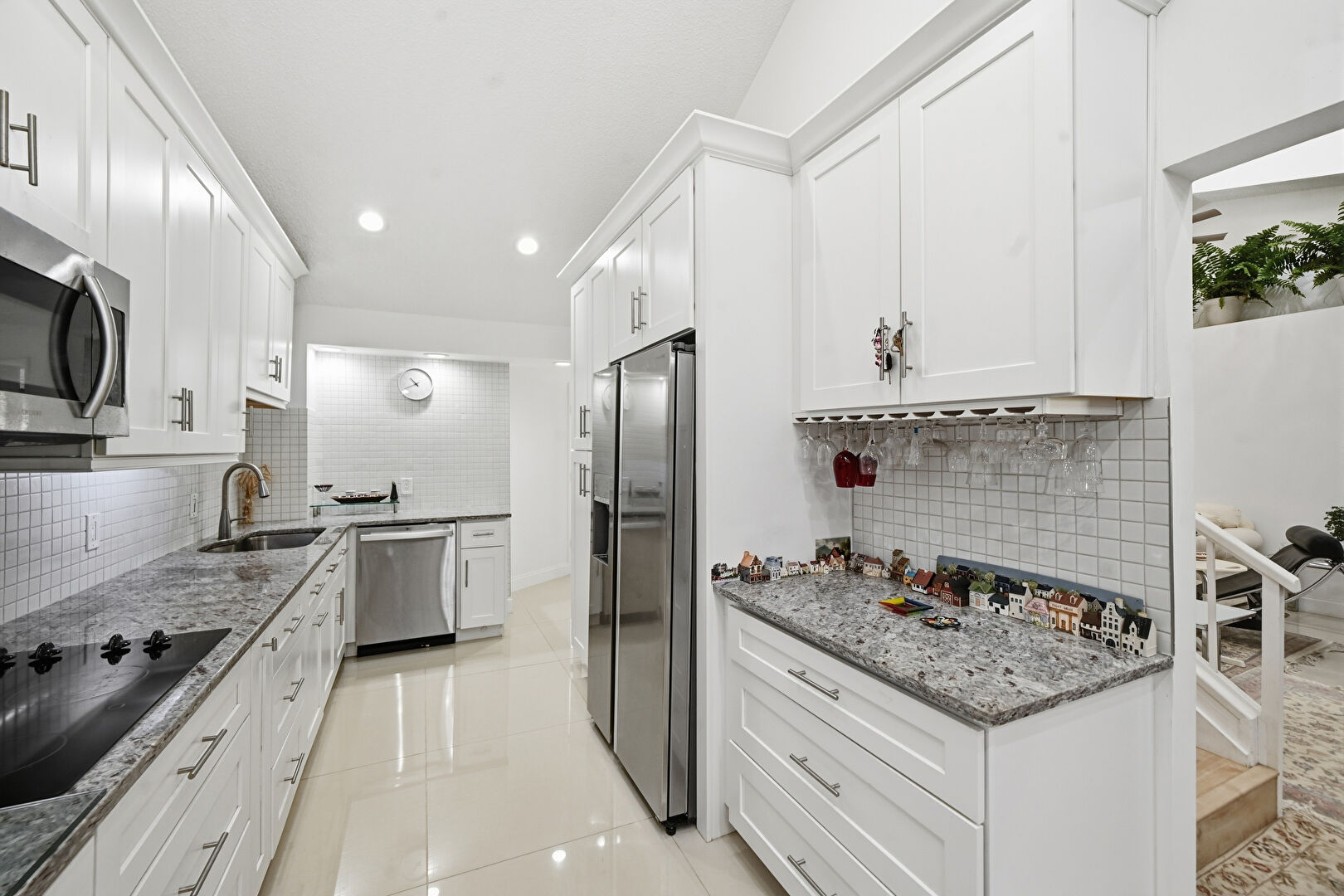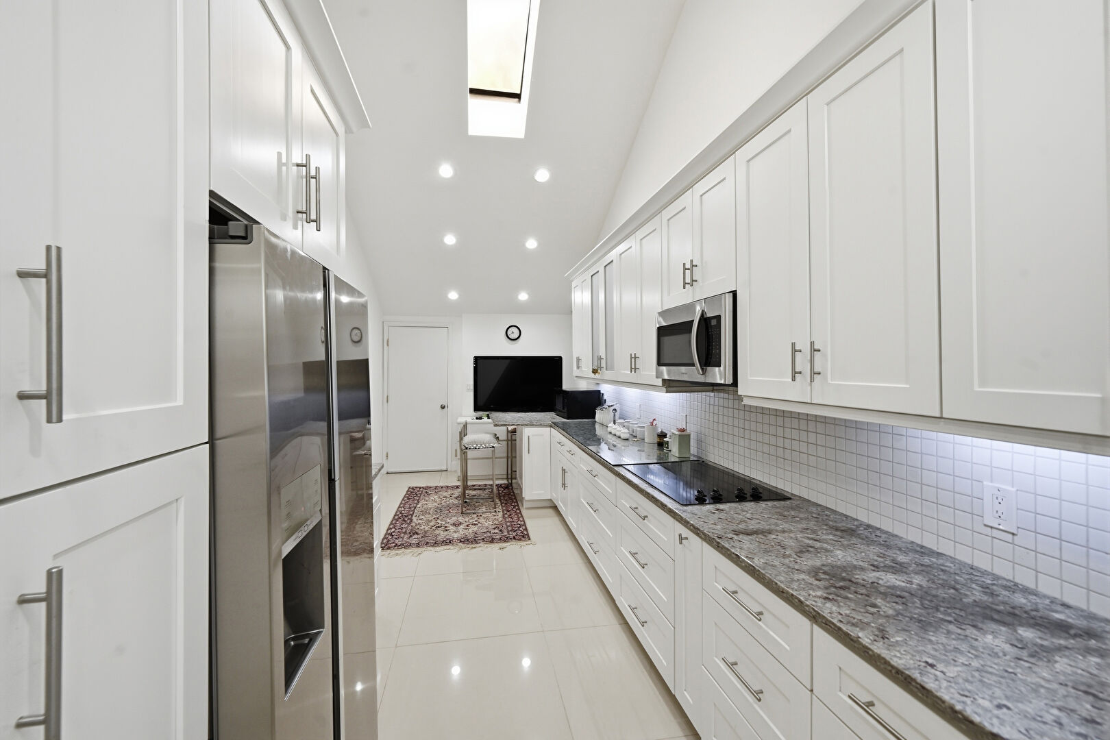Cathedral Ceiling, Crown Molding Cabinets, Drywall, G Shaped Kitchen, Glass Insert Cabinets, High Ceiling, Kitchen Bar, Kitchen Peninsula, Natural Light, Open Shelves, Recessed Lighting, Shaker Cabinets, Skylight, Stone Countertops, Tile Floor, Vaulted Ceiling, Vent, Baseboards Wall, Crown Molding Cabinets, Drywall, Recessed Lighting, Shaker Cabinets