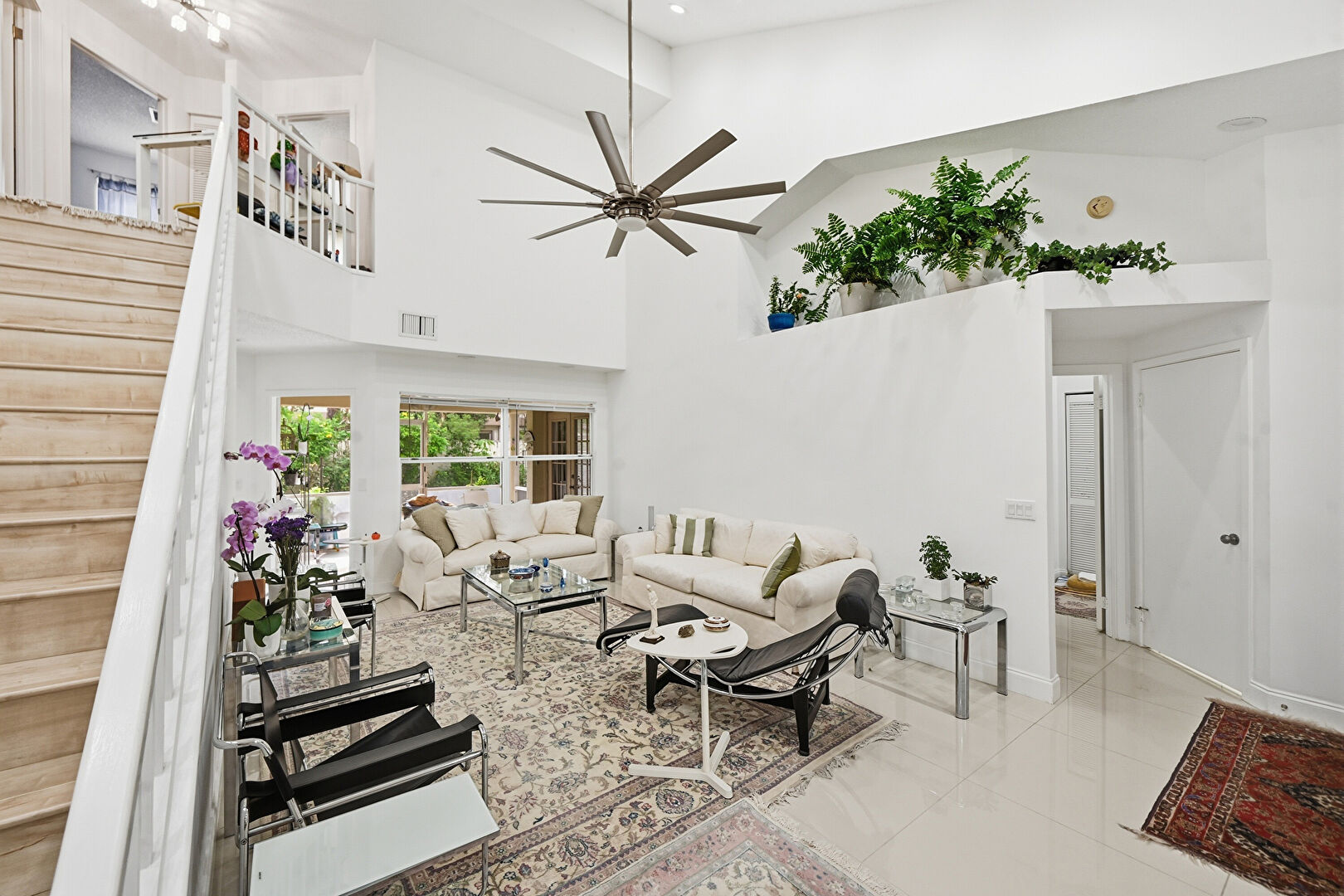 Baseboards Wall, Ceiling Fan, High Ceiling, Natural Light, Recessed Lighting, Skylight, Stairs, Tile Floor, Vaulted Ceiling, Vent, Drywall